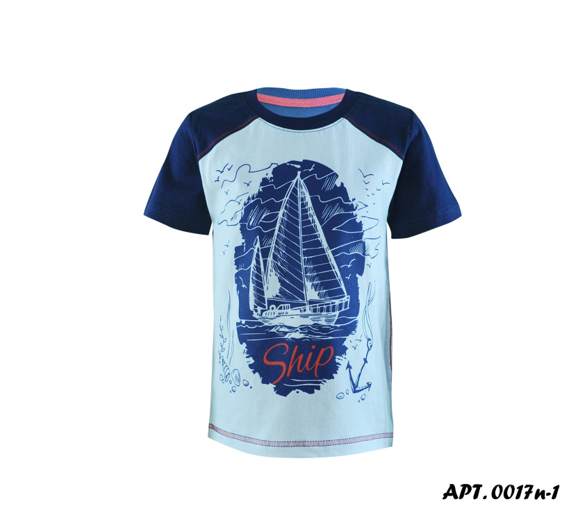 Фуфайка. Кулирное полотно, 100% х/б. Прямого силуэта, перед с фигурными кокетками и печатью. Рукав втачной, короткий. Горловина обработана ластиком.
