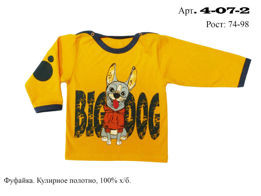 Фуфайка. Кулирное полотно, 100% х/б. Прямого силуэта, перед и рукава с печатью. Рукав втачной, длинный, внизу окантован. Горловина окантована с кнопками по плечевым швам.