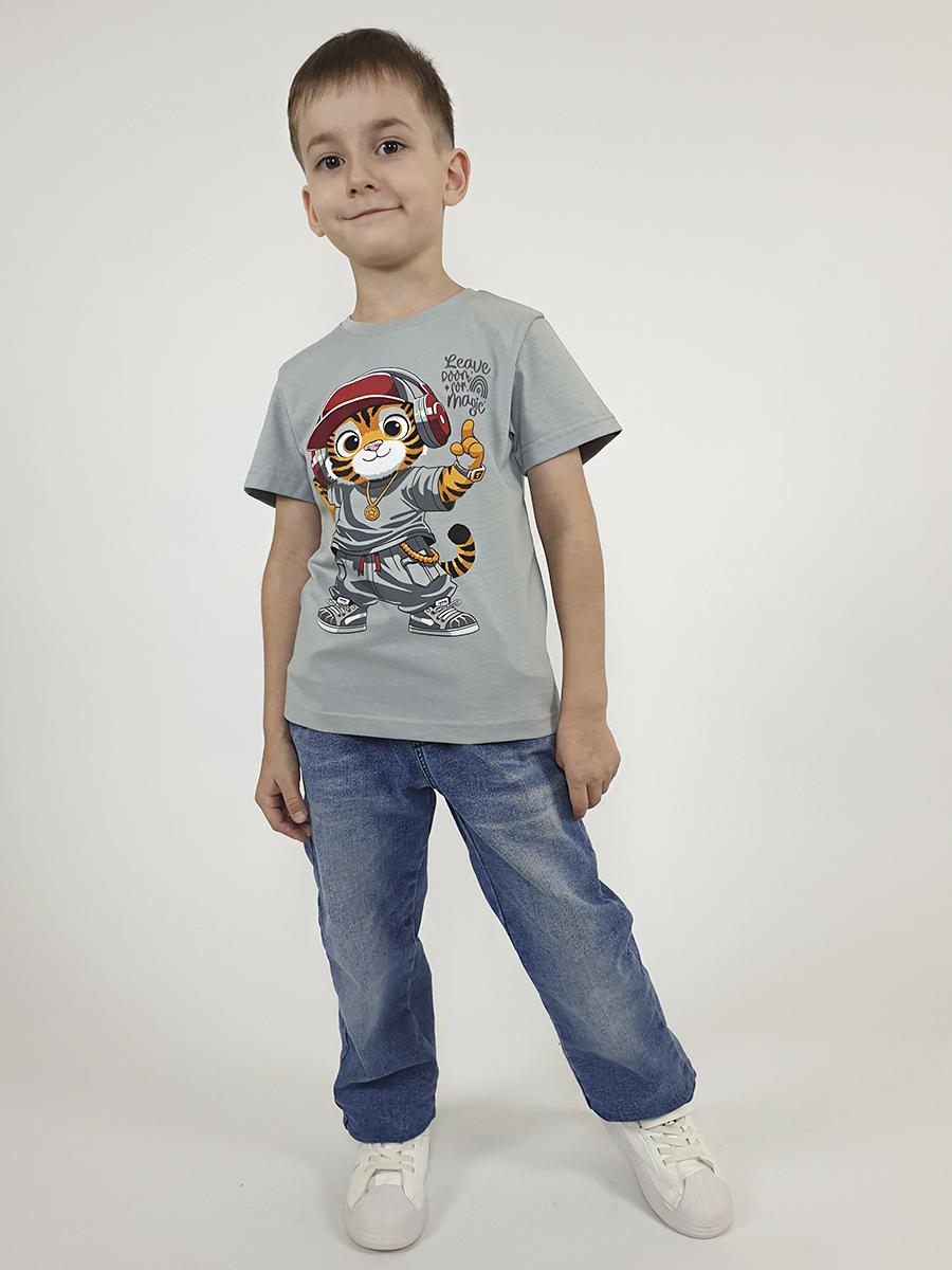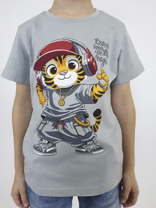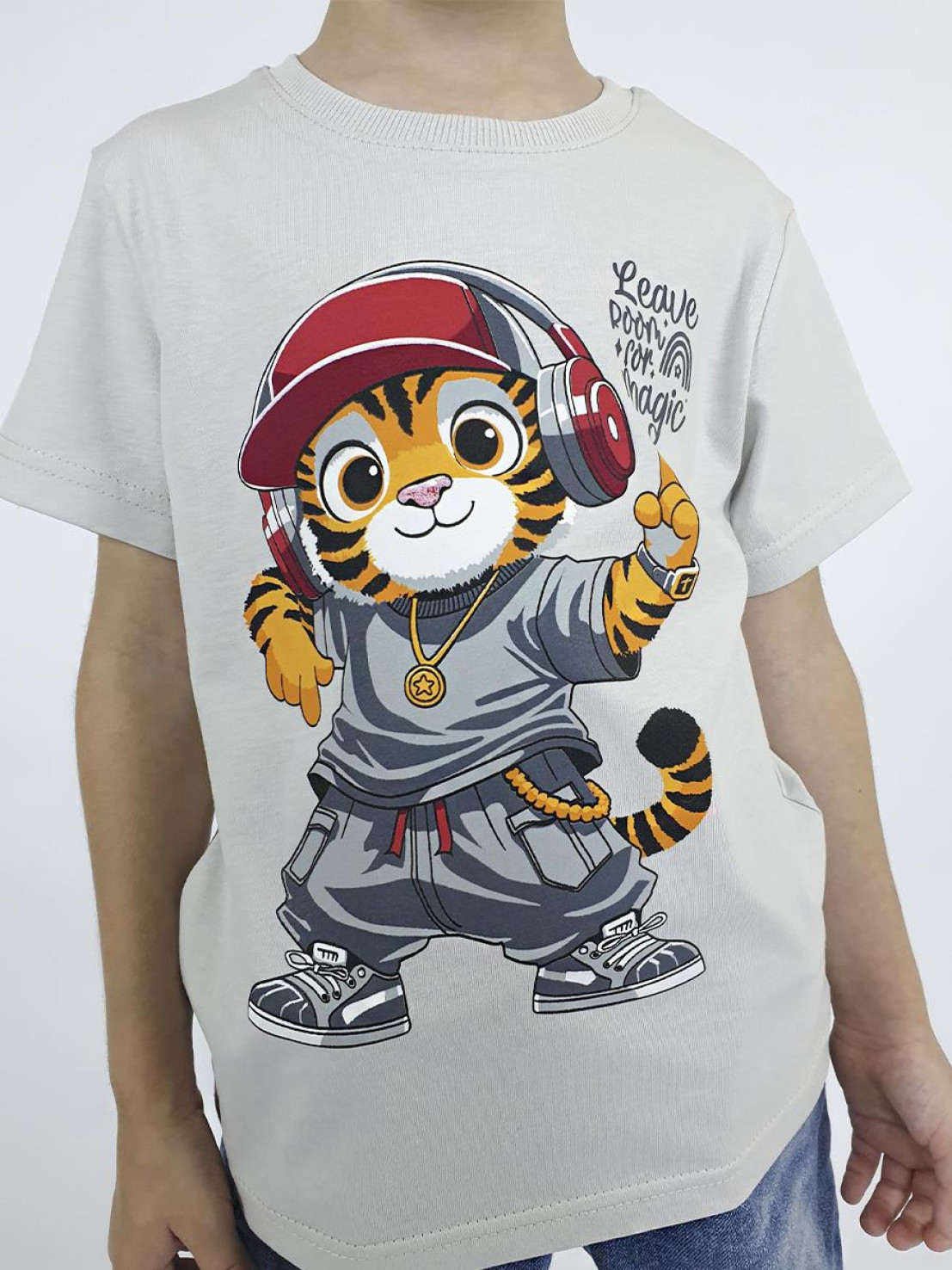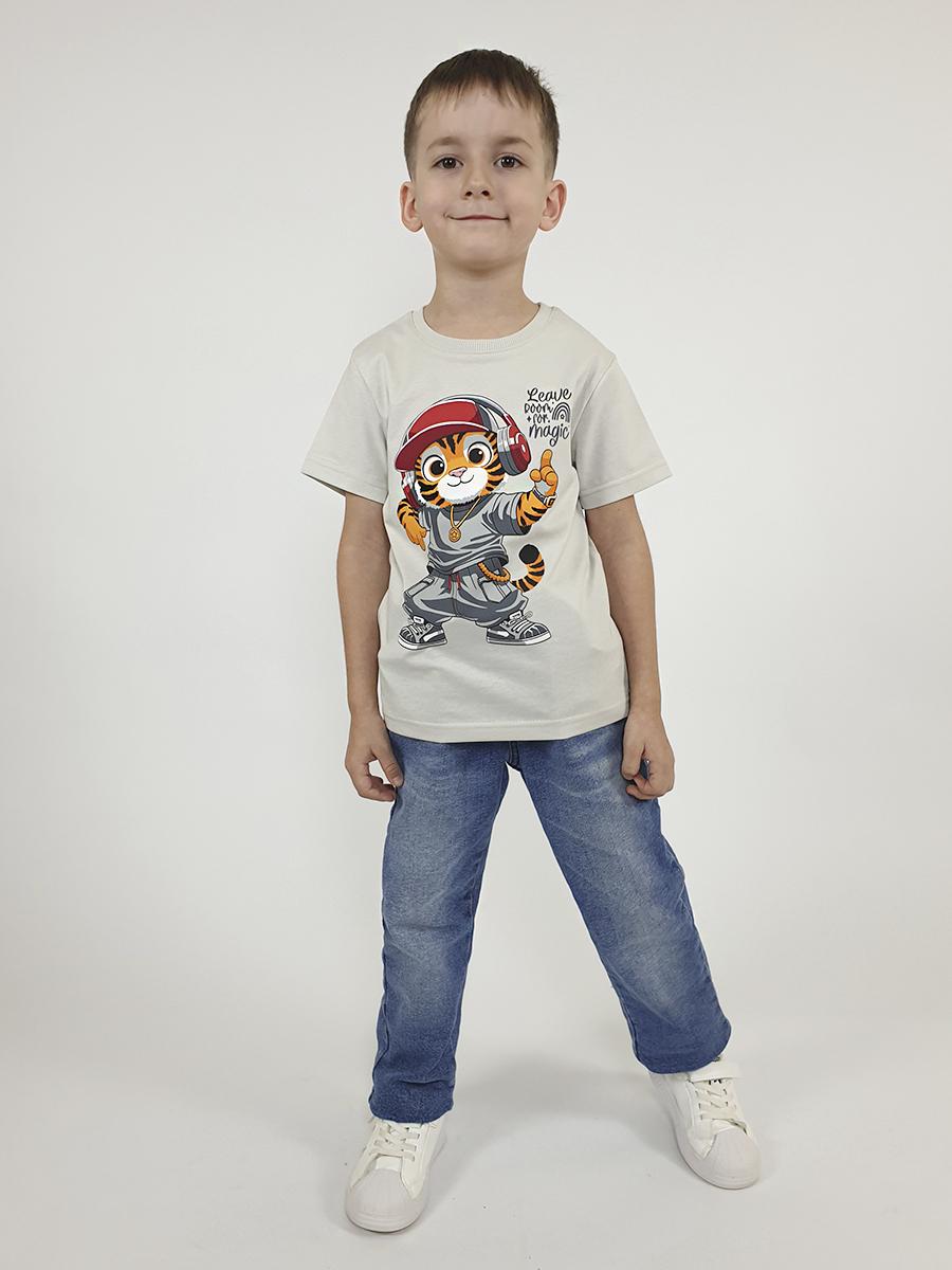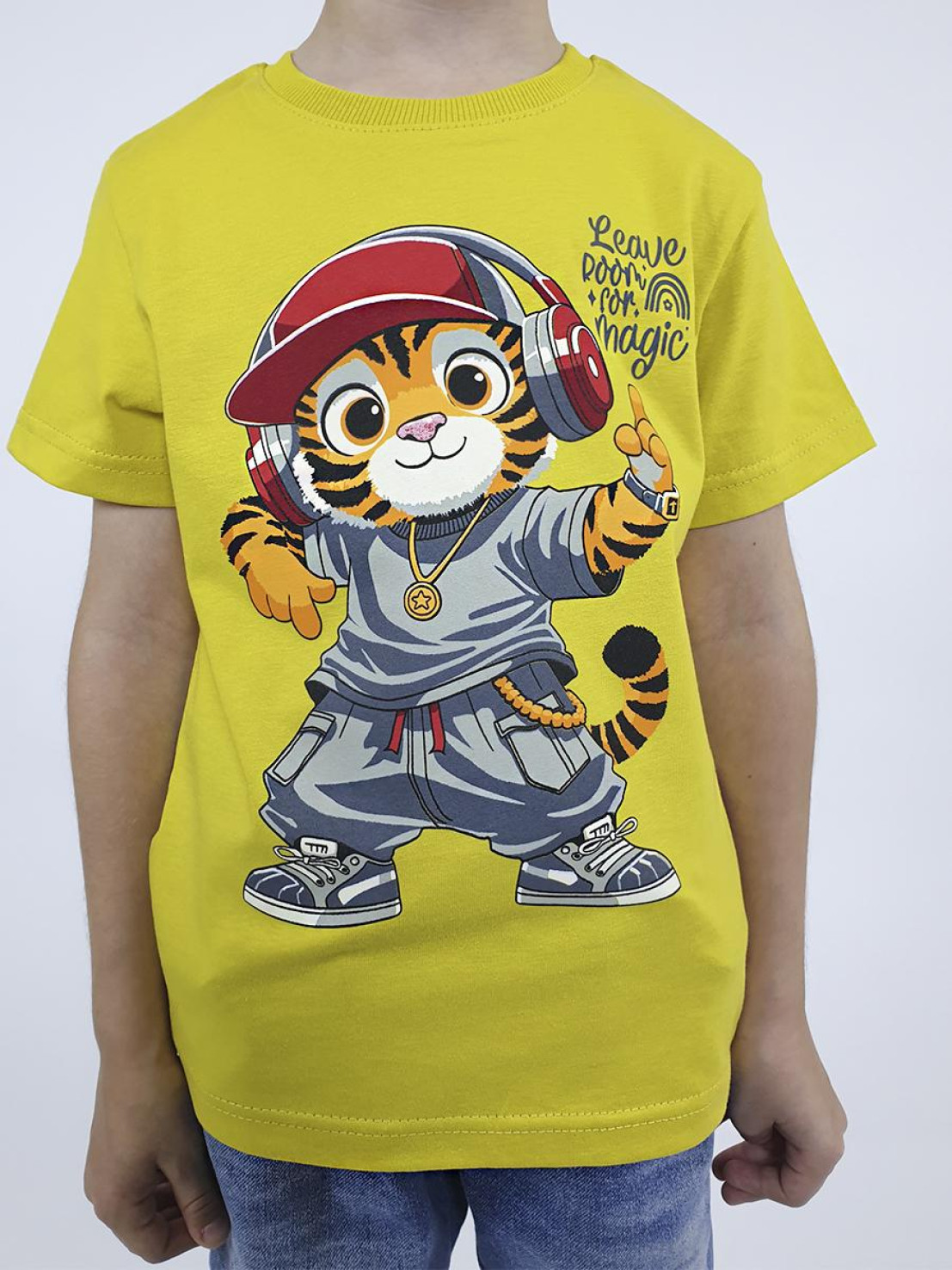Кулирное полотно:100% х/б. Фуфайка-прямой силуэт,короткий втачной рукав.Горловина обработана ластиком.Печать на переде.