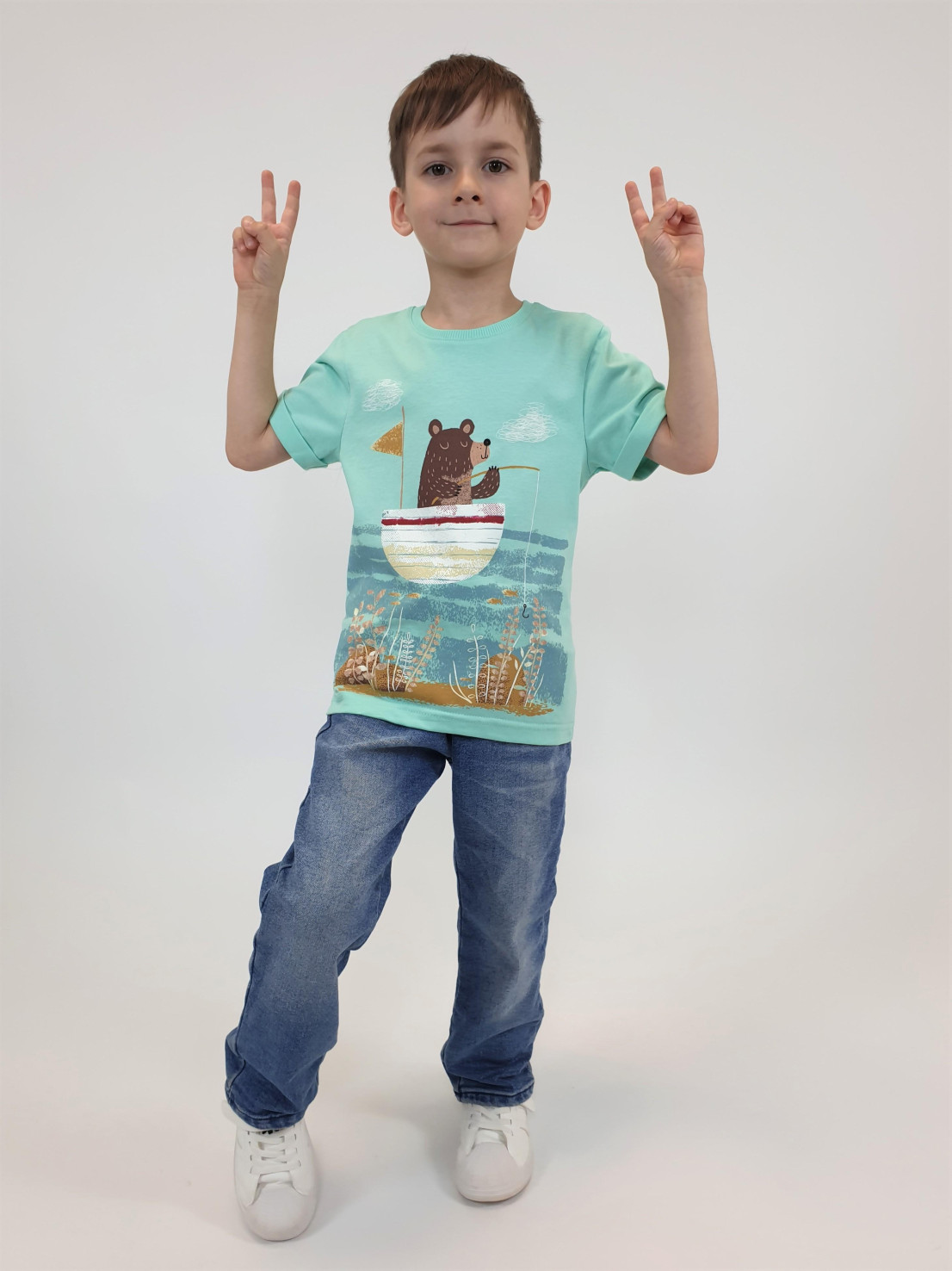 Кулирное полотно:100% х/б. Фуфайка-прямой силуэт,короткий втачной рукав с отворотом.Горловина обработана ластиком.Печать на переде и спинке.