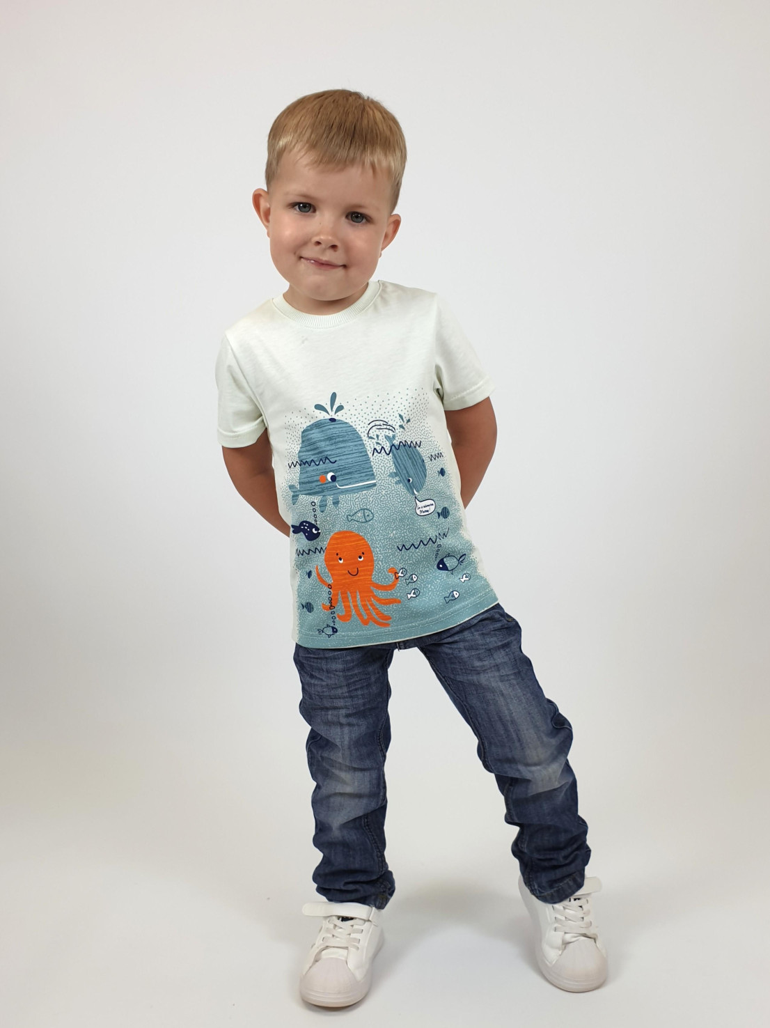 Кулирное полотно:100% х/б. Фуфайка-прямой силуэт,короткий втачной рукав.Горловина обработана ластиком.Печать на переде.