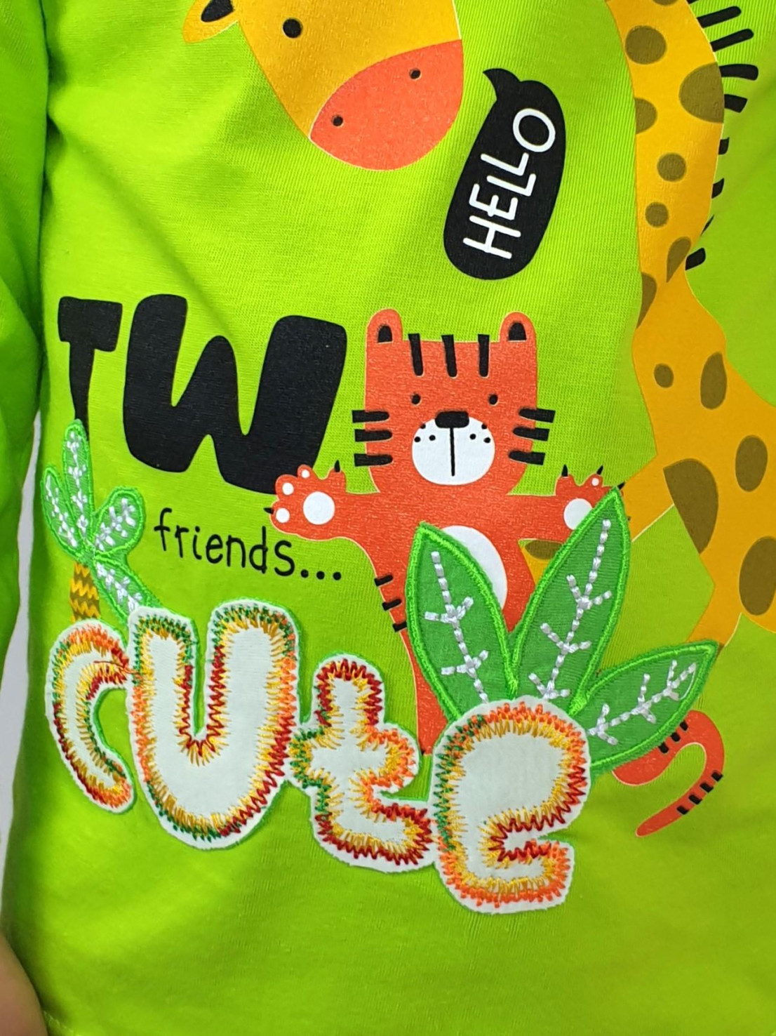 Кулирное полотно:100% х/б. Фуфайка-прямой силуэт,длинный втачной рукав.Горловина обработана ластиком.Печать и вышивка(аппликация) на переде.
