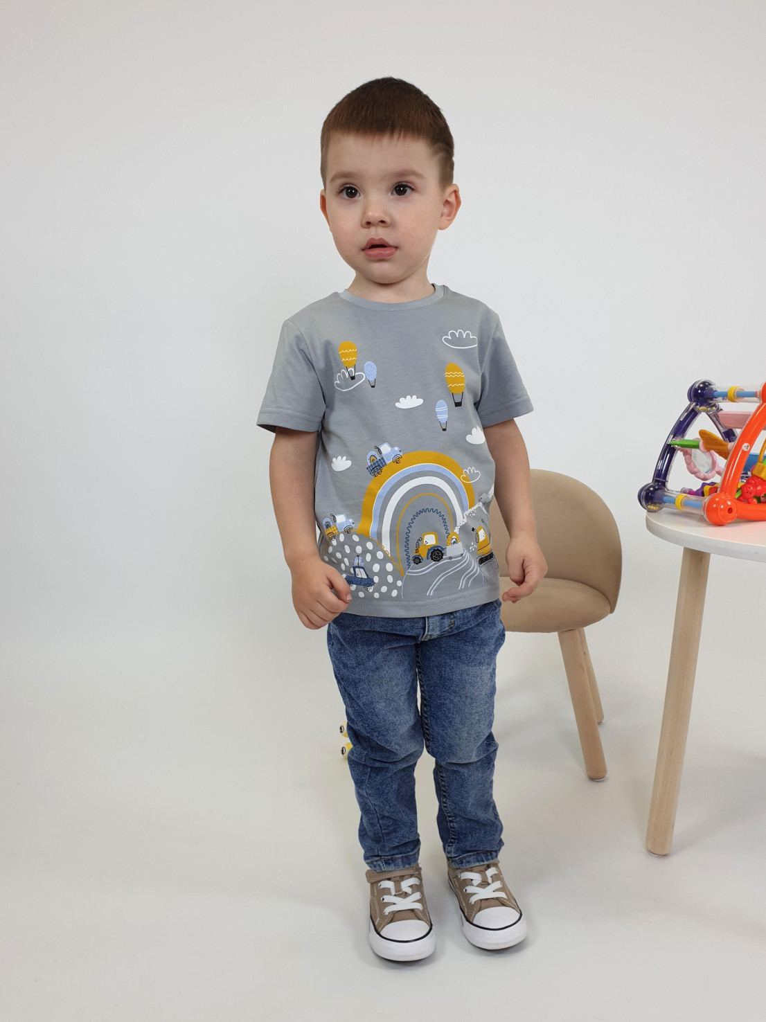 Кулирное полотно:100% х/б. Фуфайка-прямой силуэт,короткий втачной рукав.Горловина обработана ластиком.Печать на переде.