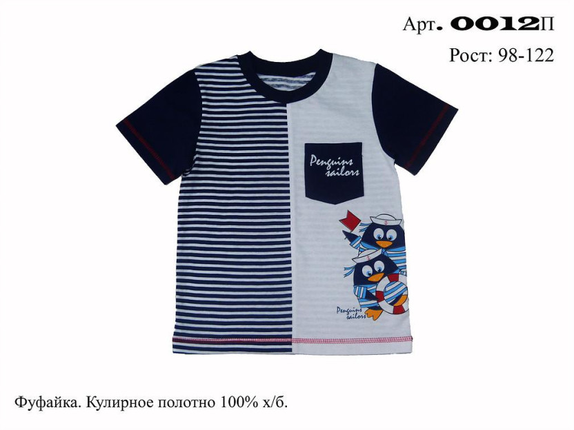 Фуфайка. Кулирное полотно, 100% х/б. Прямого силуэта. Рукав втачной, короткий. Горловина обработана ластиком. Полочка состоит из двух частей. На левой части печать и отделочный карман с печатью.