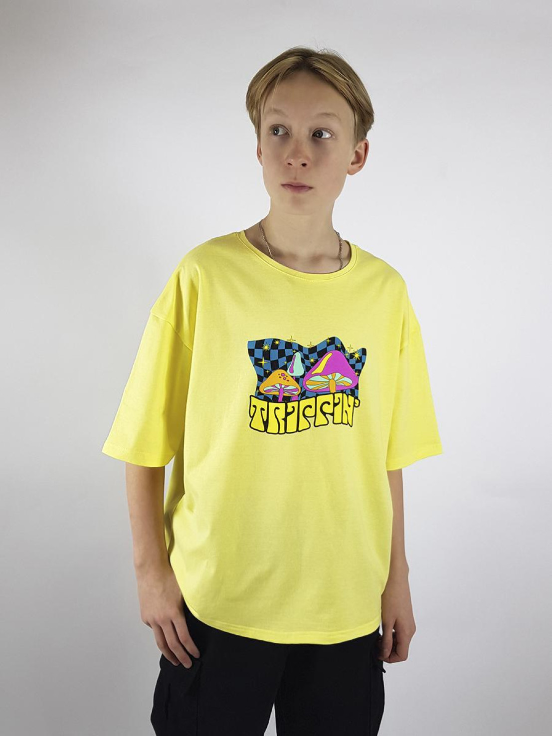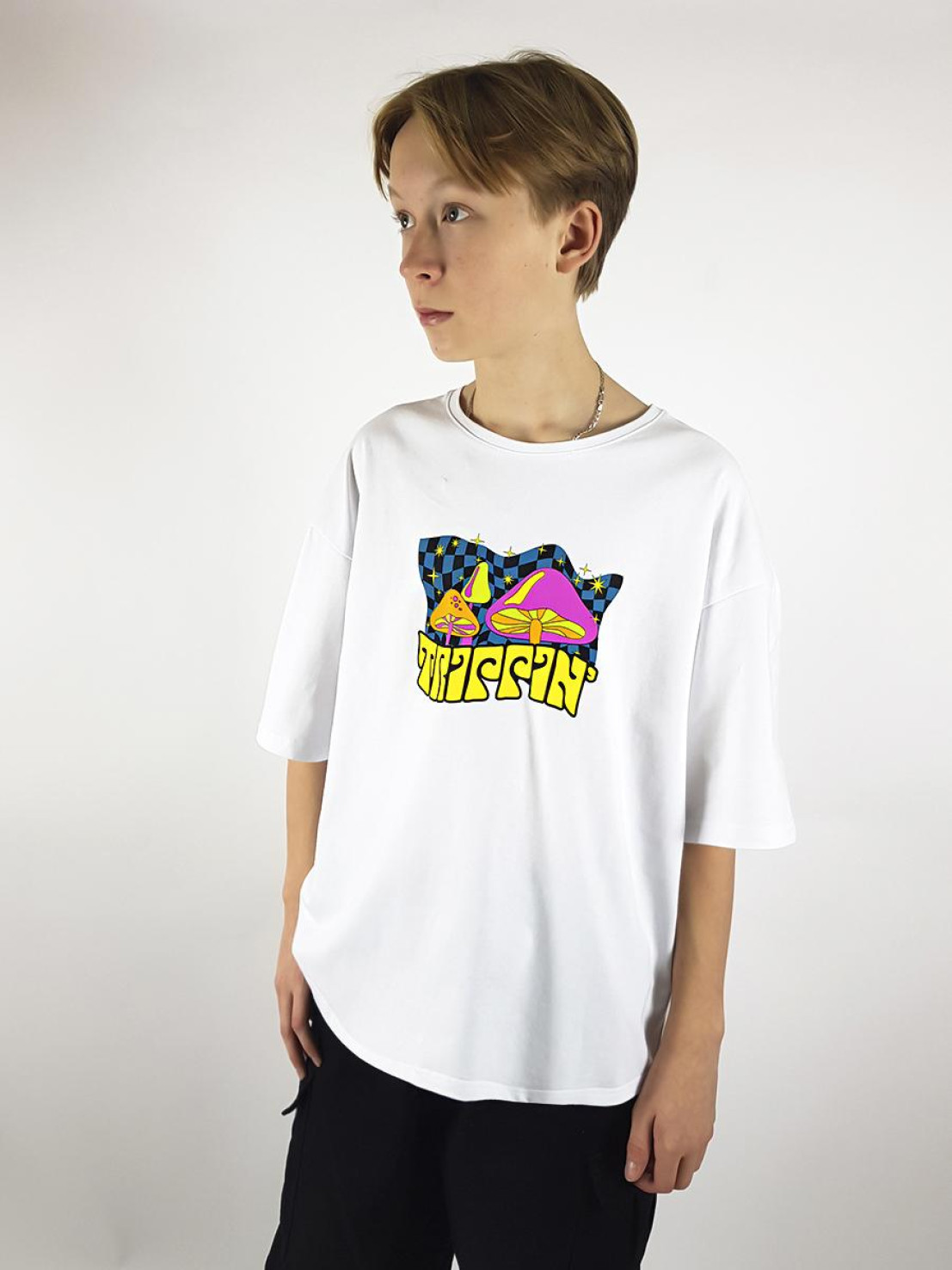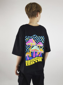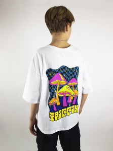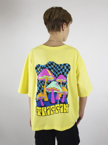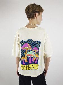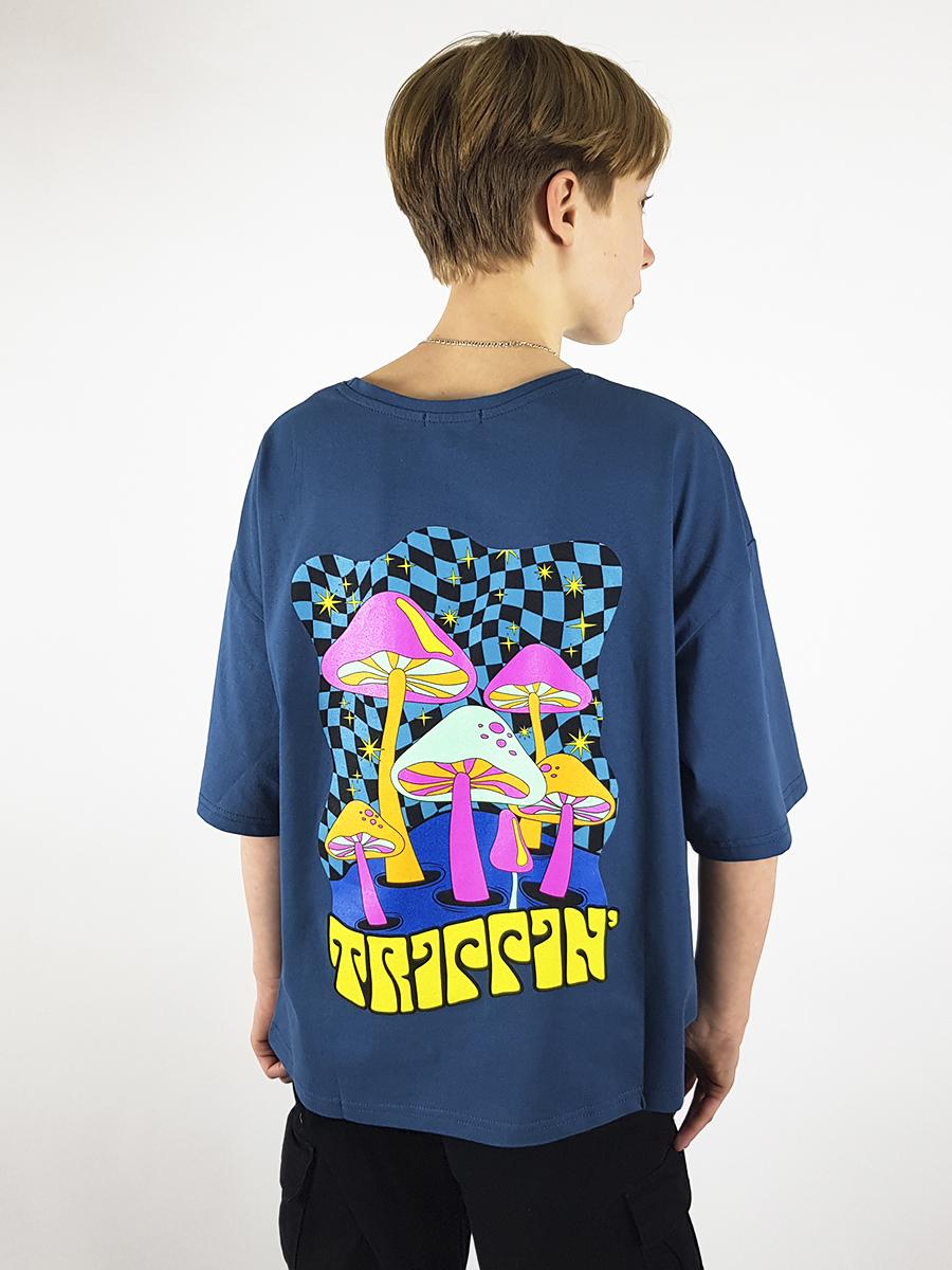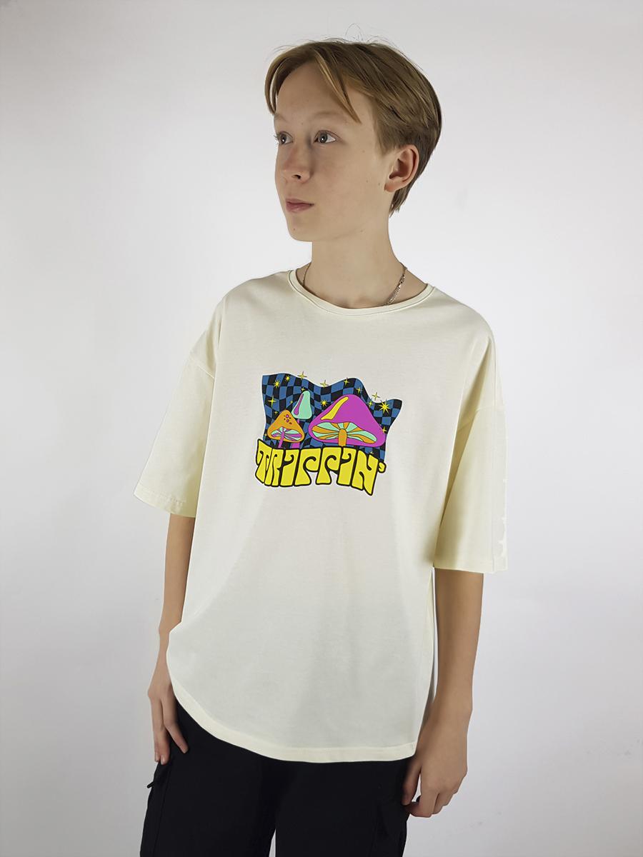 Кулирное полотно: 100% х/б. Футболка-прямой силуэт,спущенное плечо,короткий рукав,перед и спинка с печатью.Горловина обработана планкой.Низ изделия и рукава подшиты.