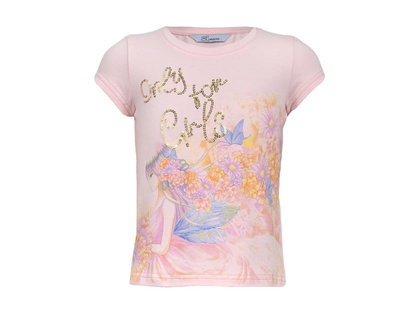Футболка для девочки полуприлегающего силуэта изготовлена из кулирного полотна (95% хлопок ,5% лайкра) . Изящный принт с вышивкой точно понравится юным модницам. Ткань изделия мягкая, дышащая и приятная к телу.