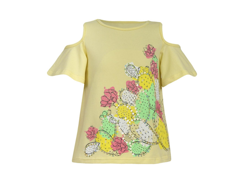 Футболка для девочки - силуэт трапеция изготовлена из кулирного полотна (95 % хлопок, 5% лайкра.) Изящный принт с вышивкой - пайетки точно понравится юным модницам. Рукав с декоративным вырезом на плече. Материал легкий, приятный на ощупь, устойчивый к частым стиркам.