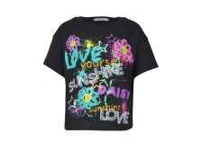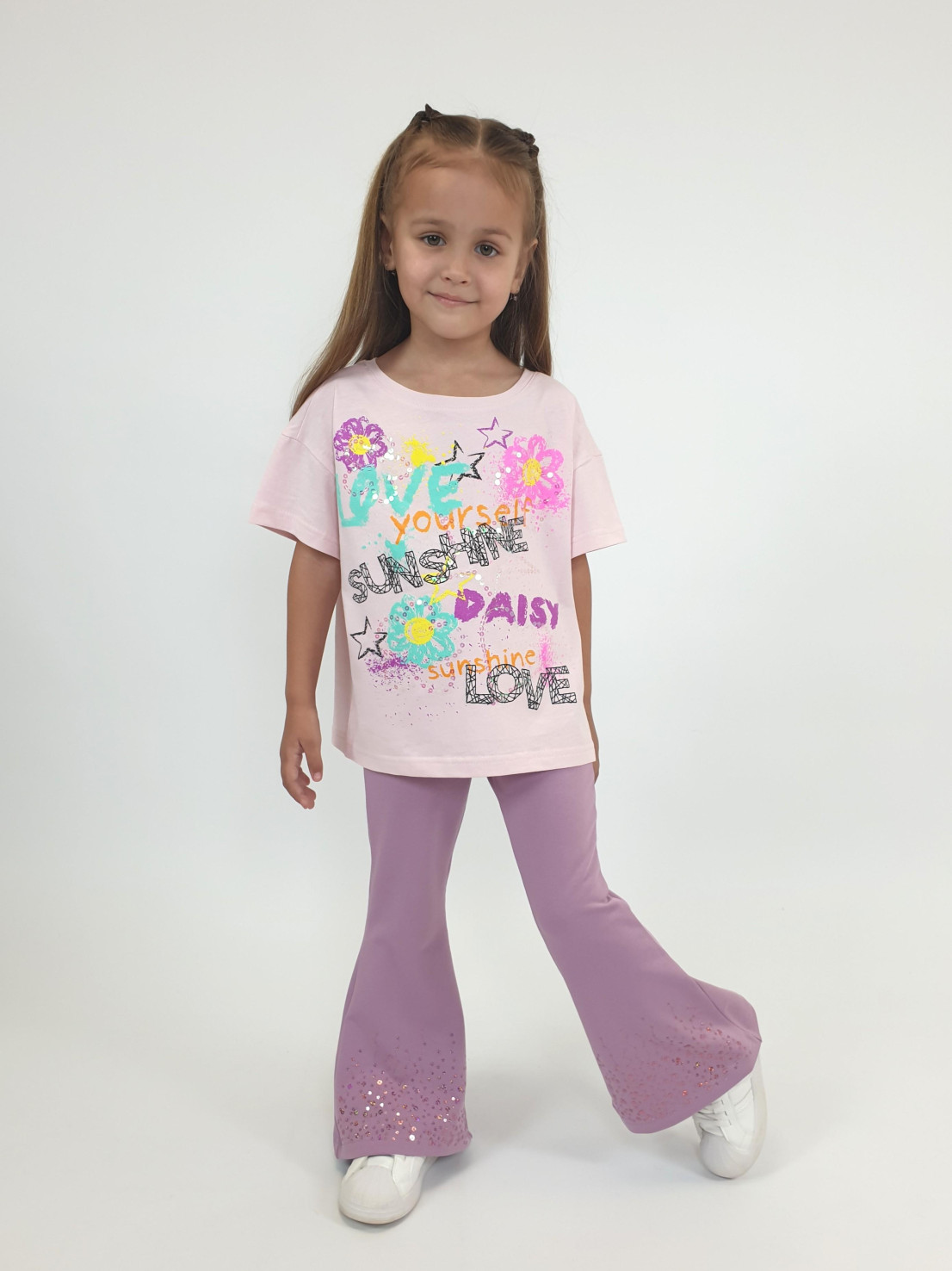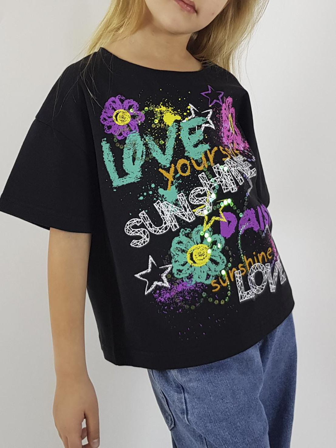 Кулирное полотно:100% х/б. Футболка(оверсайз)-прямой силуэт,спущенное плечо,короткий рукав,перед с печатью и вышивкой(пайетки).Горловина обработана притачной планкой.Низ изделия и рукава подшиты.