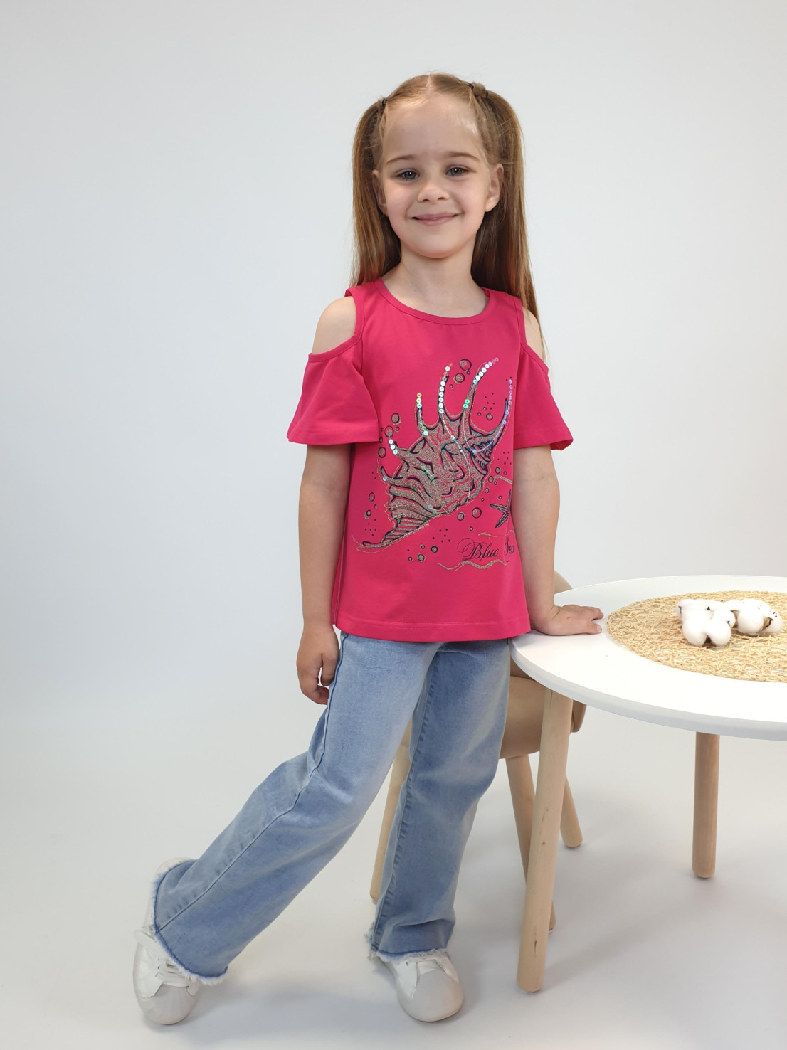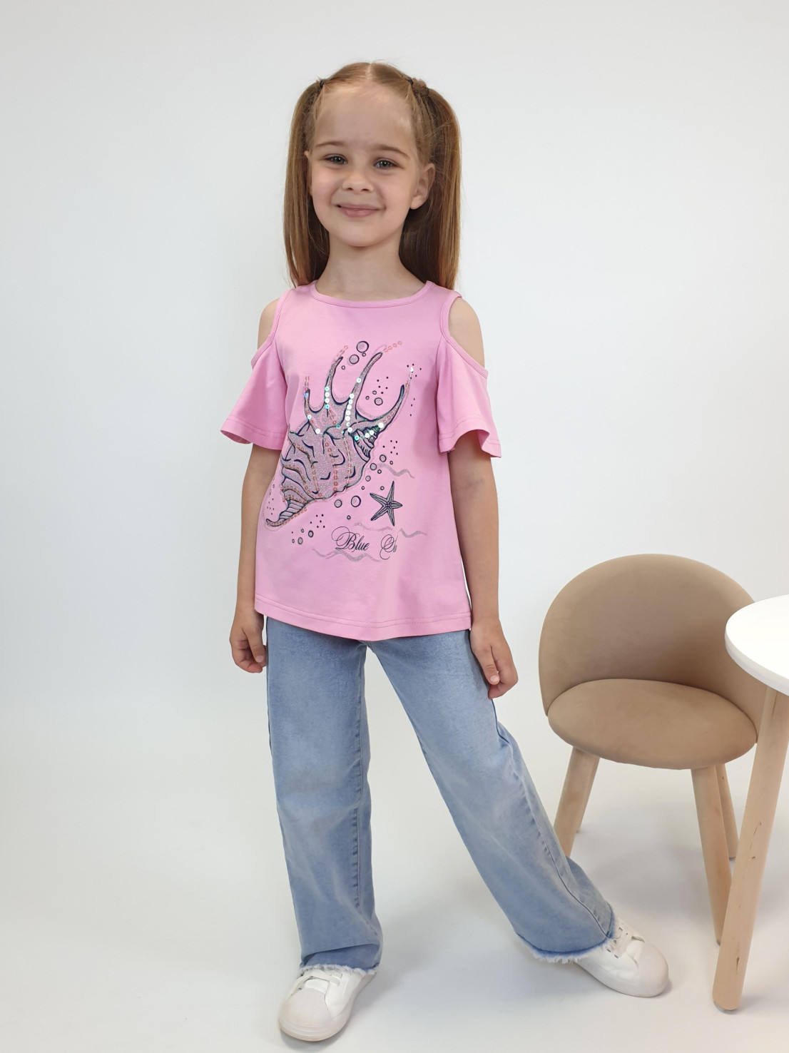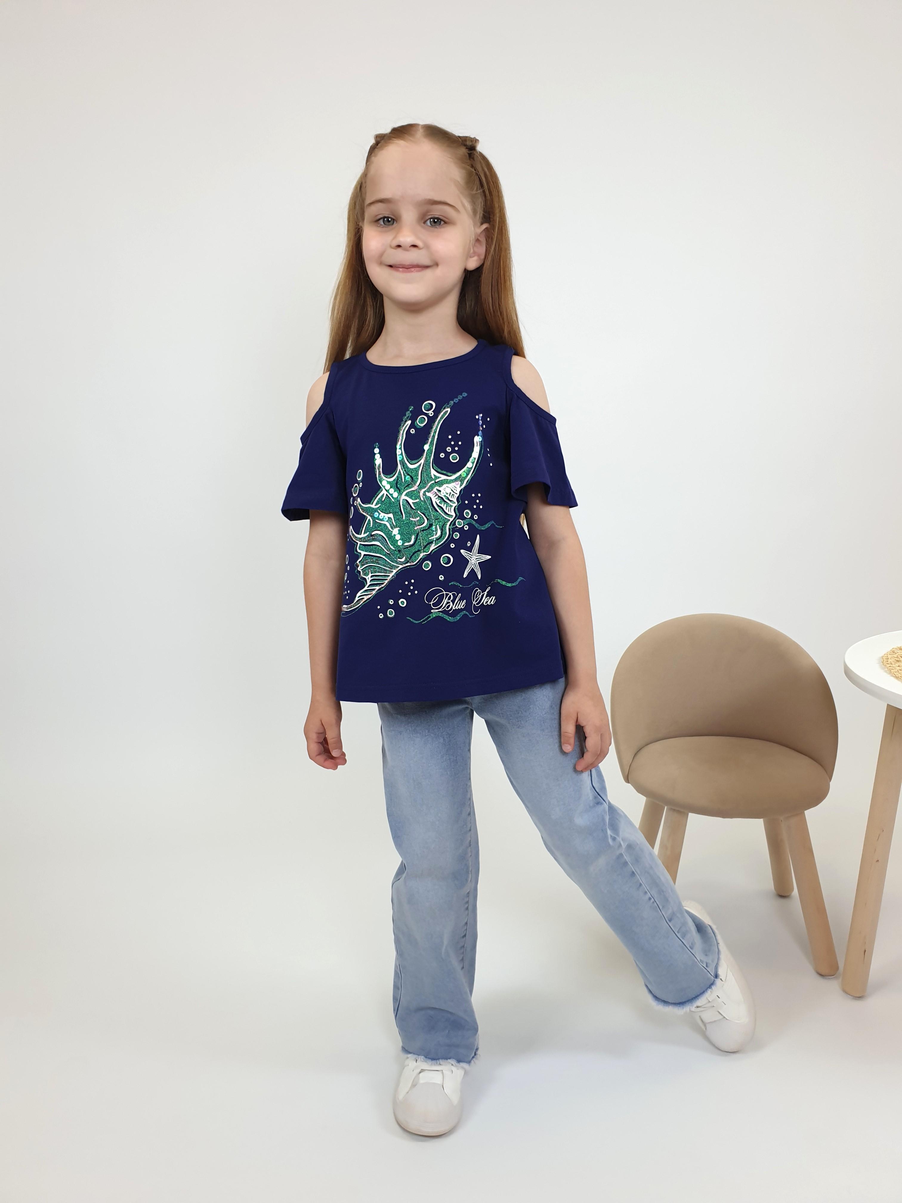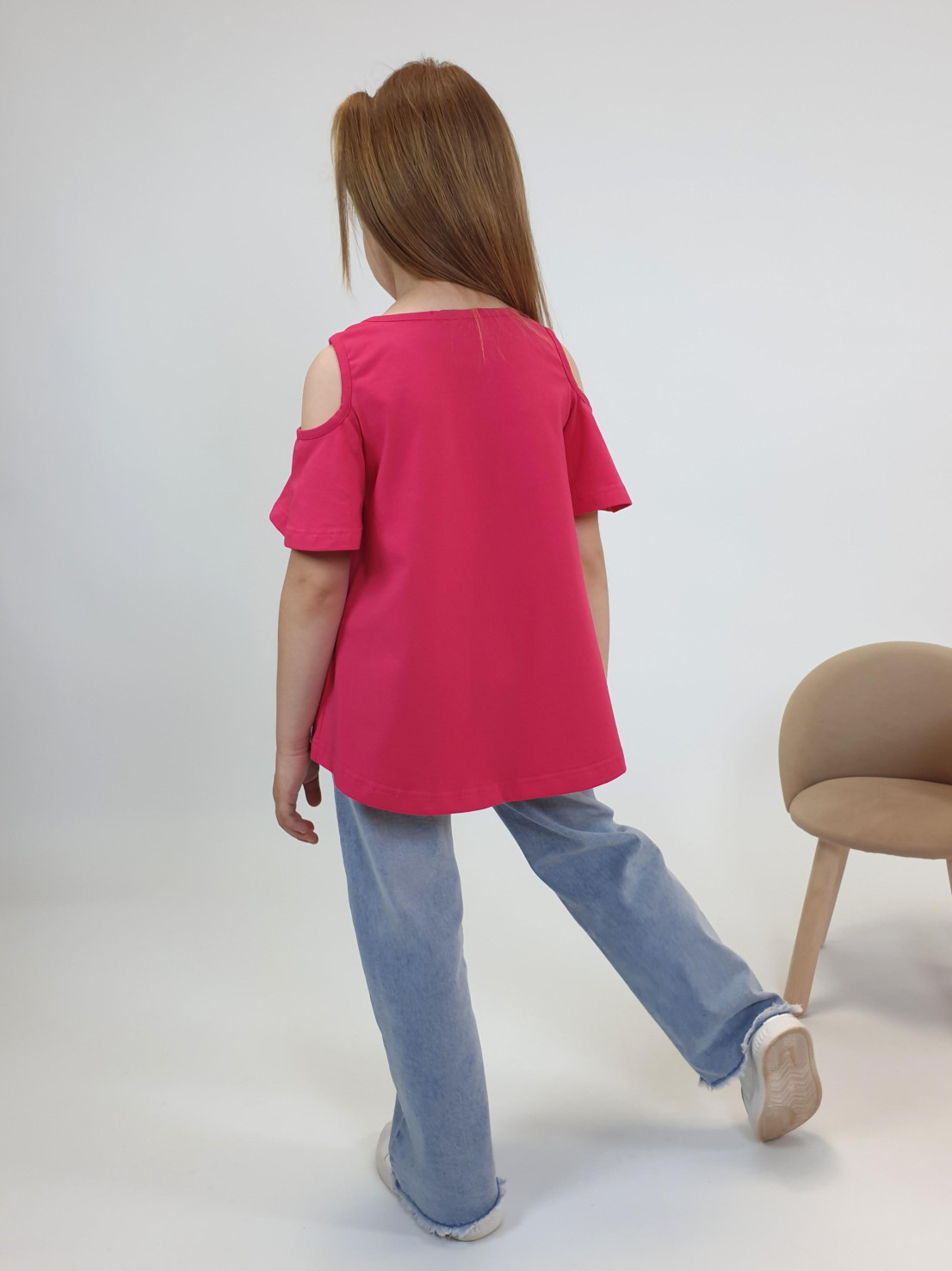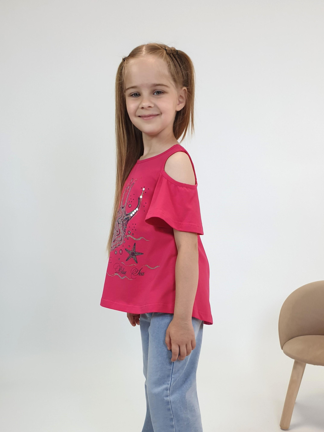Футболка для девочки силуэт трапеция, изготовлена из кулирного полотна (95 % хлопок, 5% лайкра). Стильная модель с открытыми плечами. Оригинальный принт с вышивкой (пайетки) точно понравится юным модницам. Ткань изделия мягкая, дышащая и приятная к телу.