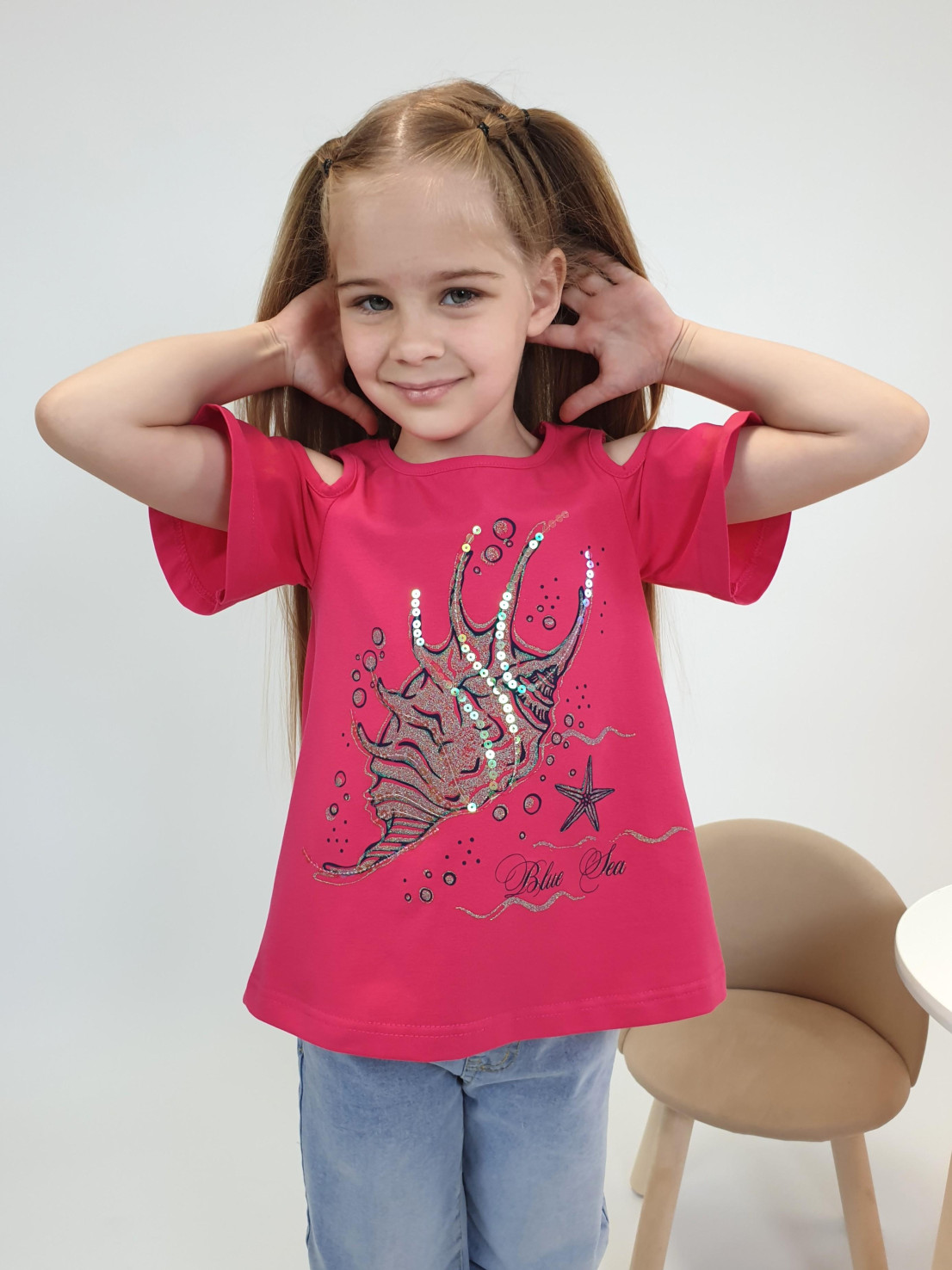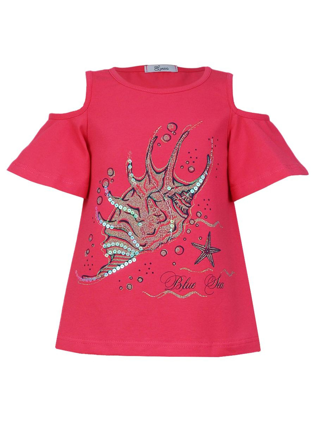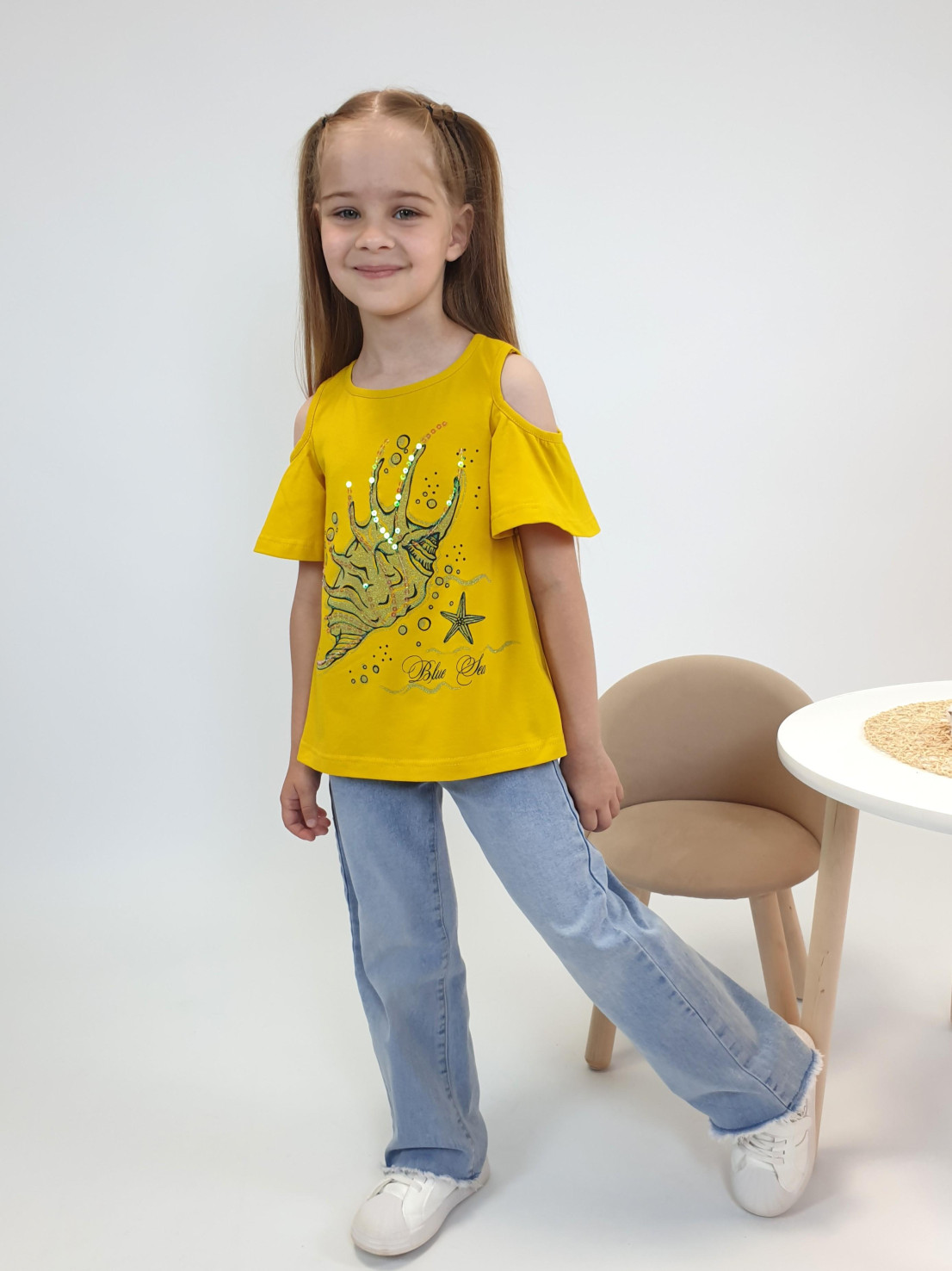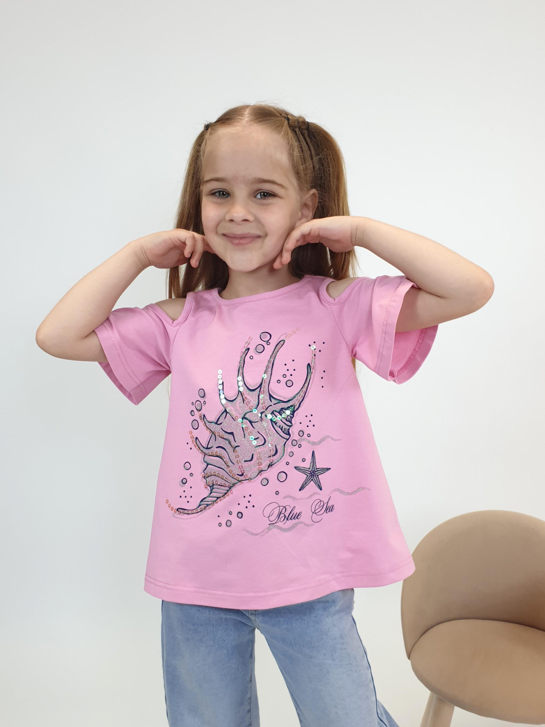 Футболка для девочки силуэт трапеция, изготовлена из кулирного полотна (95 % хлопок, 5% лайкра). Стильная модель с открытыми плечами. Оригинальный принт с вышивкой (пайетки) точно понравится юным модницам. Ткань изделия мягкая, дышащая и приятная к телу.