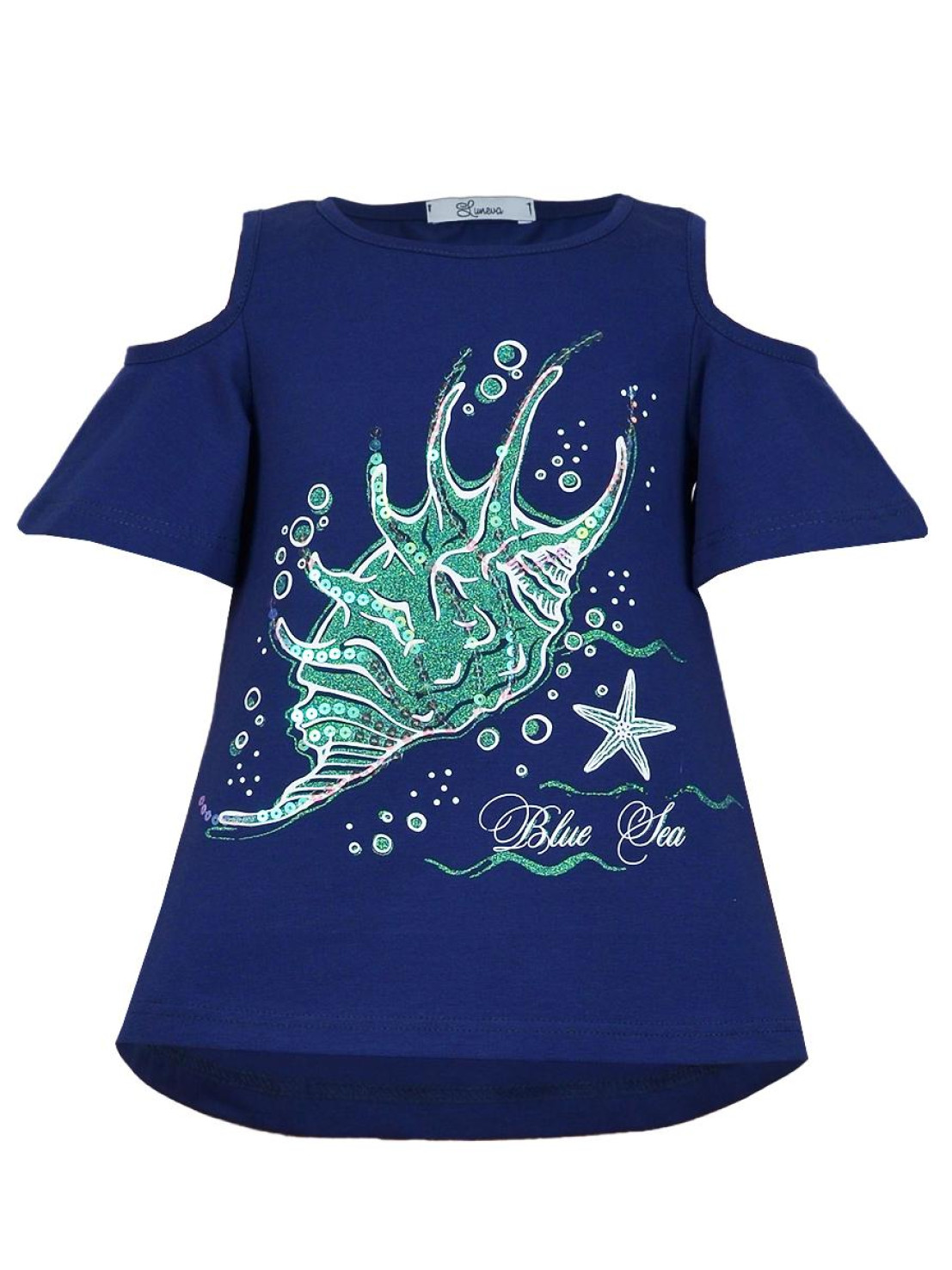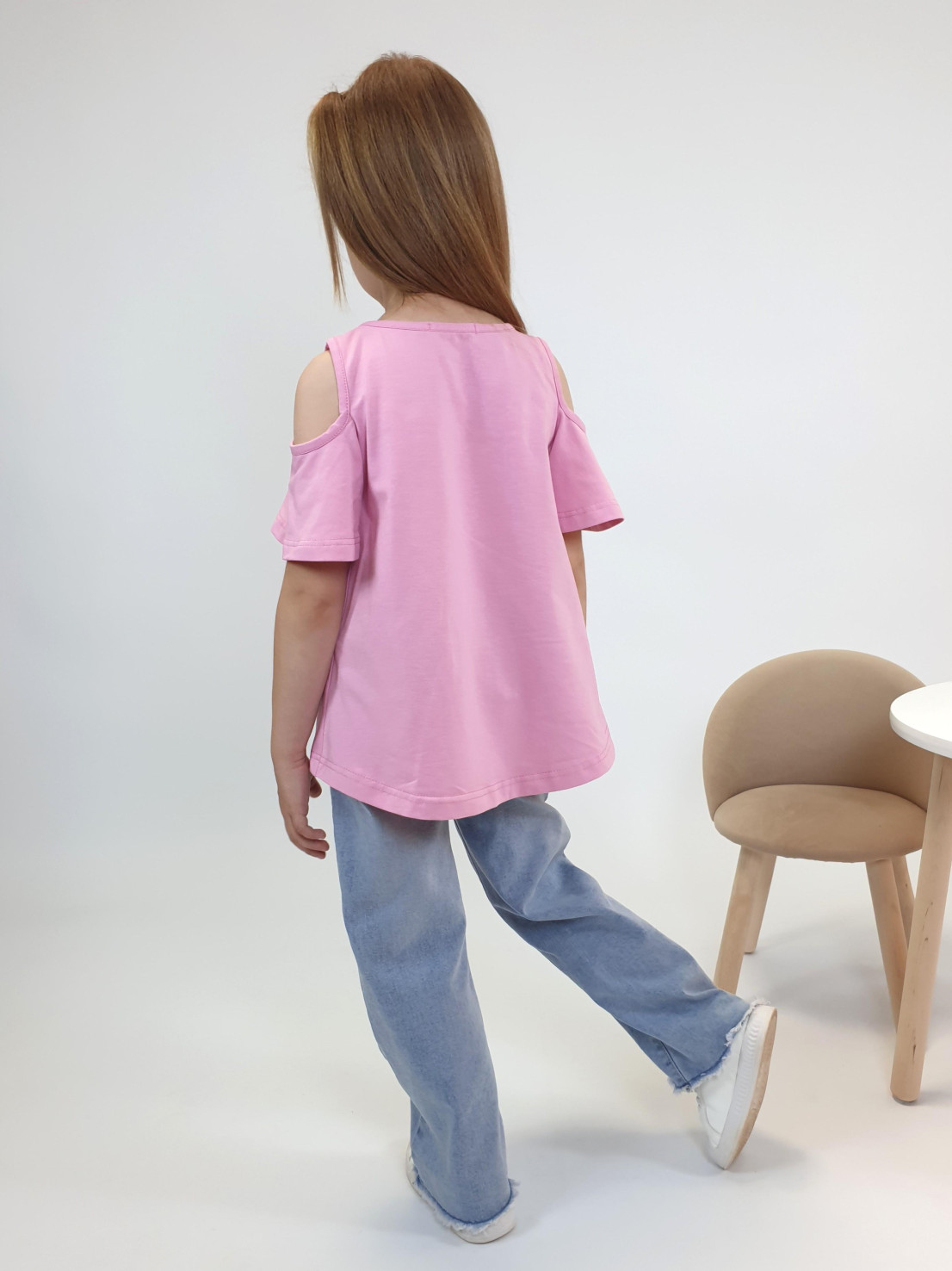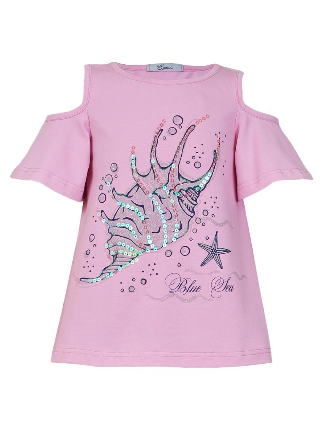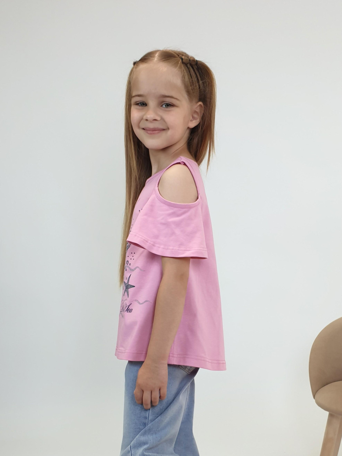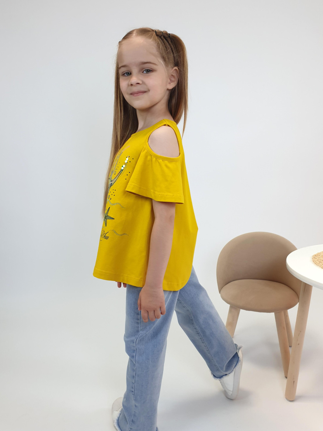 Футболка для девочки силуэт трапеция, изготовлена из кулирного полотна (95 % хлопок, 5% лайкра). Стильная модель с открытыми плечами. Оригинальный принт с вышивкой (пайетки) точно понравится юным модницам. Ткань изделия мягкая, дышащая и приятная к телу.