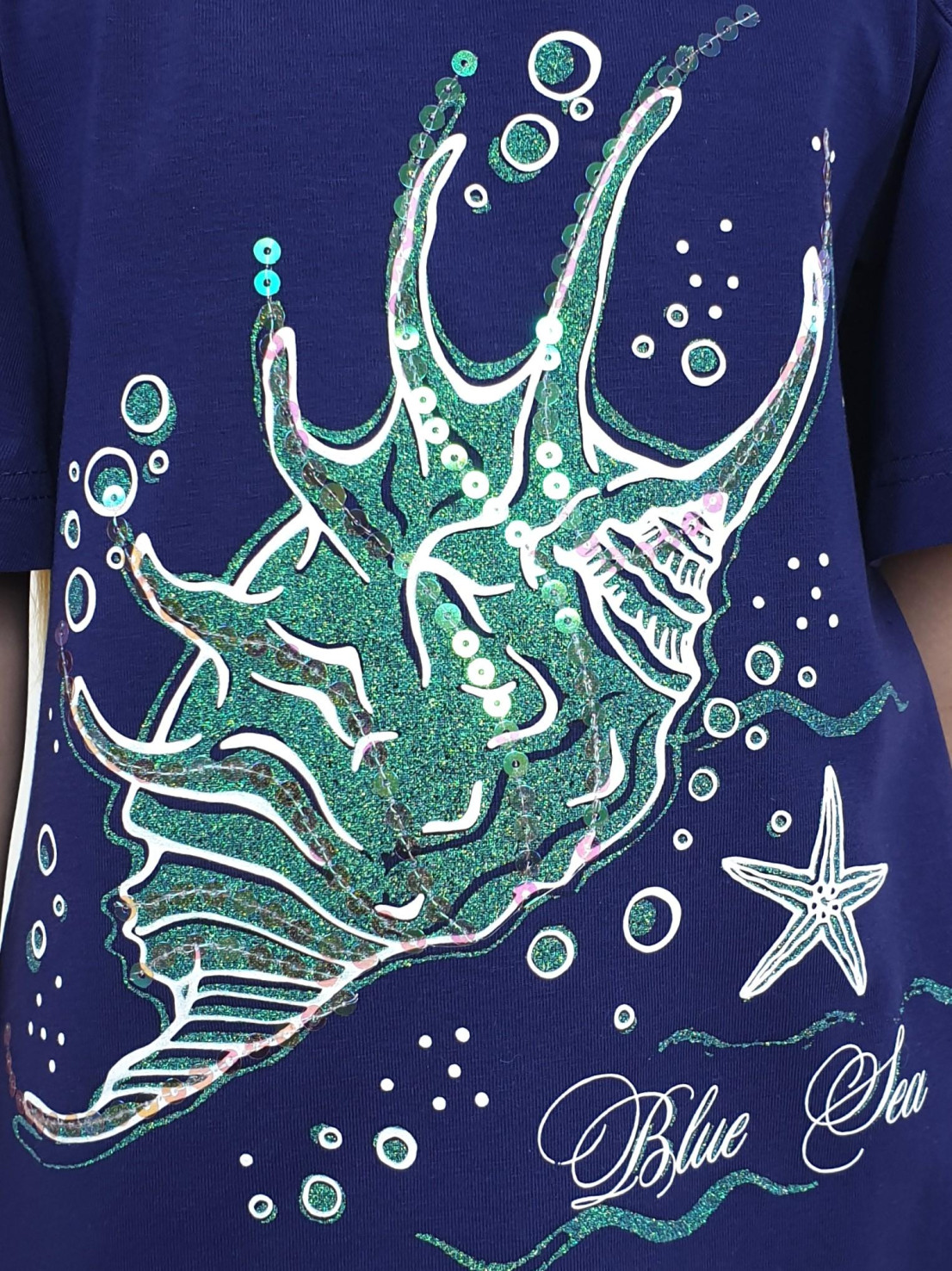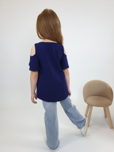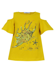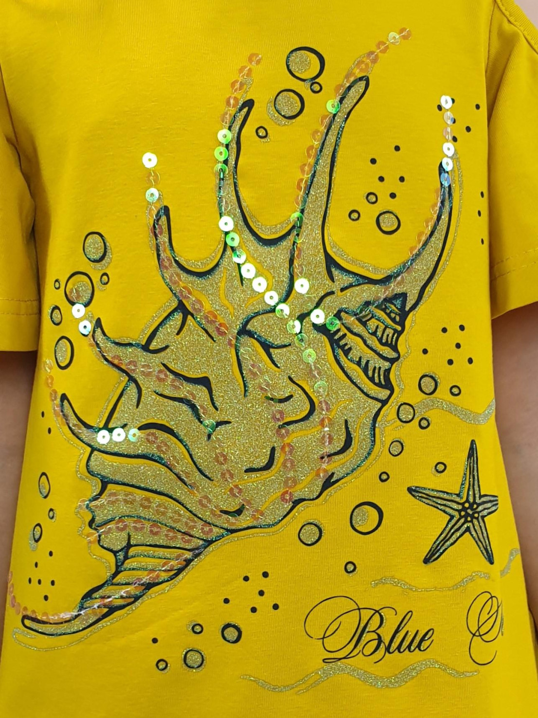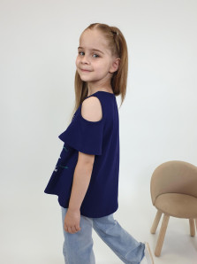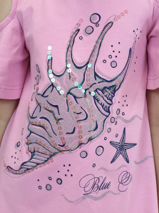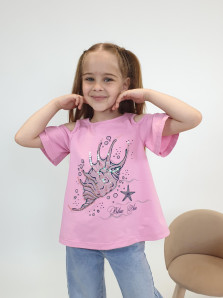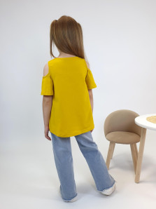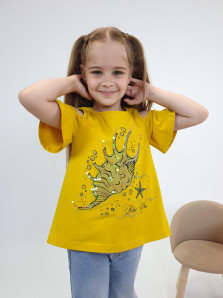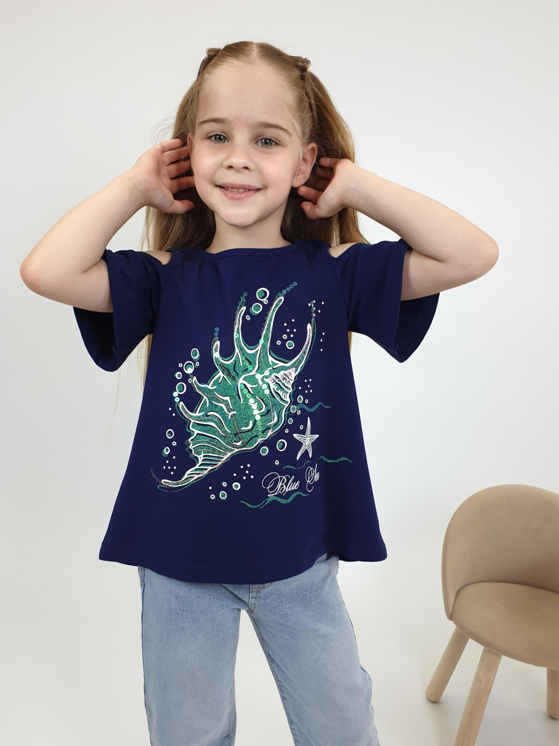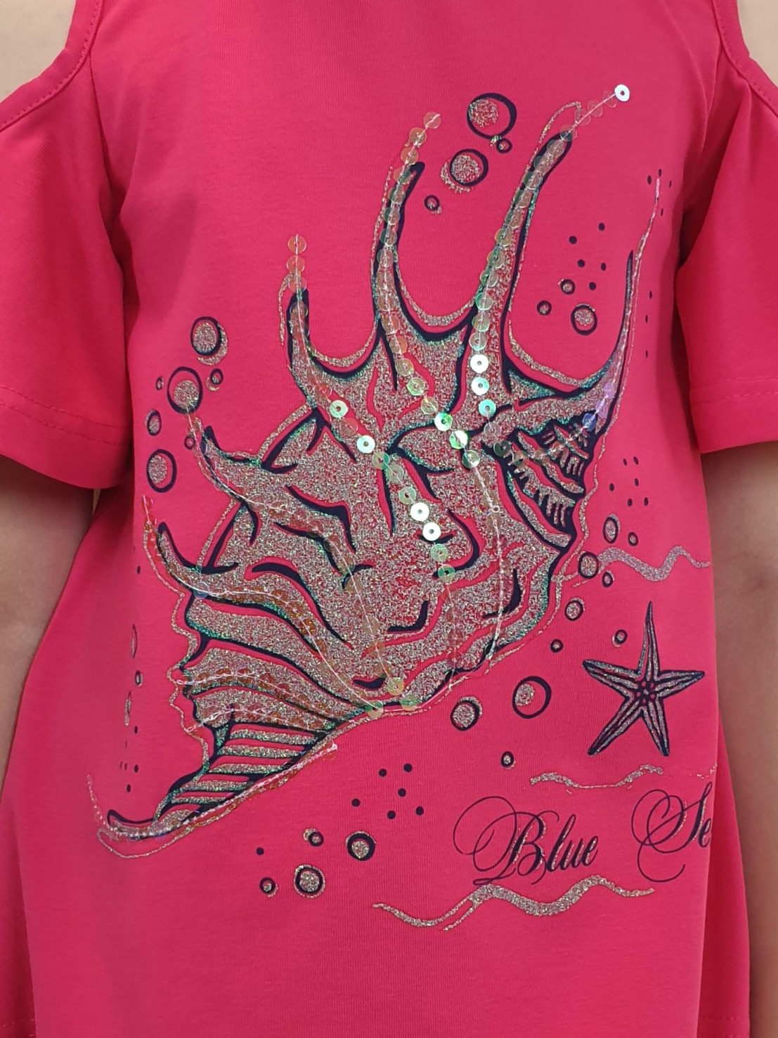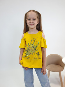 Футболка для девочки силуэт трапеция, изготовлена из кулирного полотна (95 % хлопок, 5% лайкра). Стильная модель с открытыми плечами. Оригинальный принт с вышивкой (пайетки) точно понравится юным модницам. Ткань изделия мягкая, дышащая и приятная к телу.