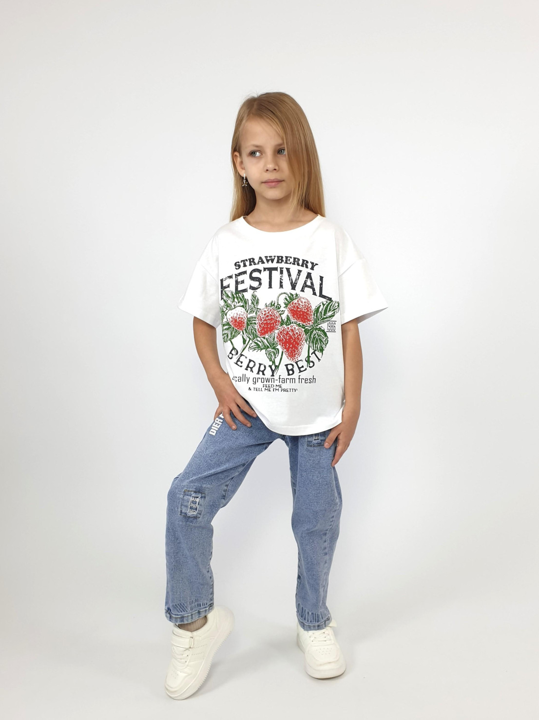 Кулирное полотно: 100% х/б. Футболка(оверсайз)-прямой силуэт,спущенное плечо,короткий рукав,перед с печатью.Горловина обработана притачной планкой.Низ изделия и рукава подшиты.