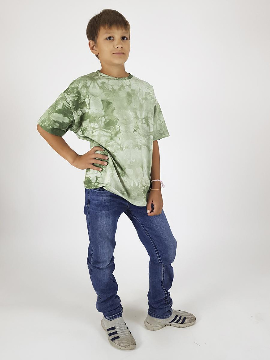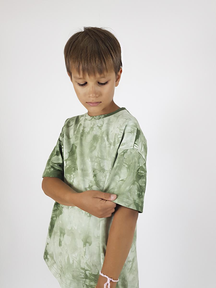 Кулирное полотно: 95% х/б.,5% лайкра. Футболка(оверсайз)-прямой силуэт спущенное плечо,короткий рукав.Горловина обработана планкой.Низ изделия и рукава подшиты.