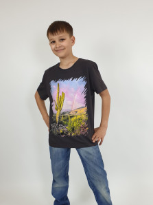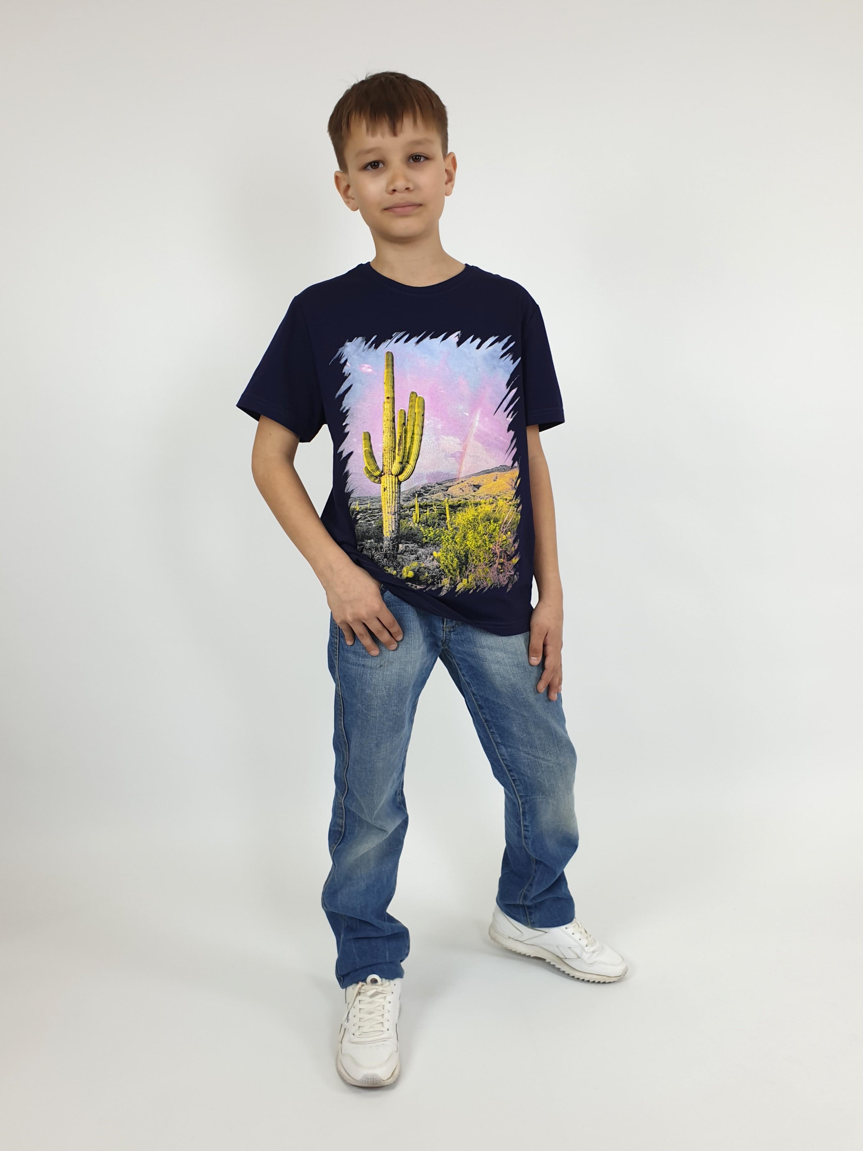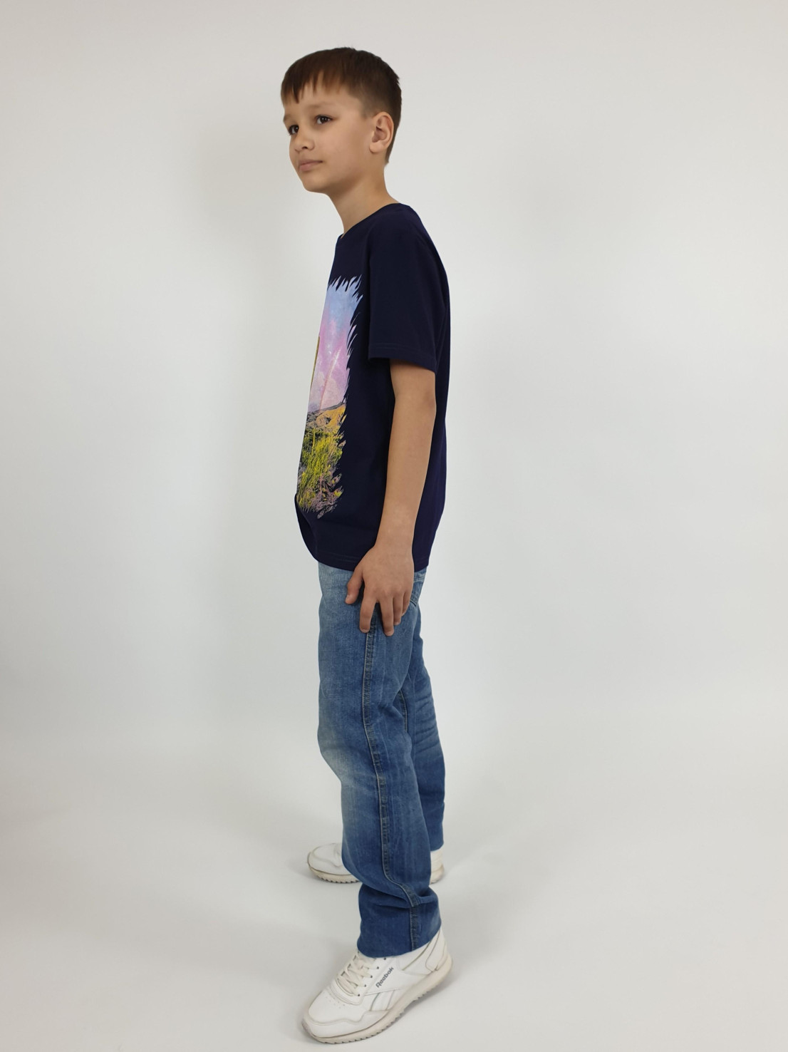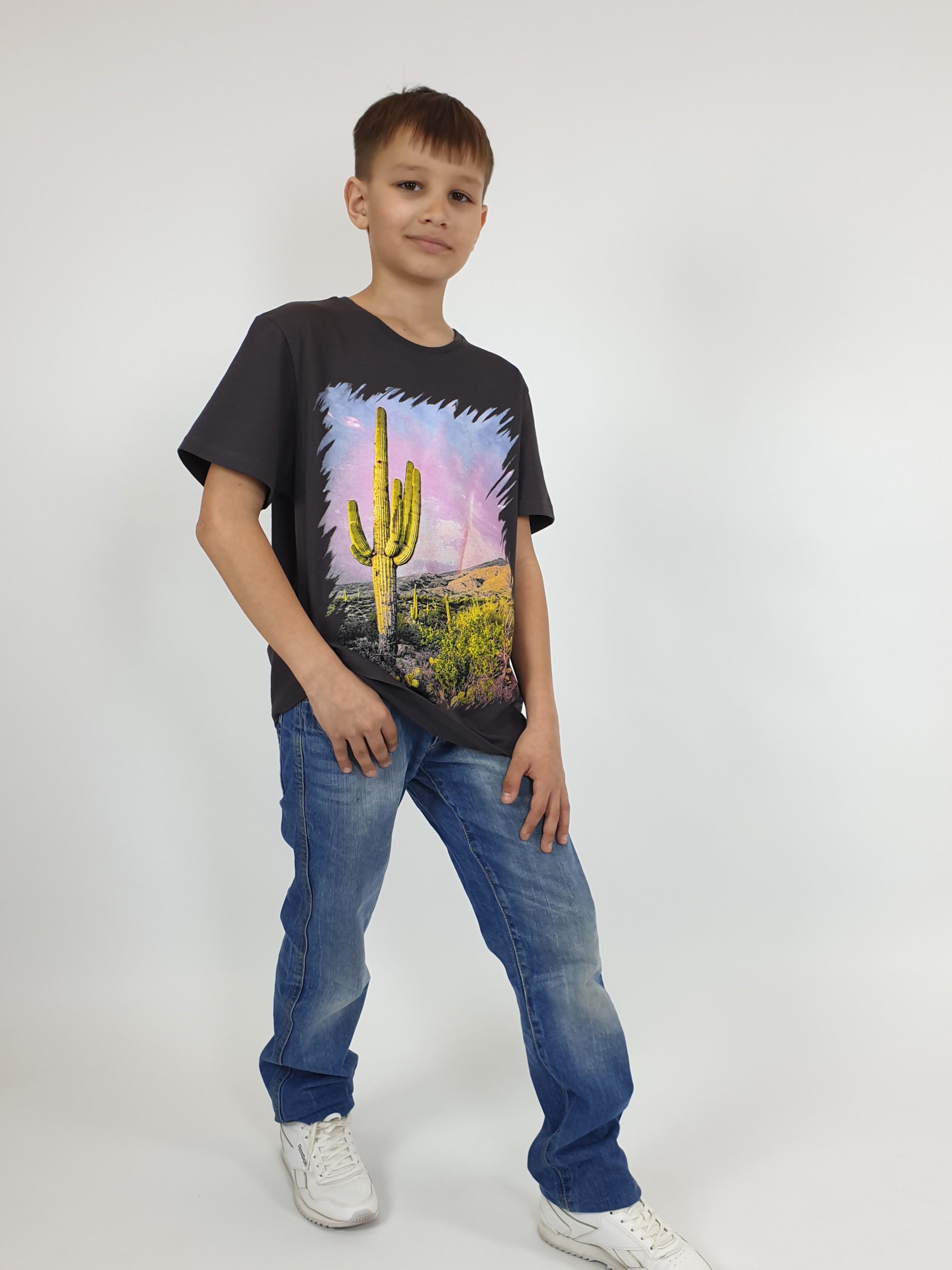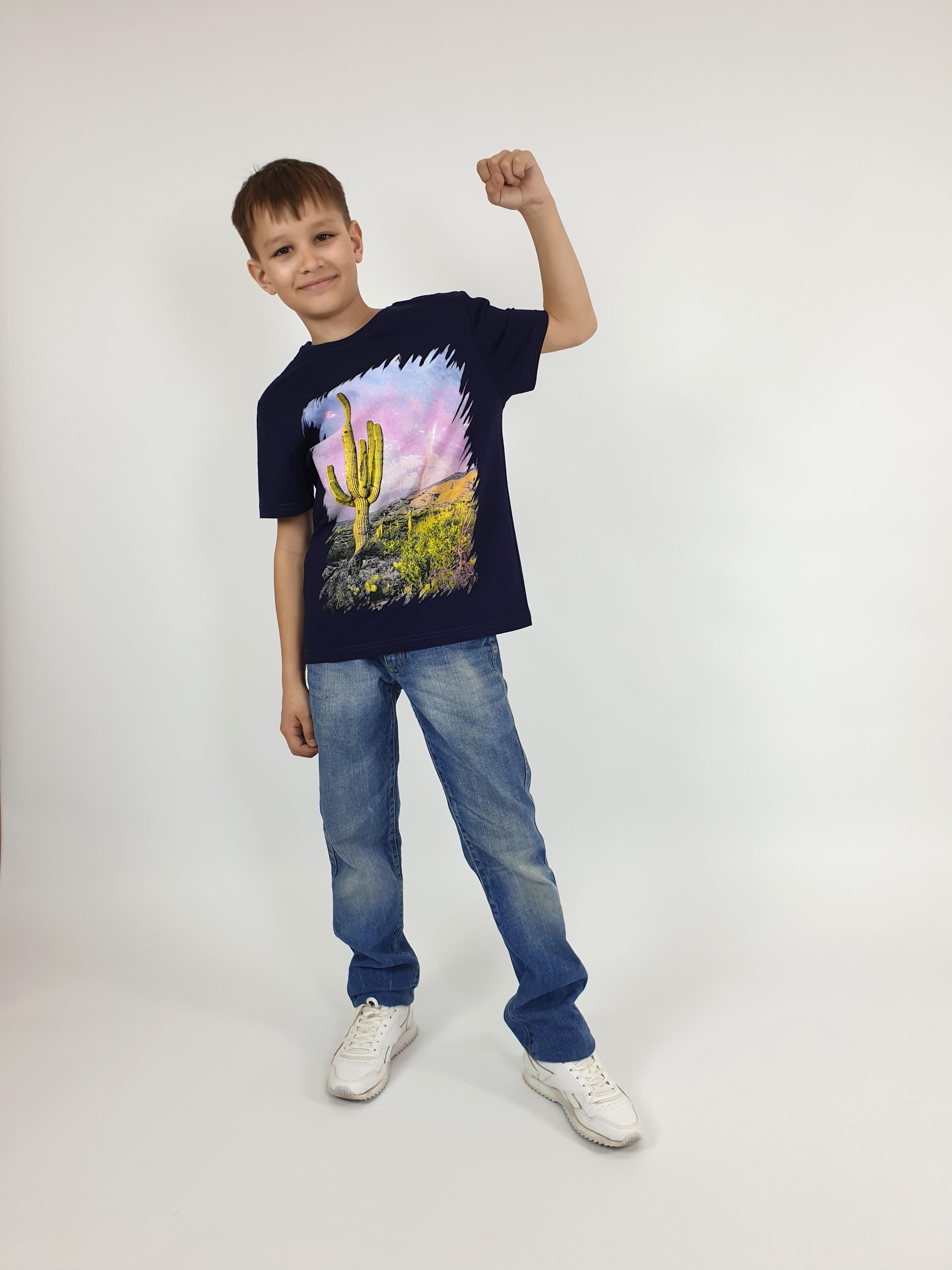 Кулирное полотно: 100% х/б. Футболка-прямой силуэт,перед с печатью,рукав втачной короткий.Горловина обработана ластиком.Низ изделия и рукава подшиты.