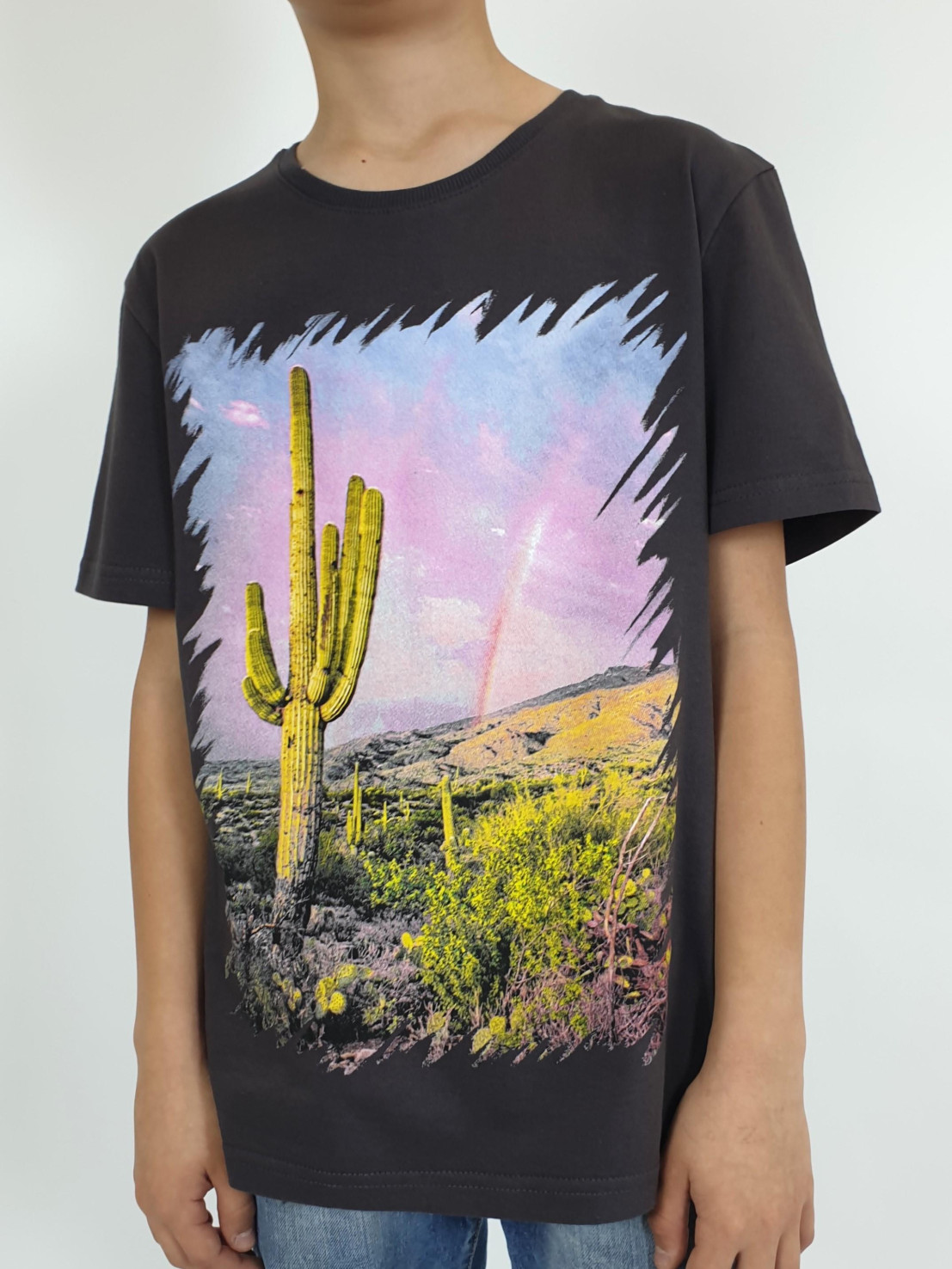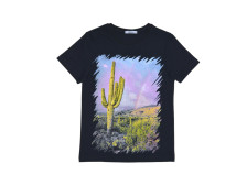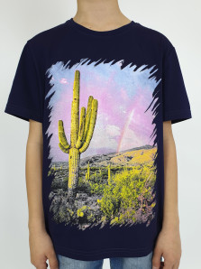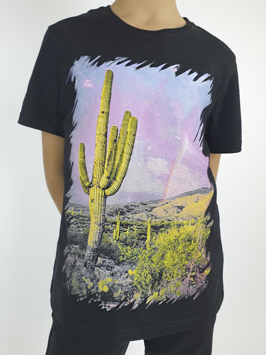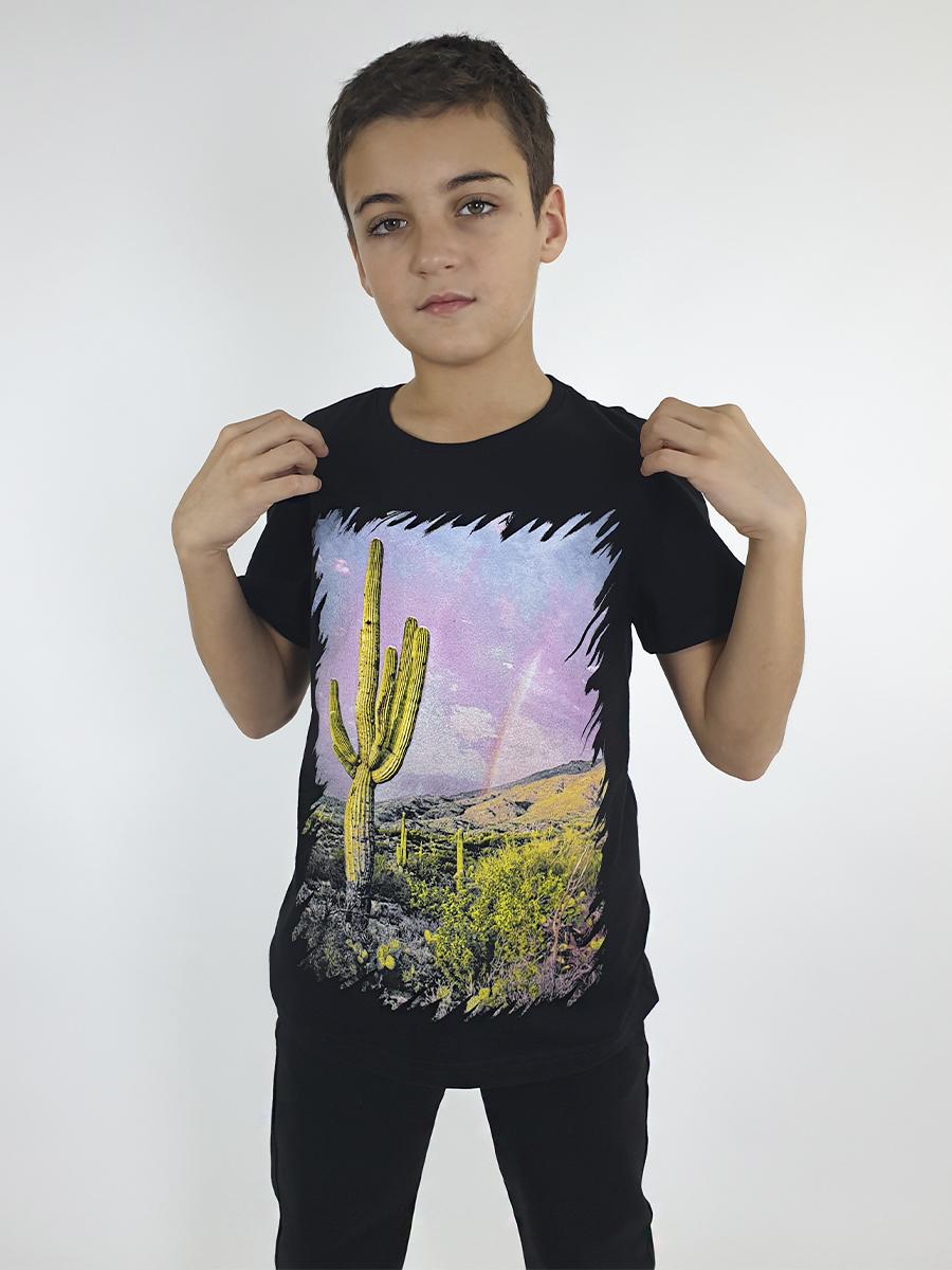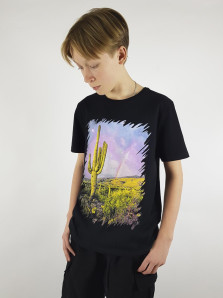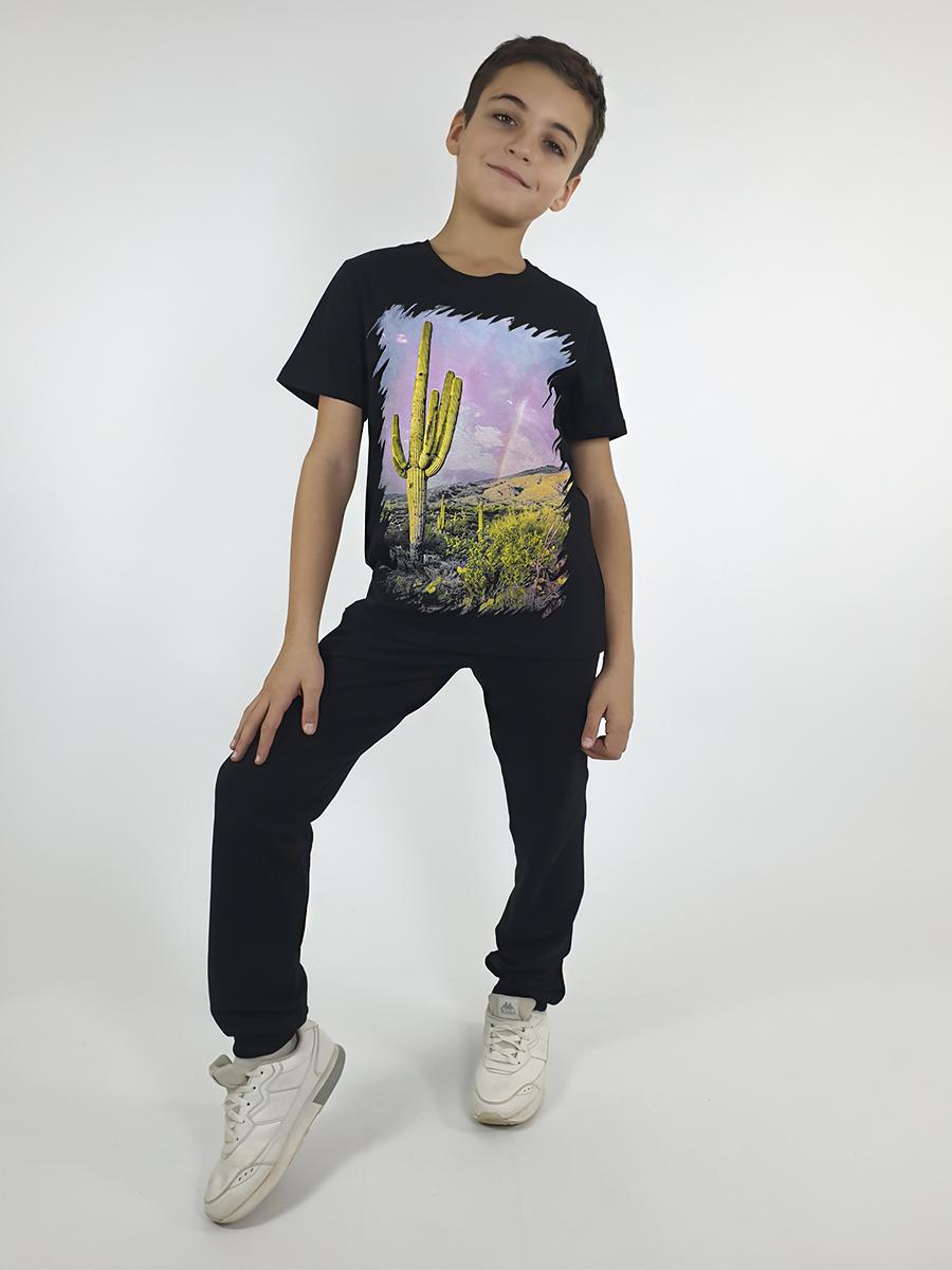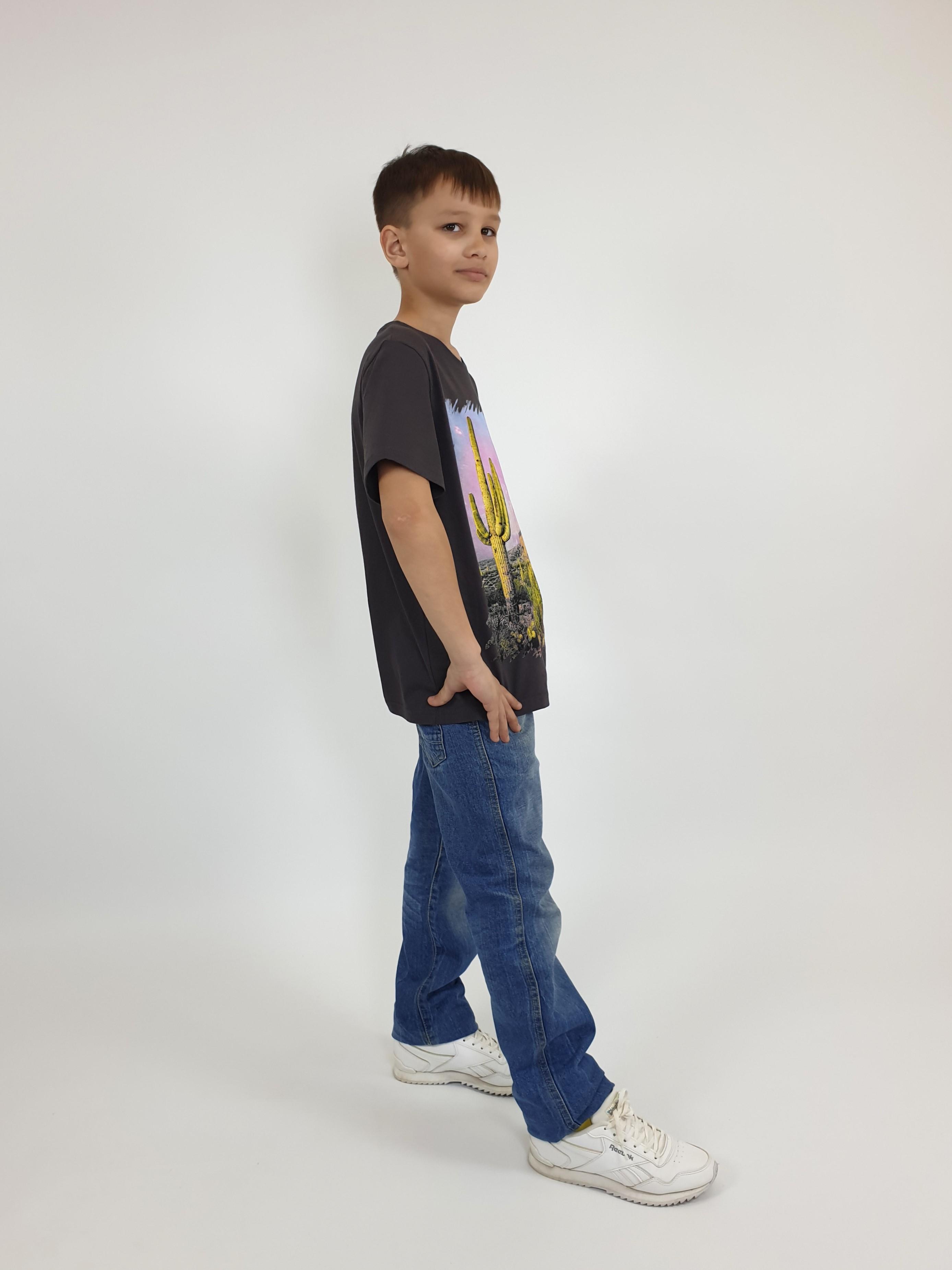 Кулирное полотно: 100% х/б. Футболка-прямой силуэт,перед с печатью,рукав втачной короткий.Горловина обработана ластиком.Низ изделия и рукава подшиты.