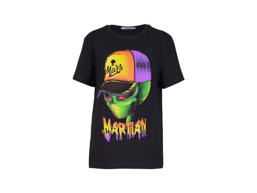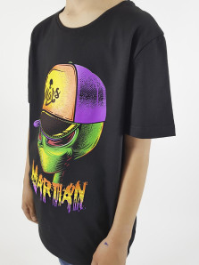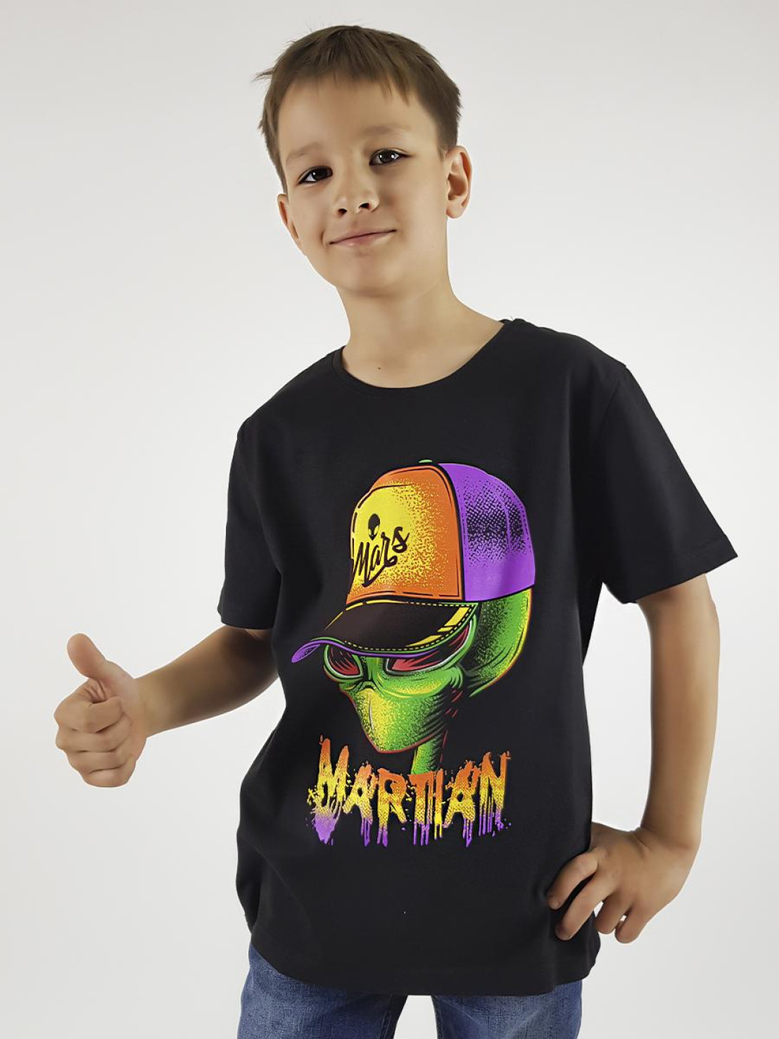 Кулирное полотно:100% х/б. Футболка-прямой силуэт,перед с печатью,рукав втачной короткий.Горловина обработана ластиком.Низ изделия и рукава подшиты.
