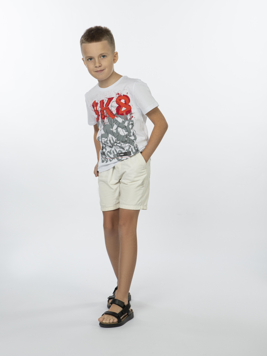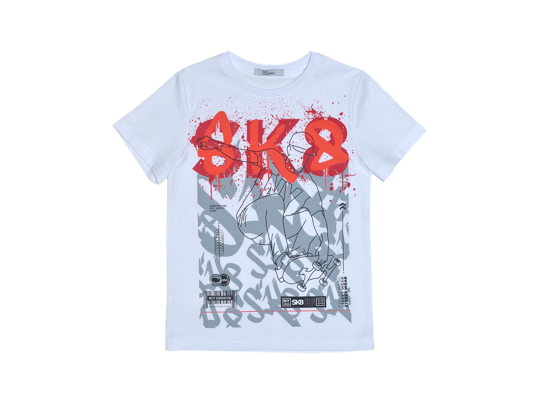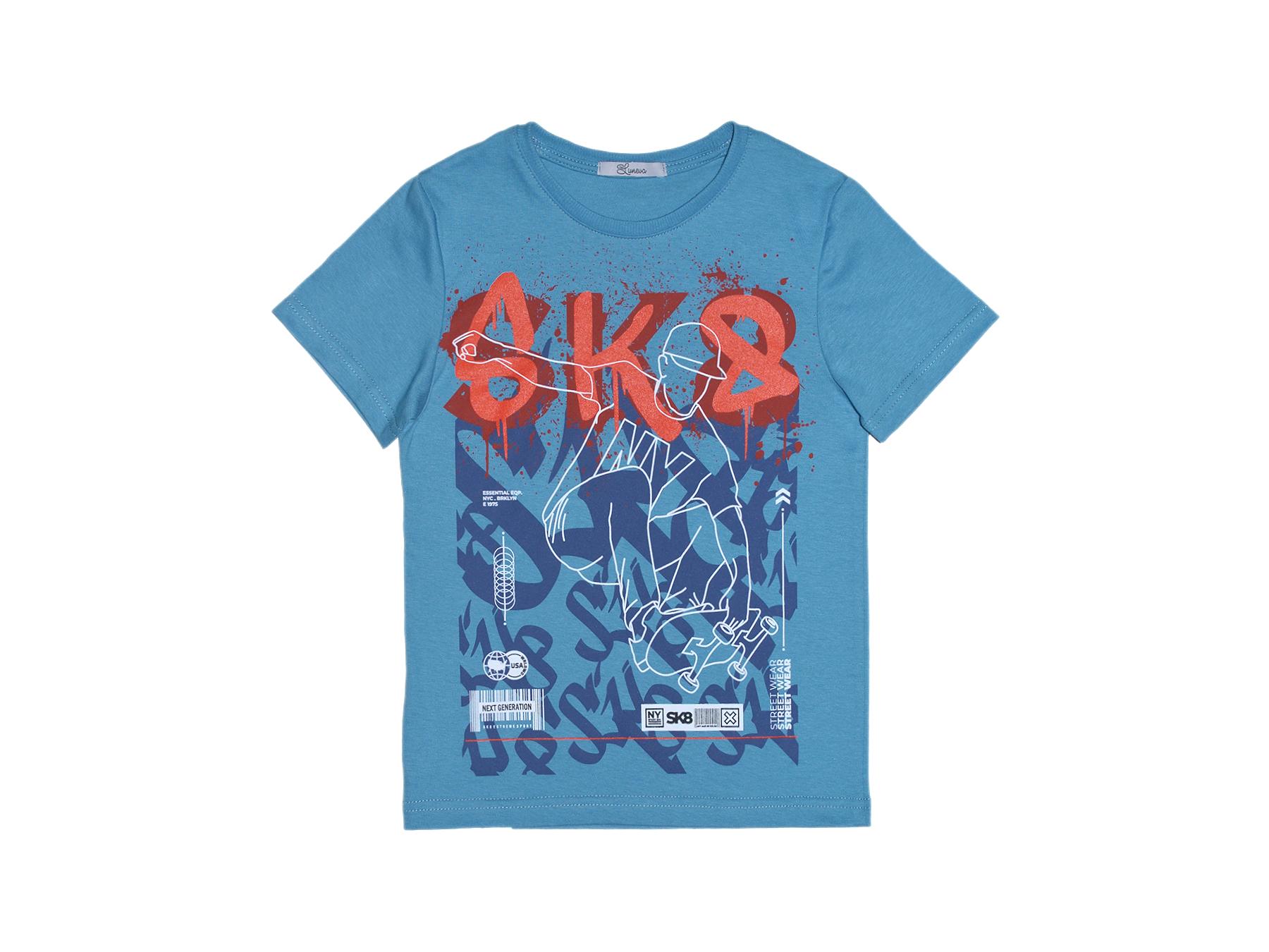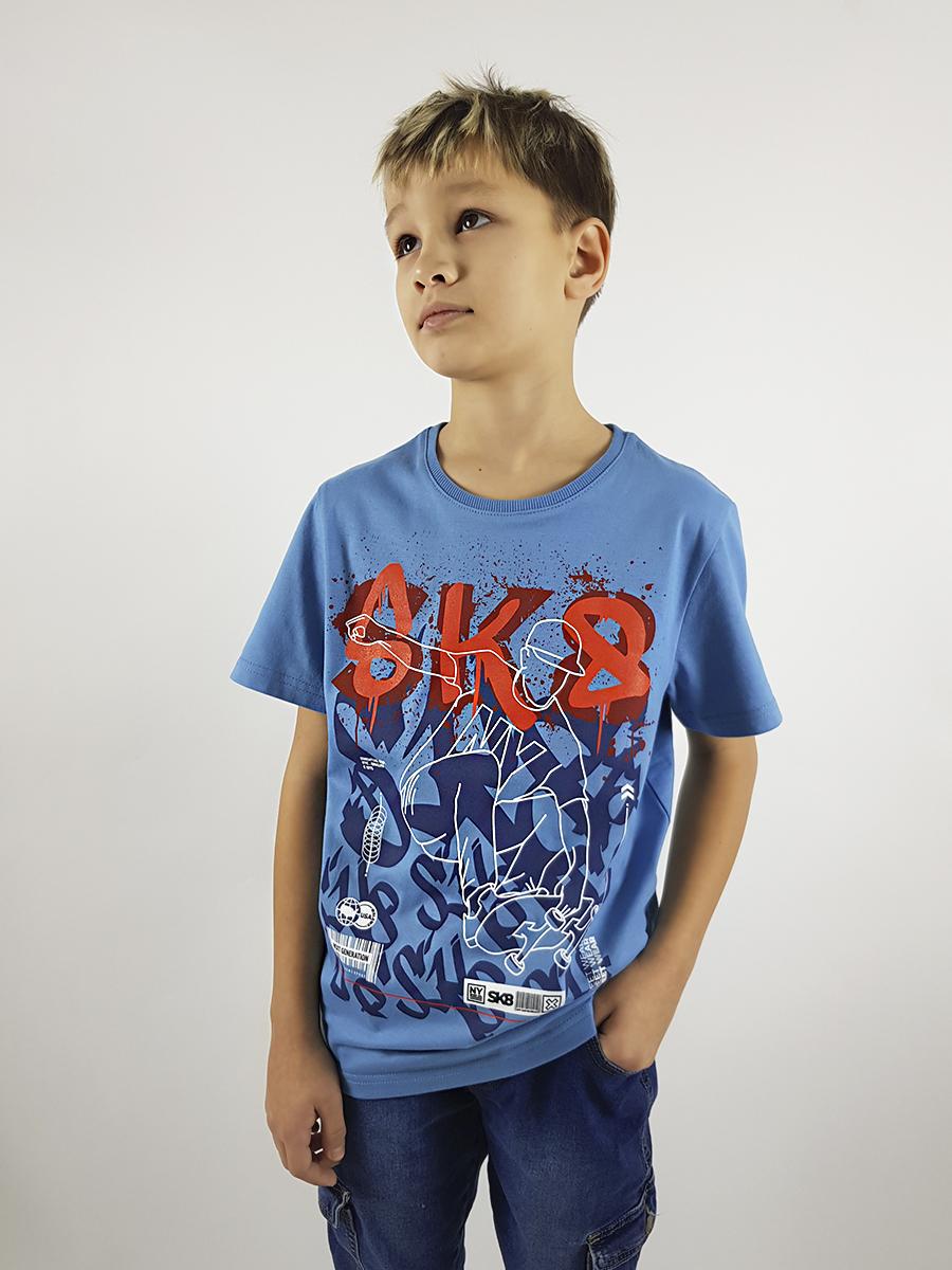 Кулирное полотно: 100% х/б. Футболка-прямой силуэт,перед с печатью,рукав втачной короткий.Горловина обработана ластиком.Низ изделия и рукава подшиты.