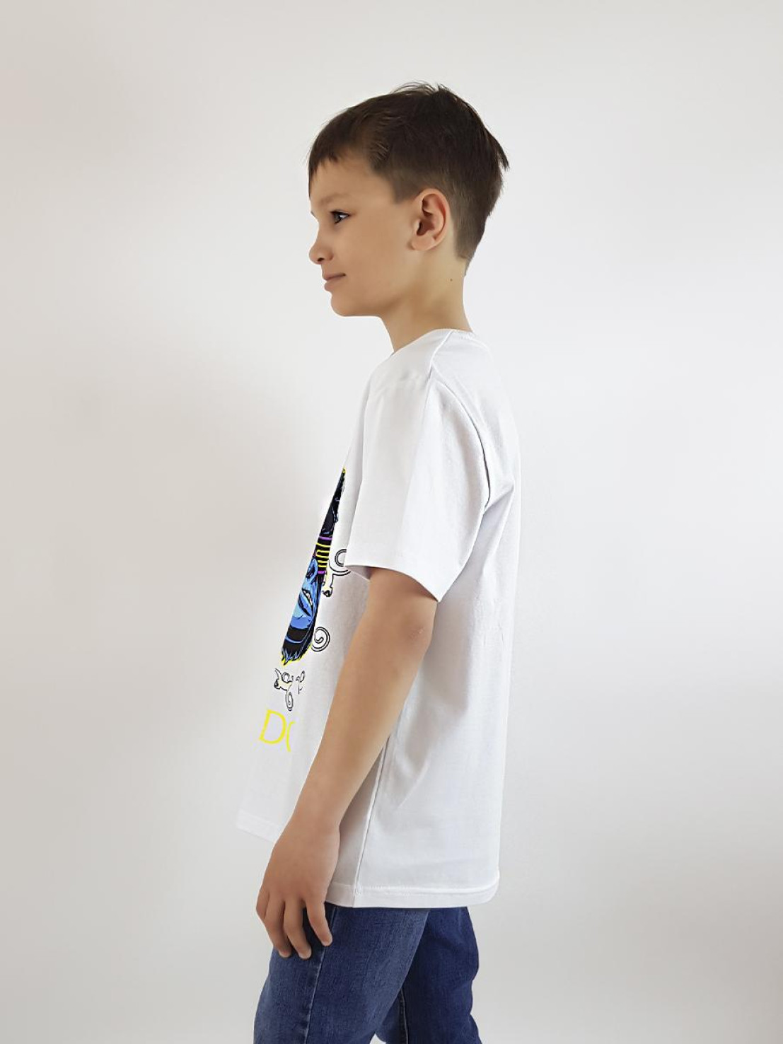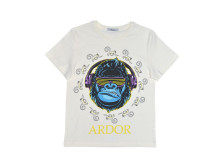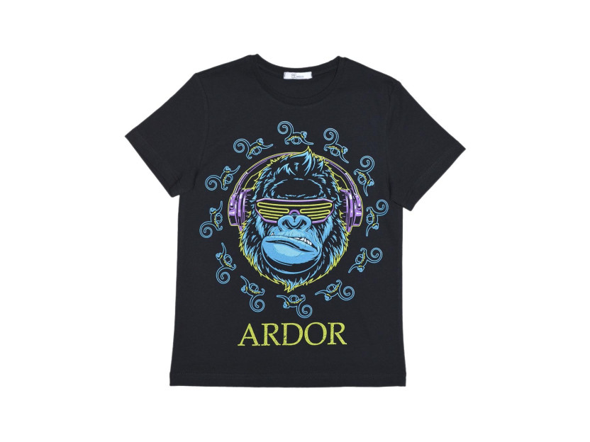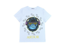 Кулирное полотно: 100% х/б. Футболка-прямой силуэт,перед с печатью,рукав втачной короткий.Горловина обработана ластиком.Низ изделия и рукава подшиты.
