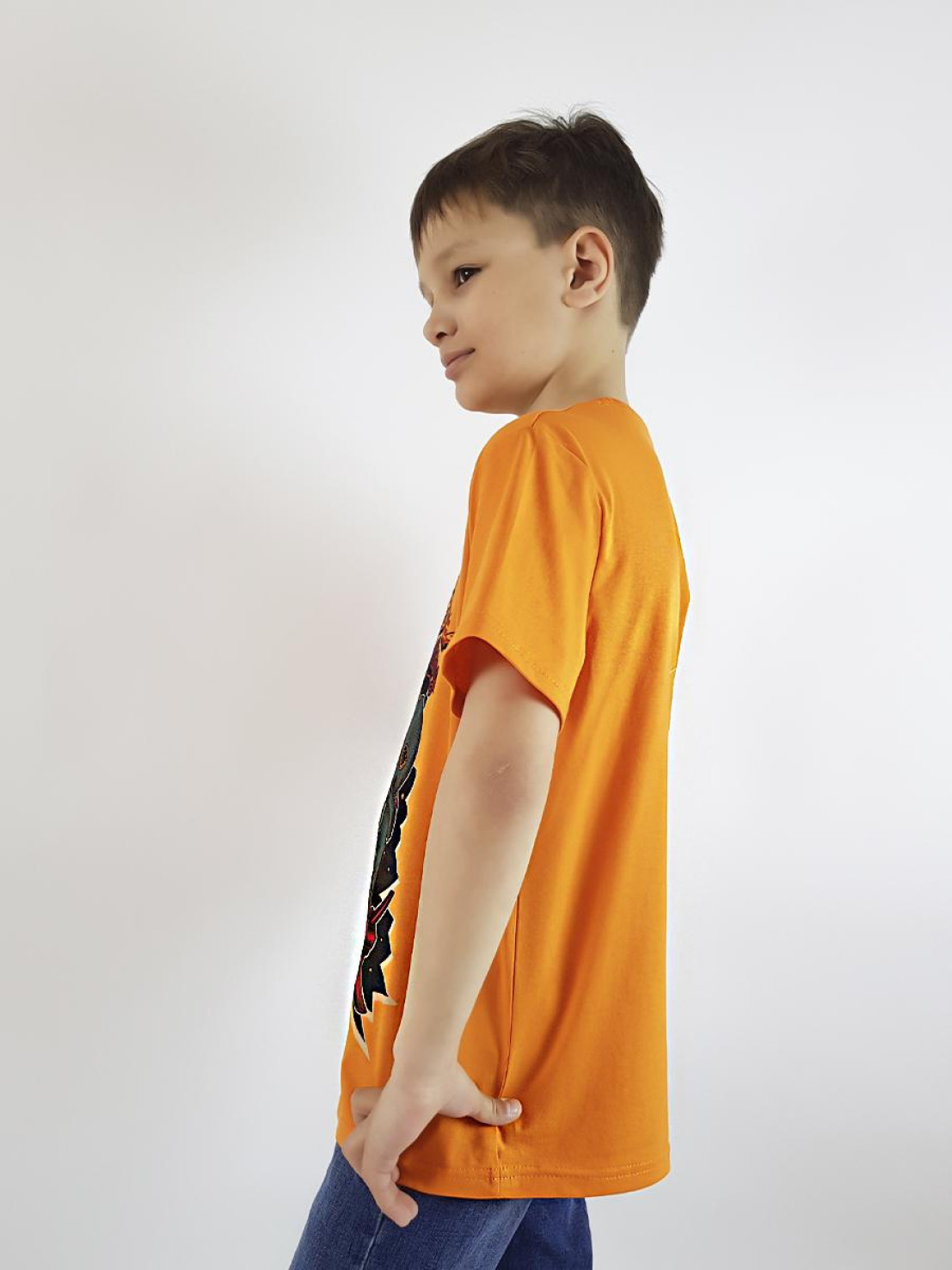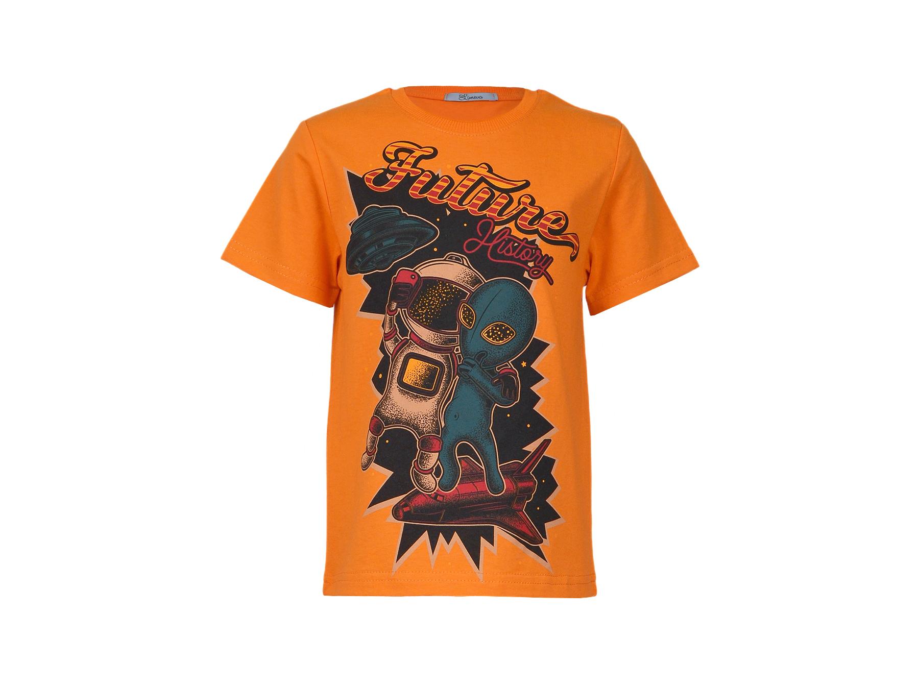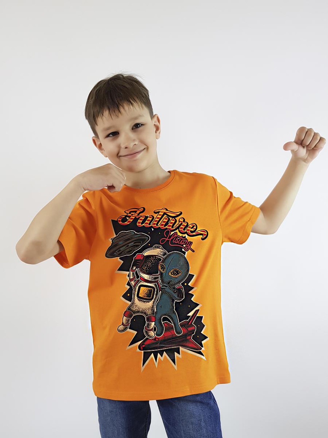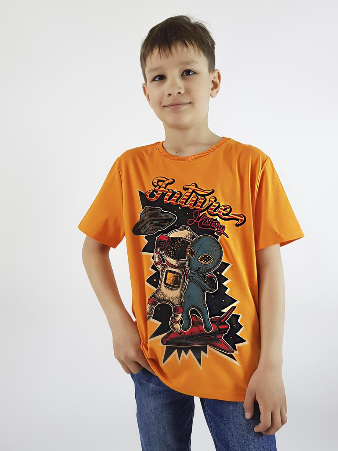 Кулирное полотно:100% х/б. Футболка-прямой силуэт,перед с печатью,рукав втачной короткий.Горловина обработана ластиком.Низ изделия и рукава подшиты.