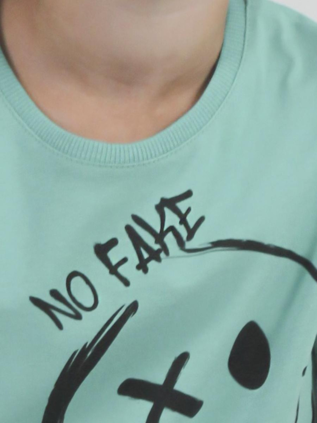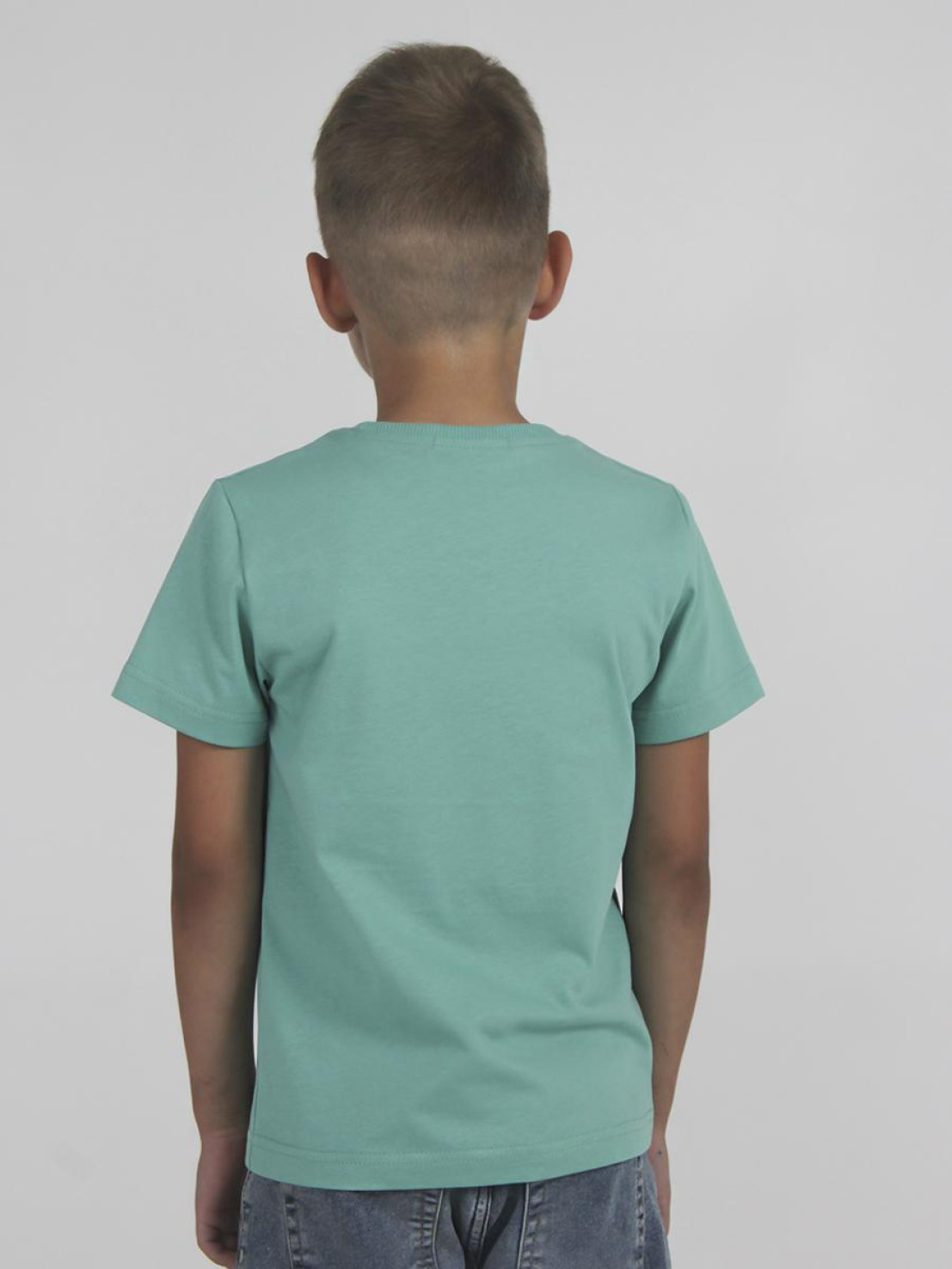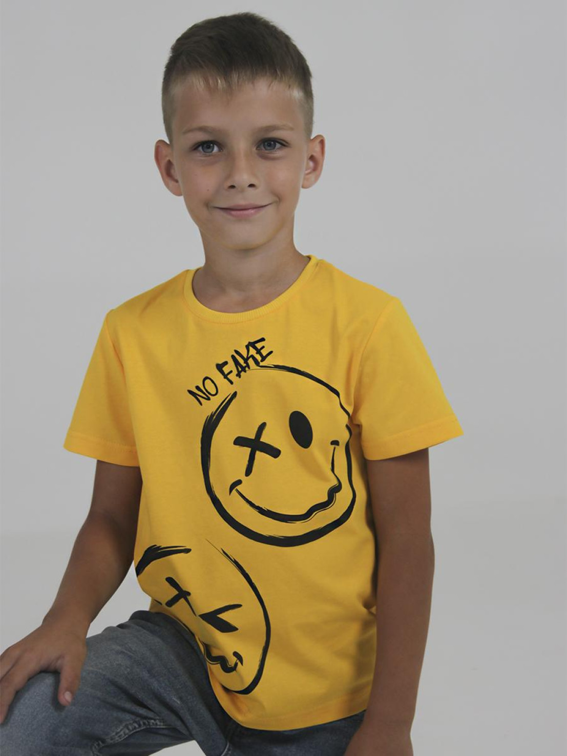 Кулирное полотно:100% х/б. Футболка-прямой силуэт,перед с печатью,рукав втачной короткий.Горловина обработана ластиком.Низ изделия и рукава подшиты.