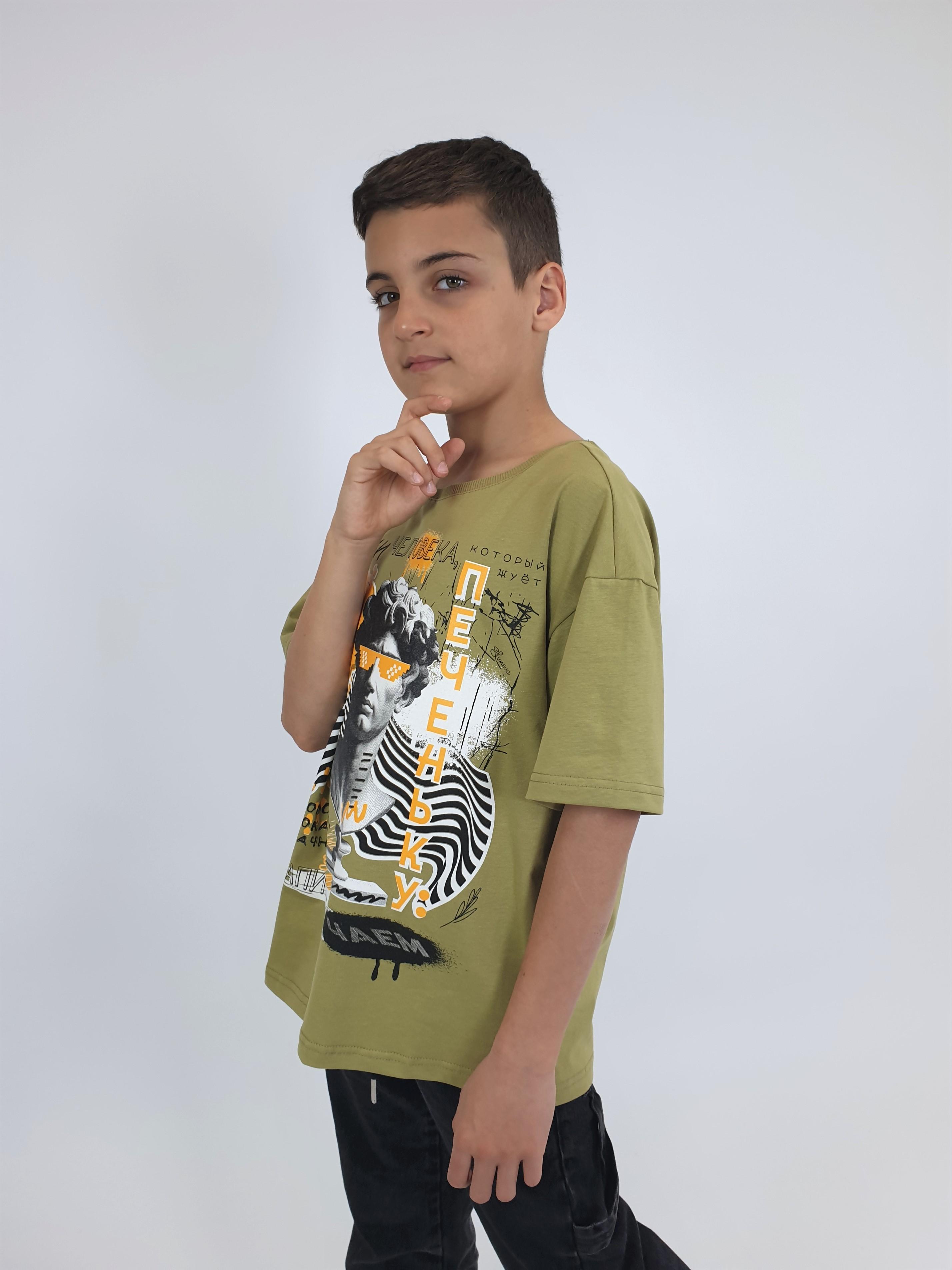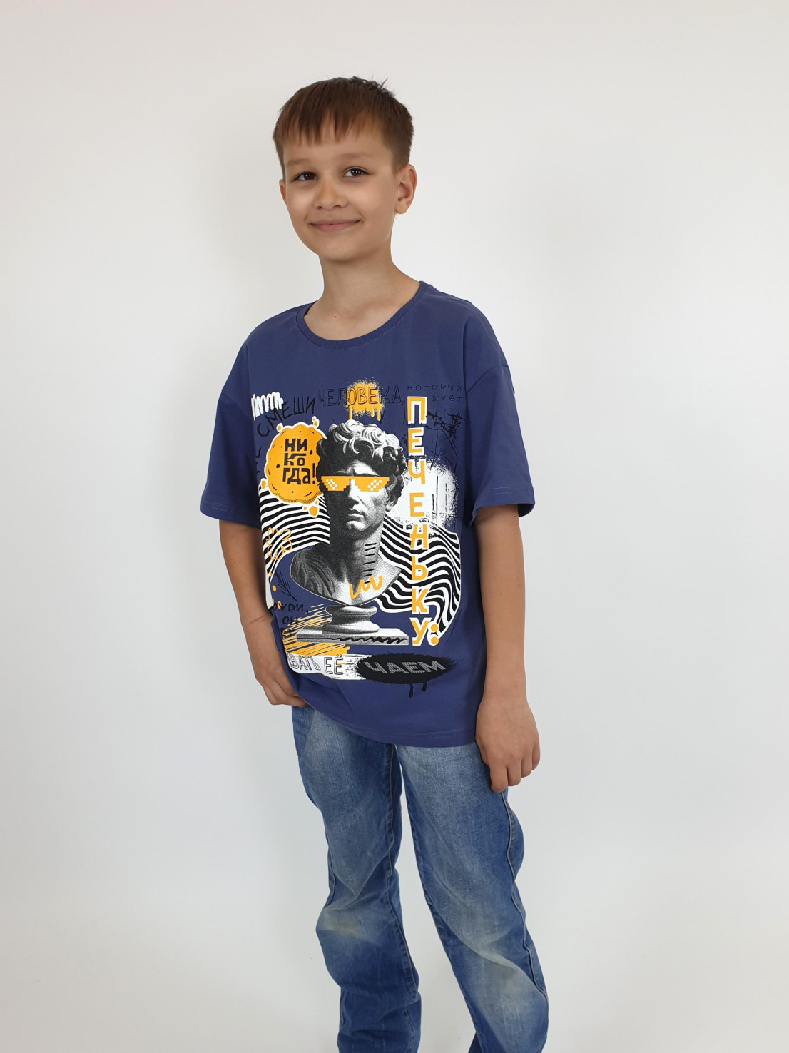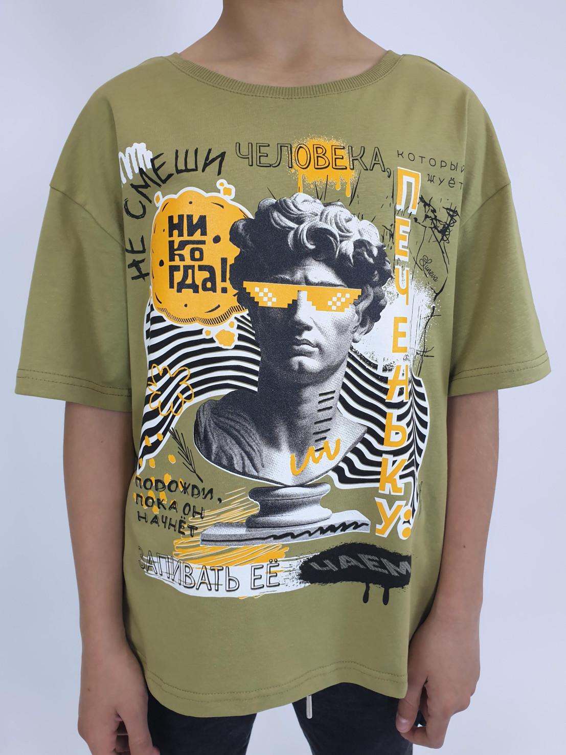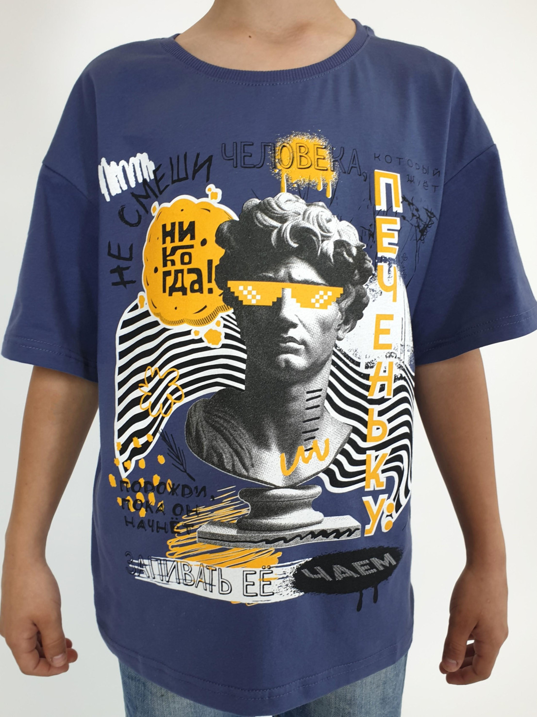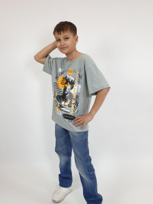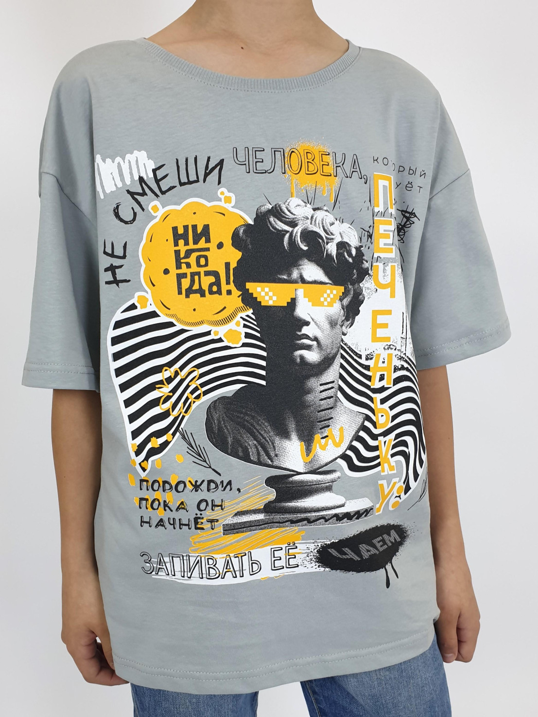 Кулирное полотно: 100% х/б. Футболка(оверсайз)-прямой силуэт спущенное плечо,короткий рукав,перед с печатью.Горловина обработана ластиком.Низ изделия и рукава подшиты.