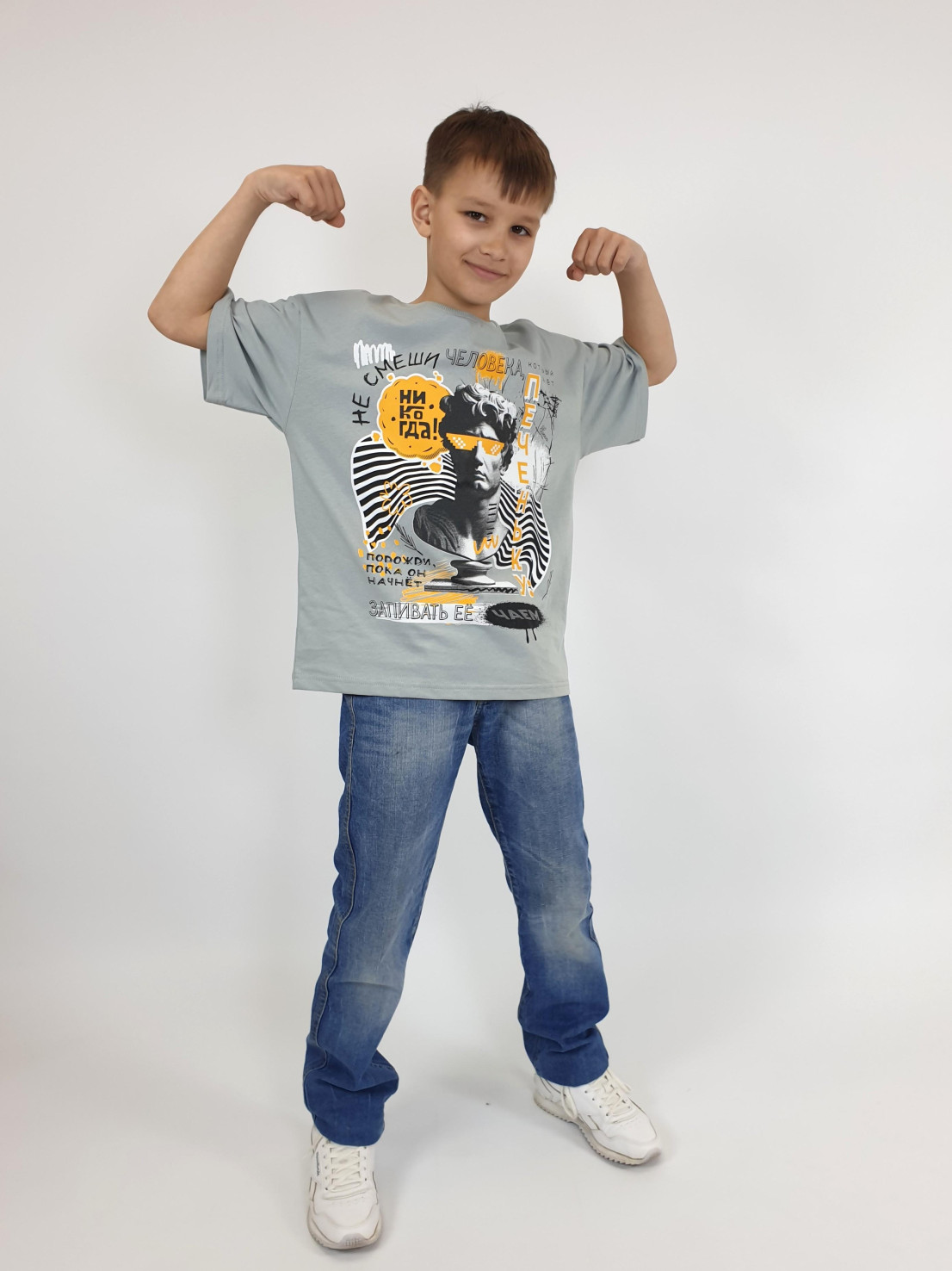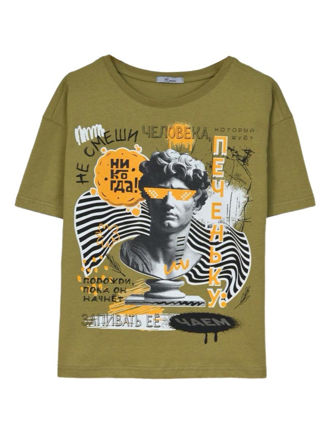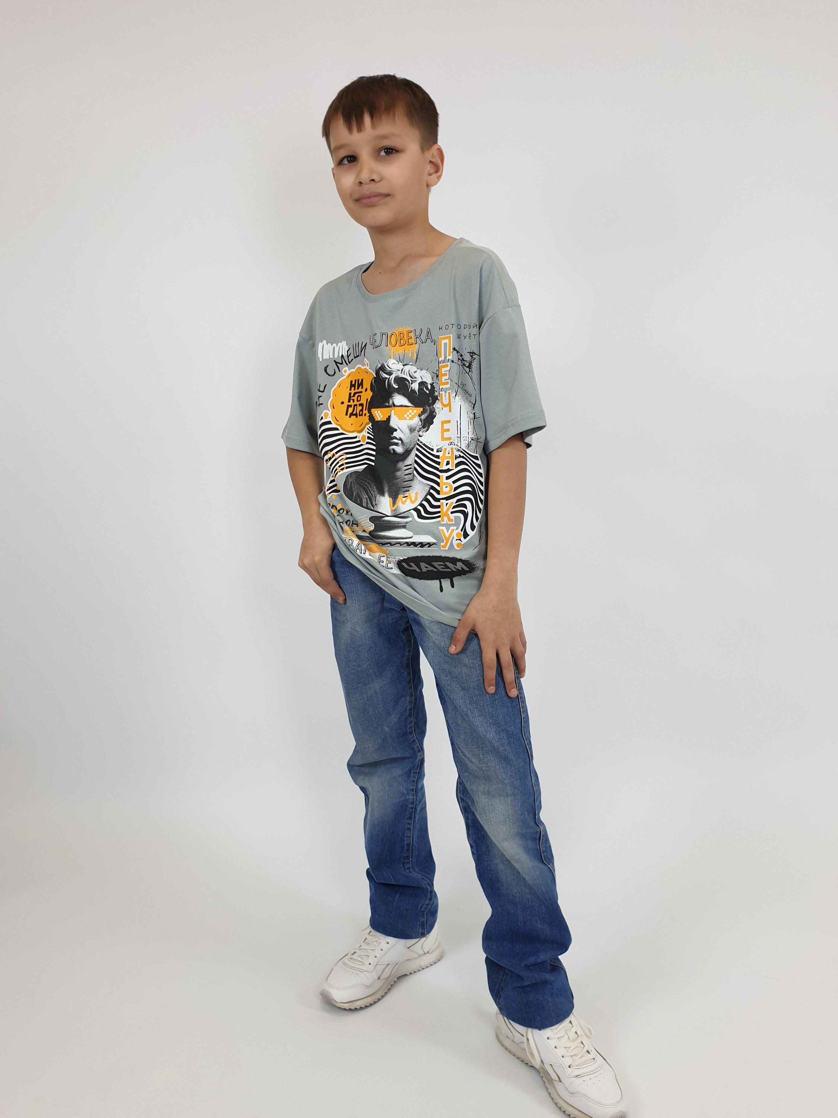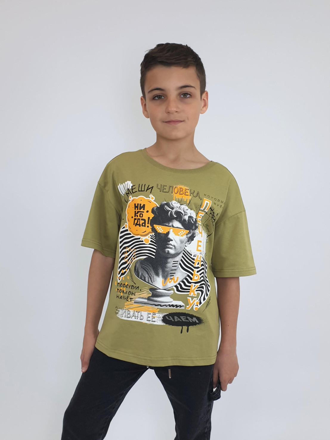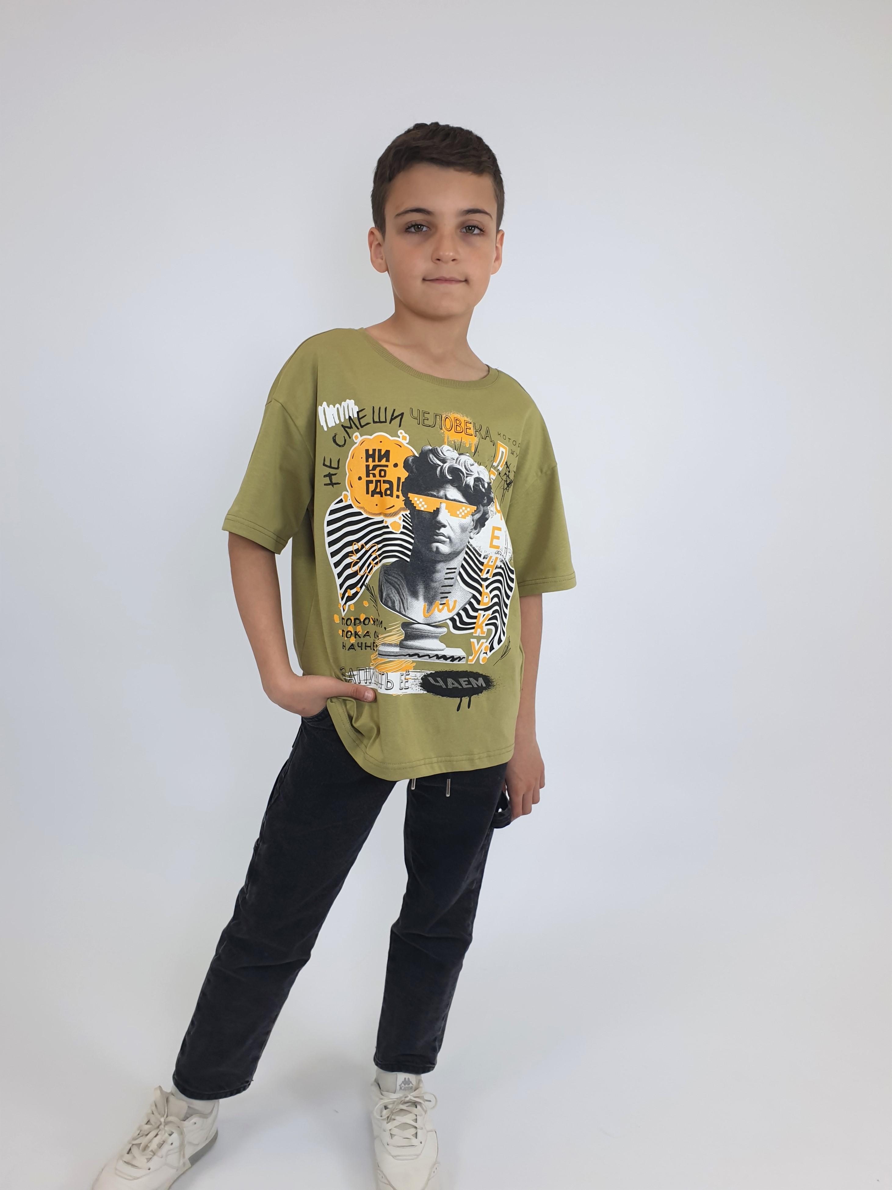Кулирное полотно: 100% х/б. Футболка(оверсайз)-прямой силуэт спущенное плечо,короткий рукав,перед с печатью.Горловина обработана ластиком.Низ изделия и рукава подшиты.