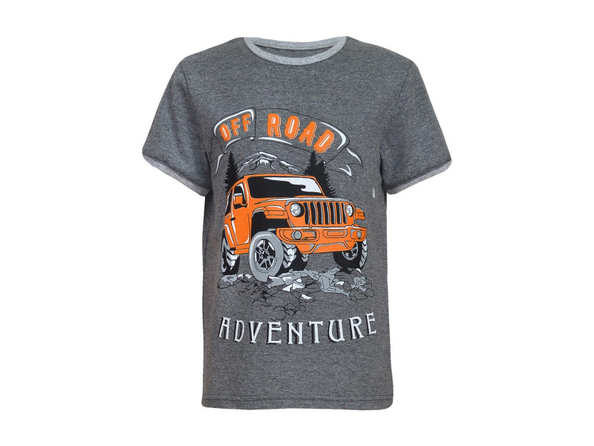 Кулирное полотно:меланж 50% х/б.,50% п/э. Футболка-прямой силуэт,перед с печатью,рукав короткий,втачной, внизу на манжете из ластика.Горловина обработана ластиком.Низ изделия подшит.