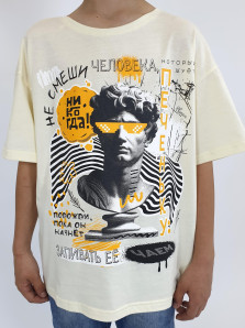 Кулирное полотно: 100% х/б. Футболка(оверсайз)-прямой силуэт спущенное плечо,короткий рукав,перед с печатью.Горловина обработана ластиком.Низ изделия и рукава подшиты.