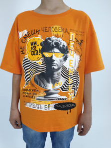 Кулирное полотно: 100% х/б. Футболка(оверсайз)-прямой силуэт спущенное плечо,короткий рукав,перед с печатью.Горловина обработана ластиком.Низ изделия и рукава подшиты.