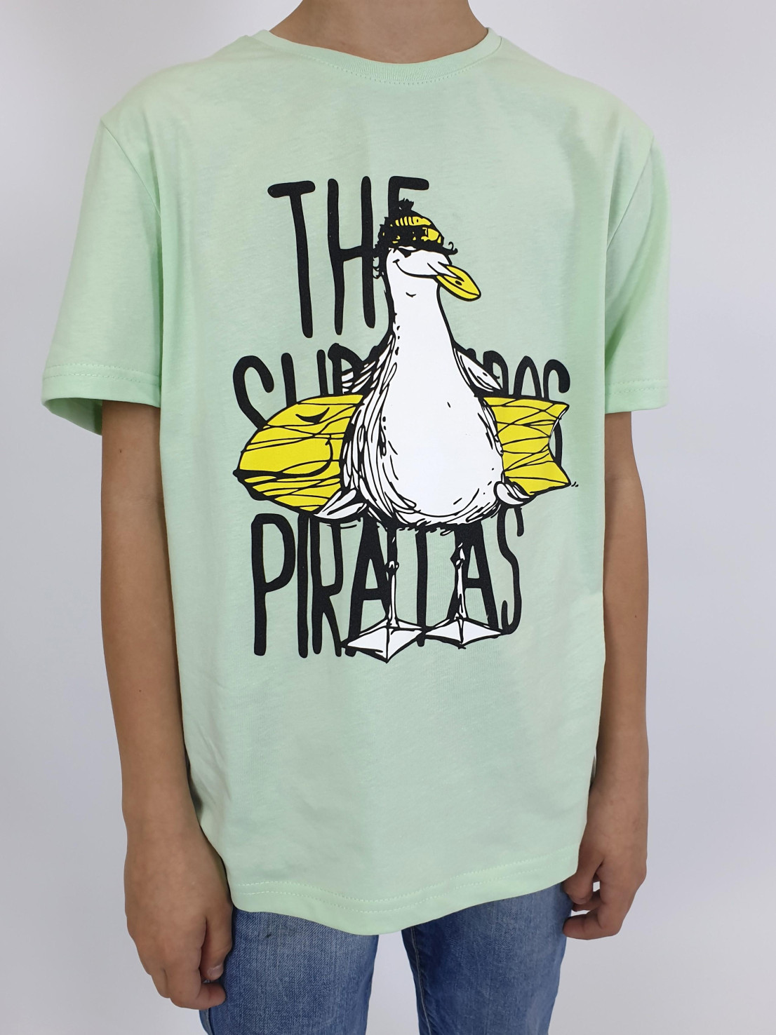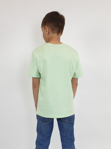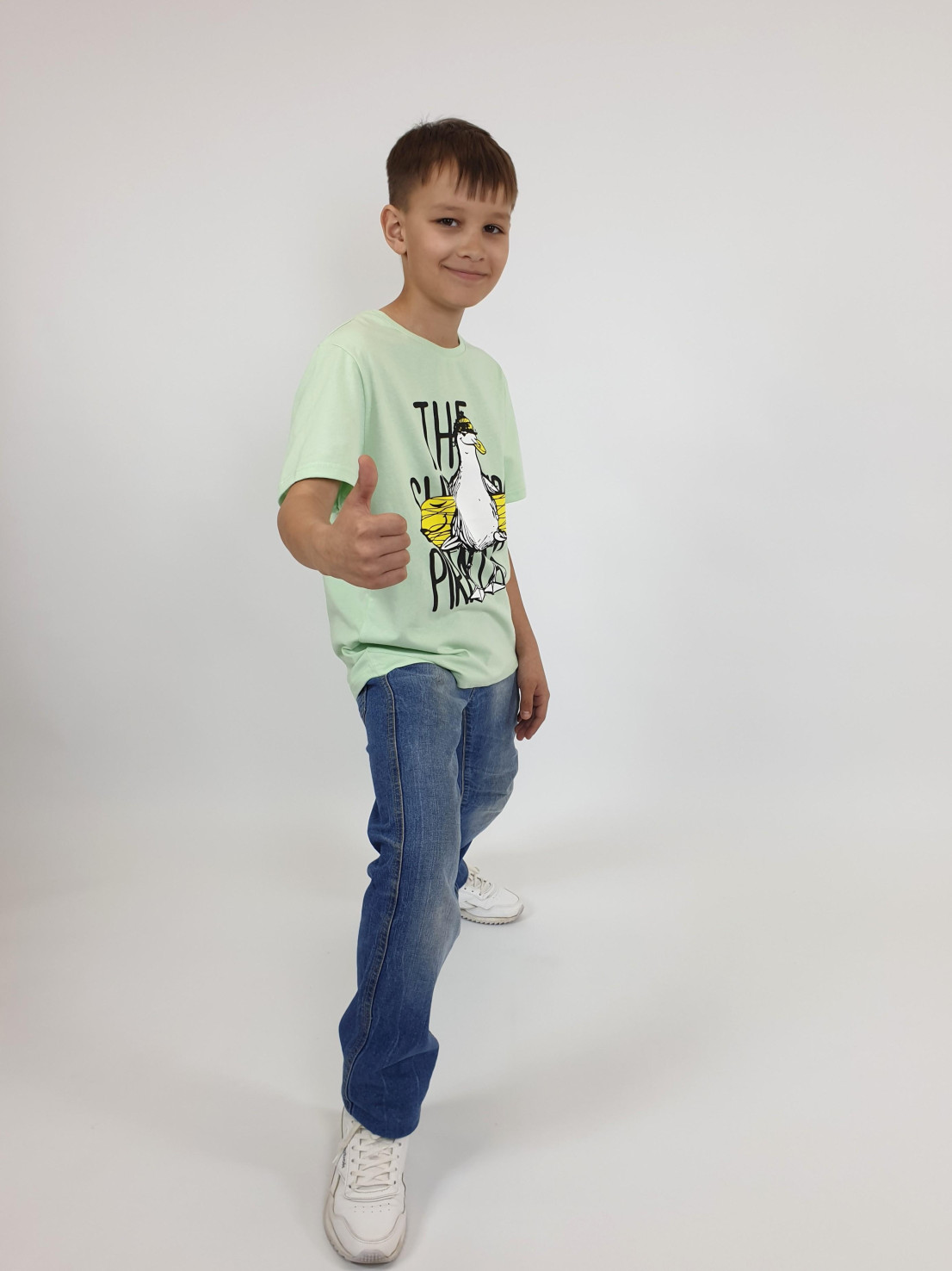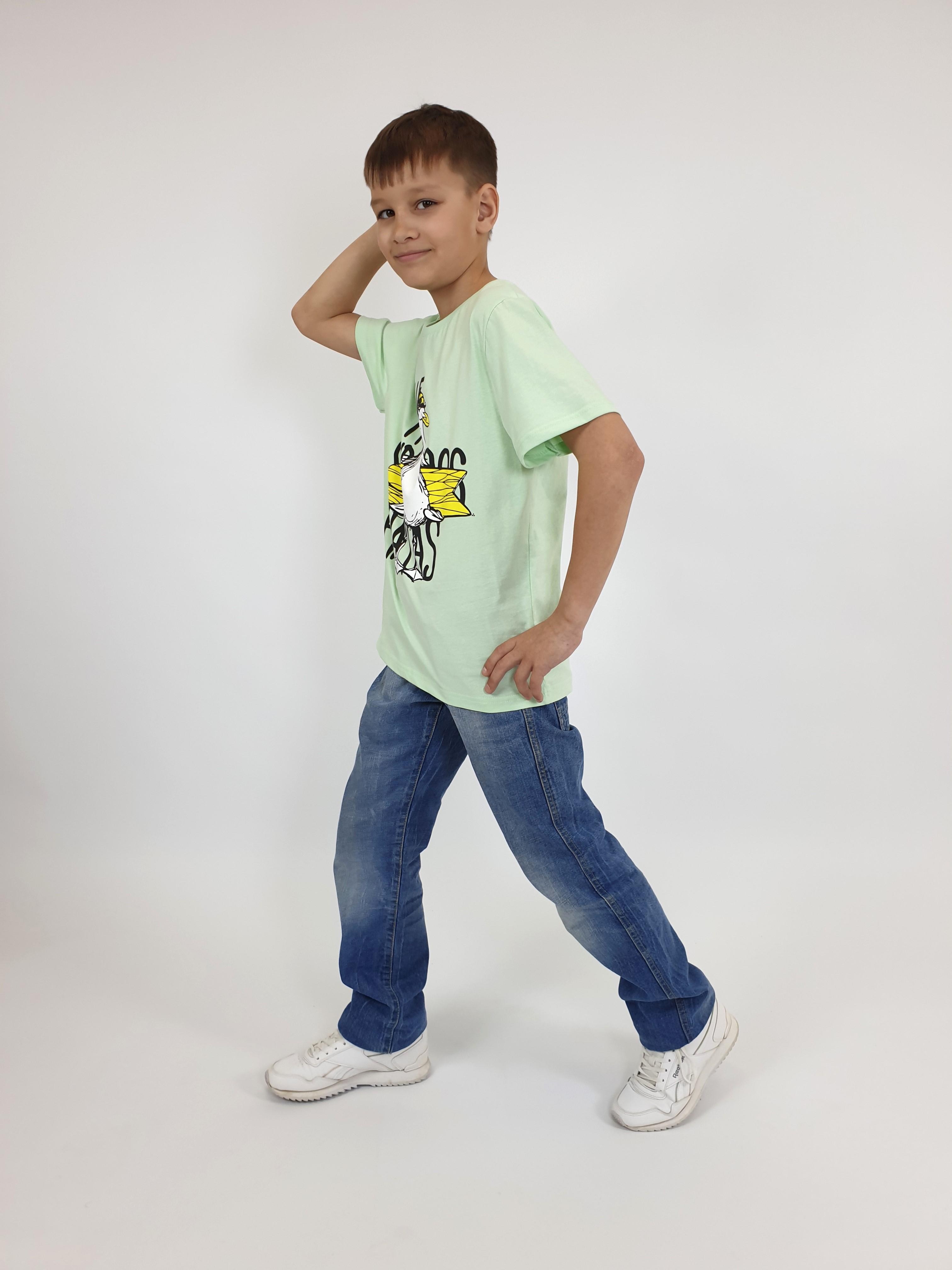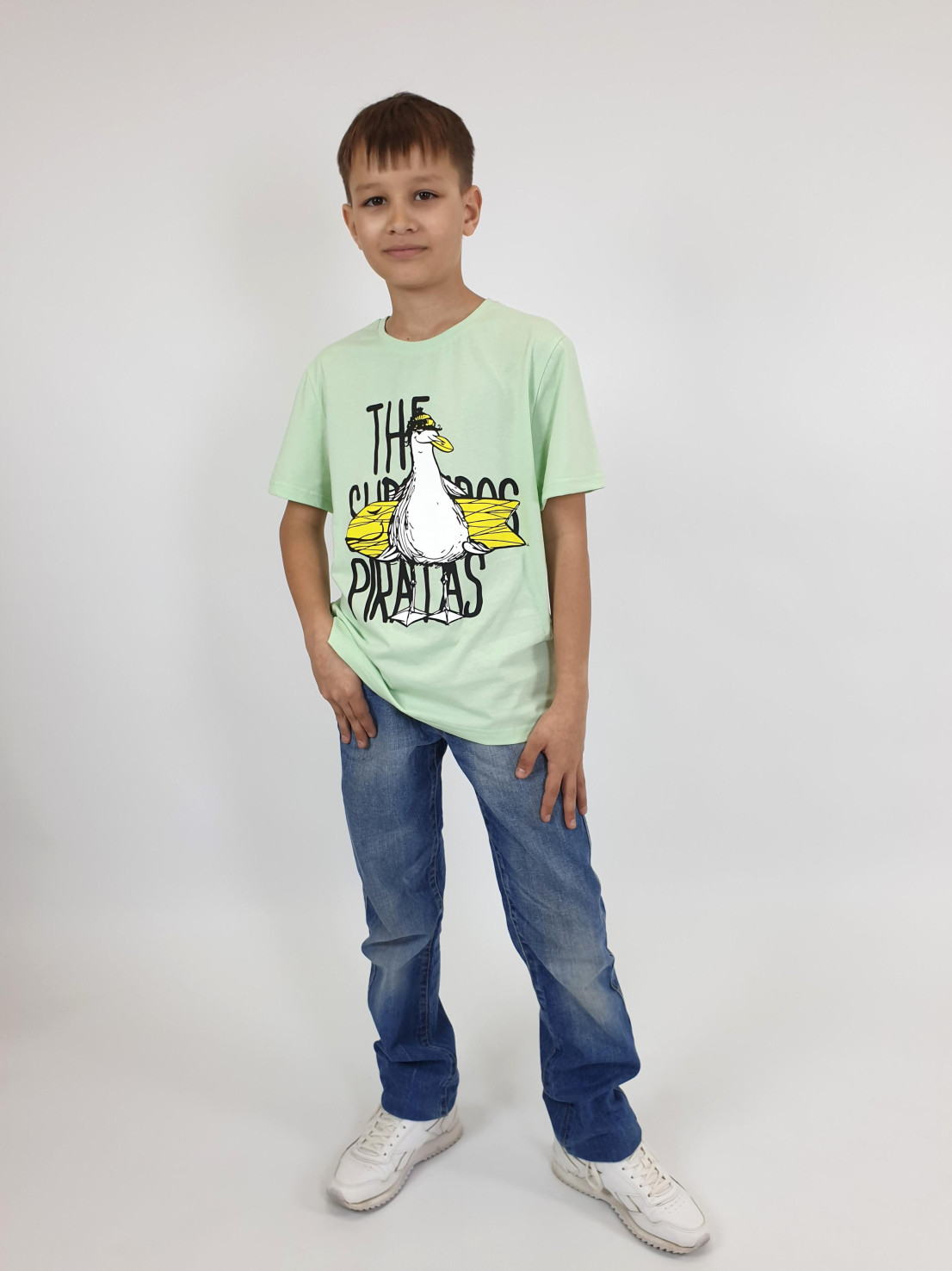 Кулирное полотно:100% х/б. Футболка-прямой силуэт,перед с печатью,рукав втачной короткий.Горловина обработана ластиком.Низ изделия и рукава подшиты.