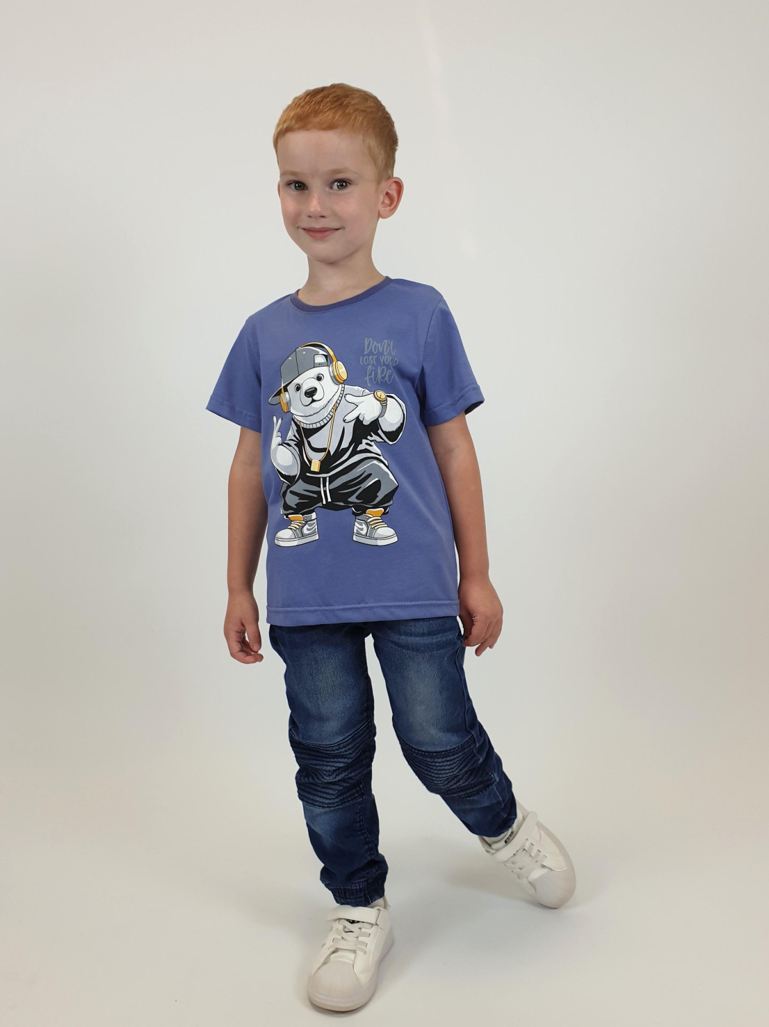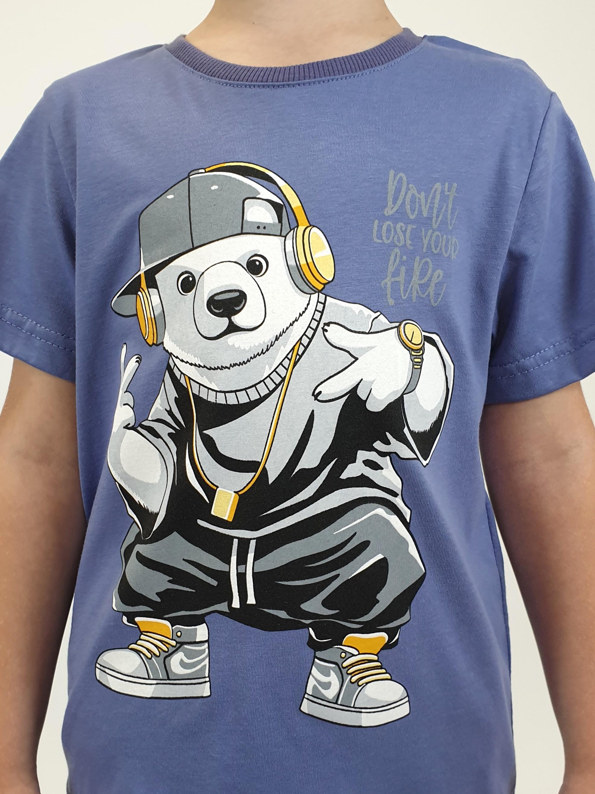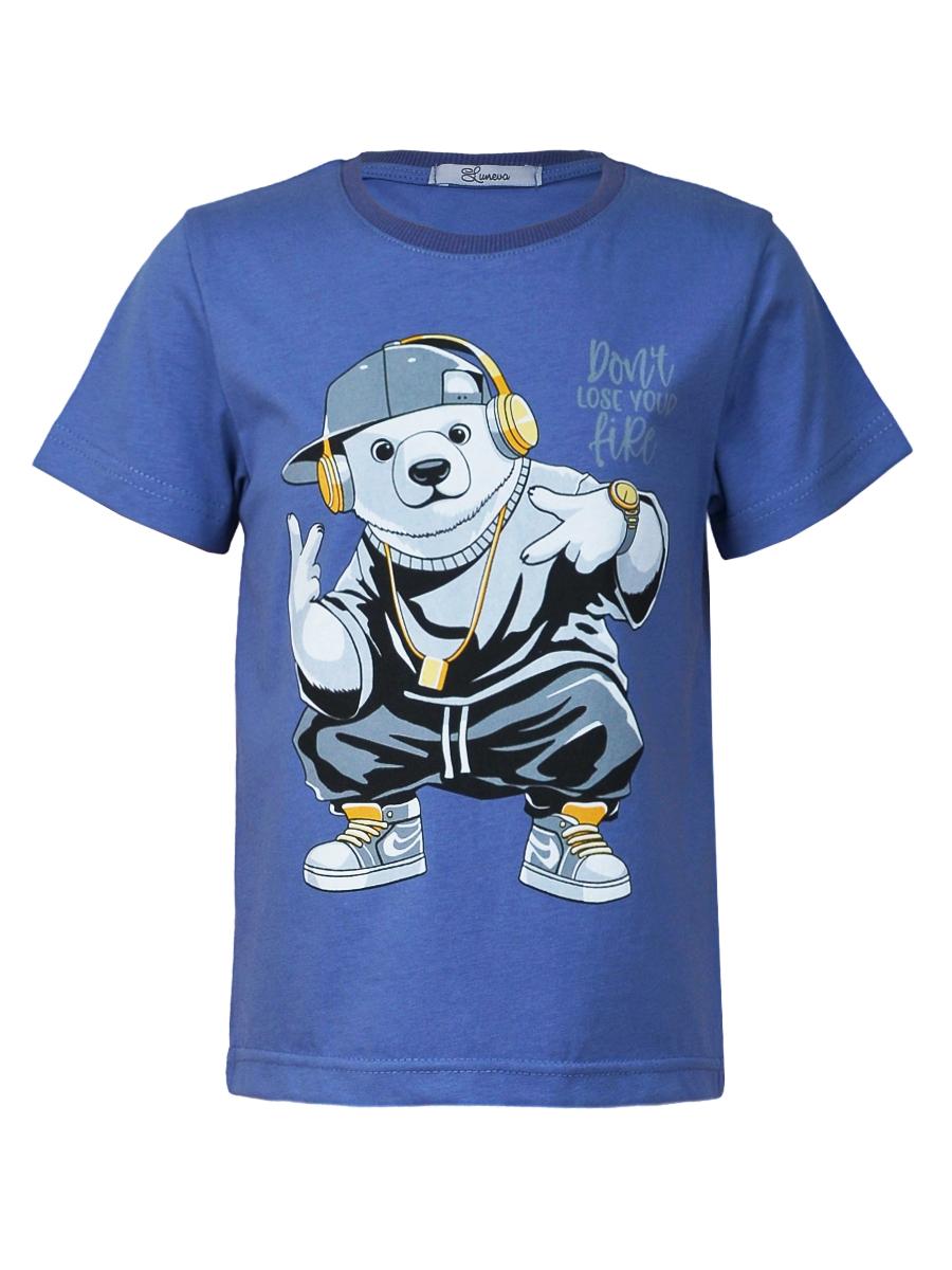 Кулирное полотно:100% х/б. Футболка-прямой силуэт,перед с печатью,рукав втачной короткий.Горловина обработана ластиком.Низ изделия и рукава подшиты.