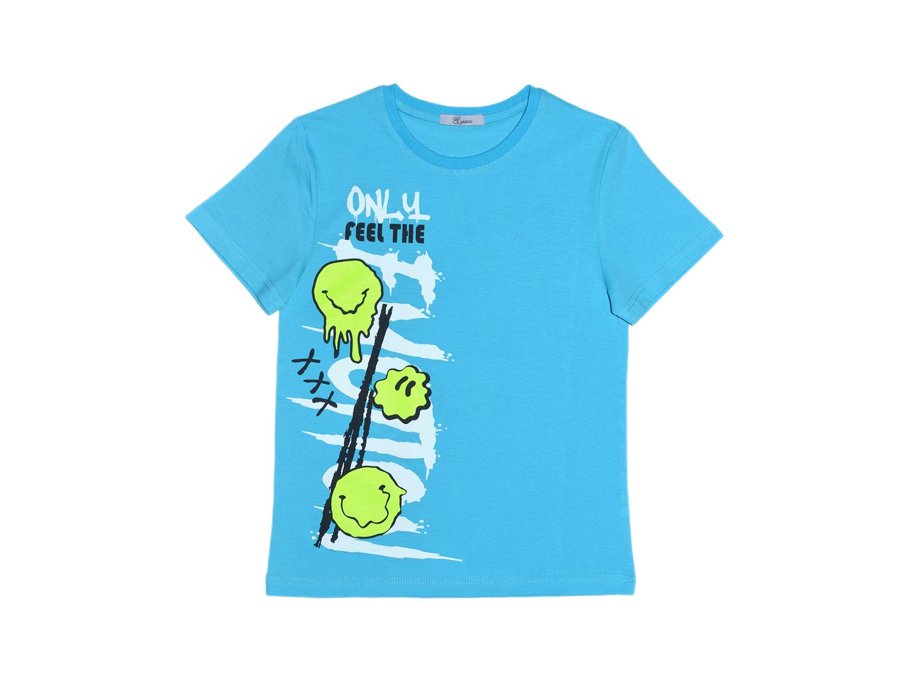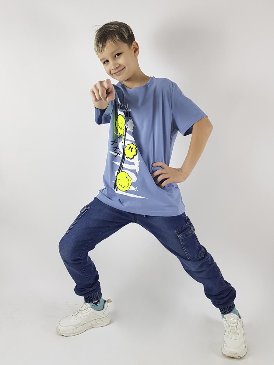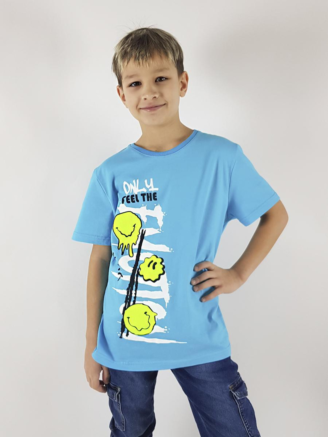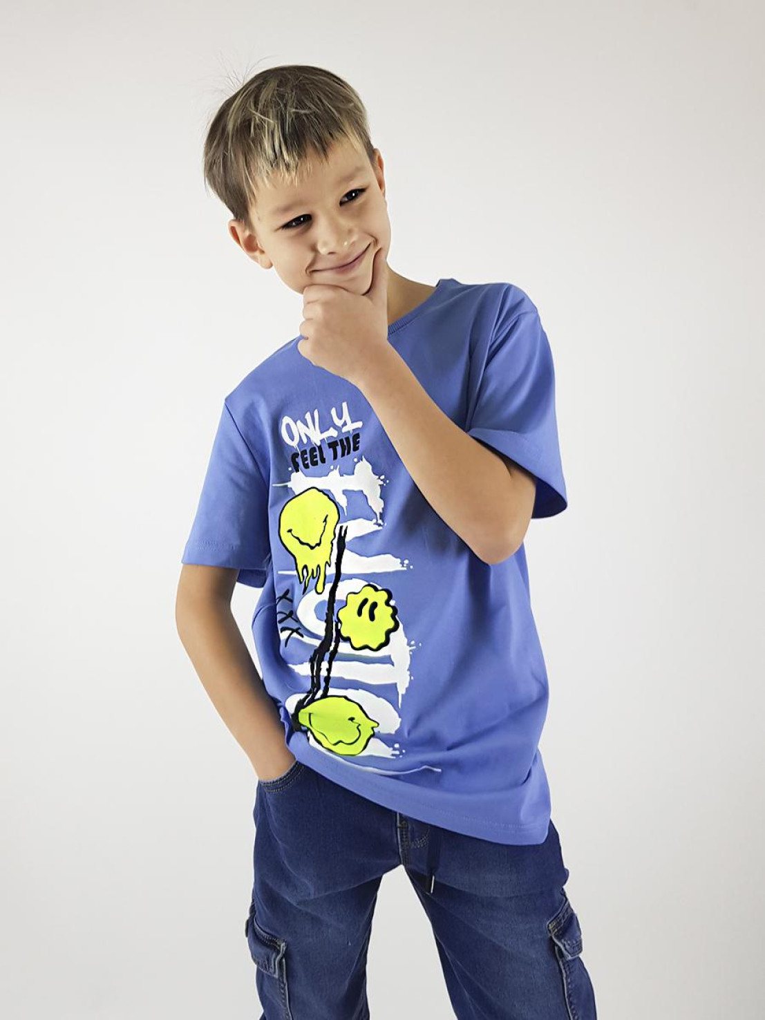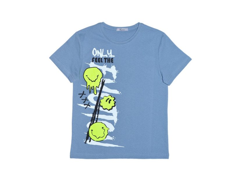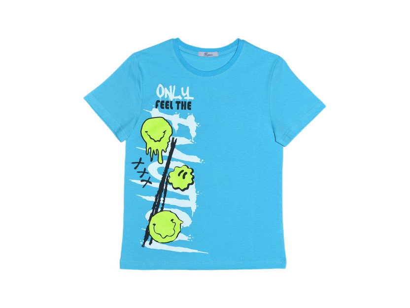 Кулирное полотно: 100% х/б. Футболка-прямой силуэт,перед и спинка с печатью,рукав втачной короткий.Горловина обработана ластиком.Низ изделия и рукава подшиты.