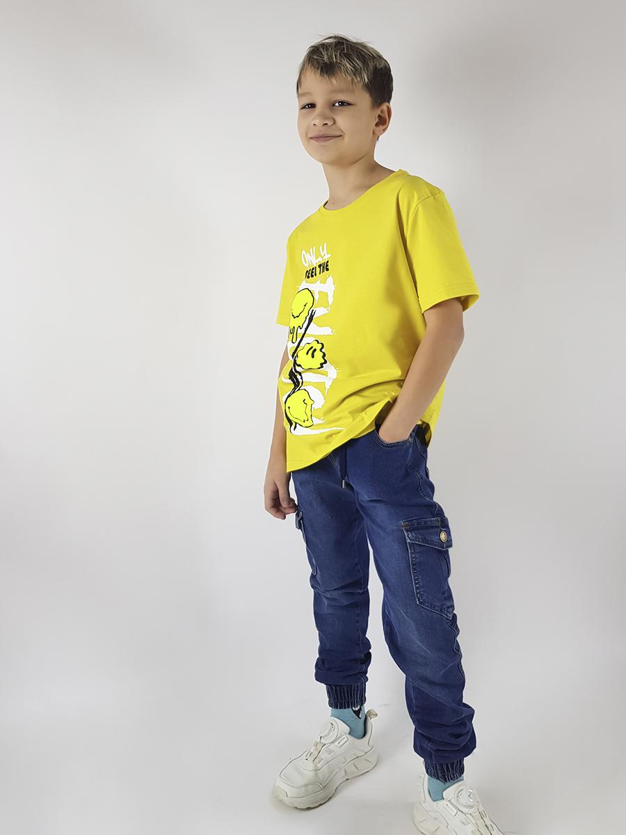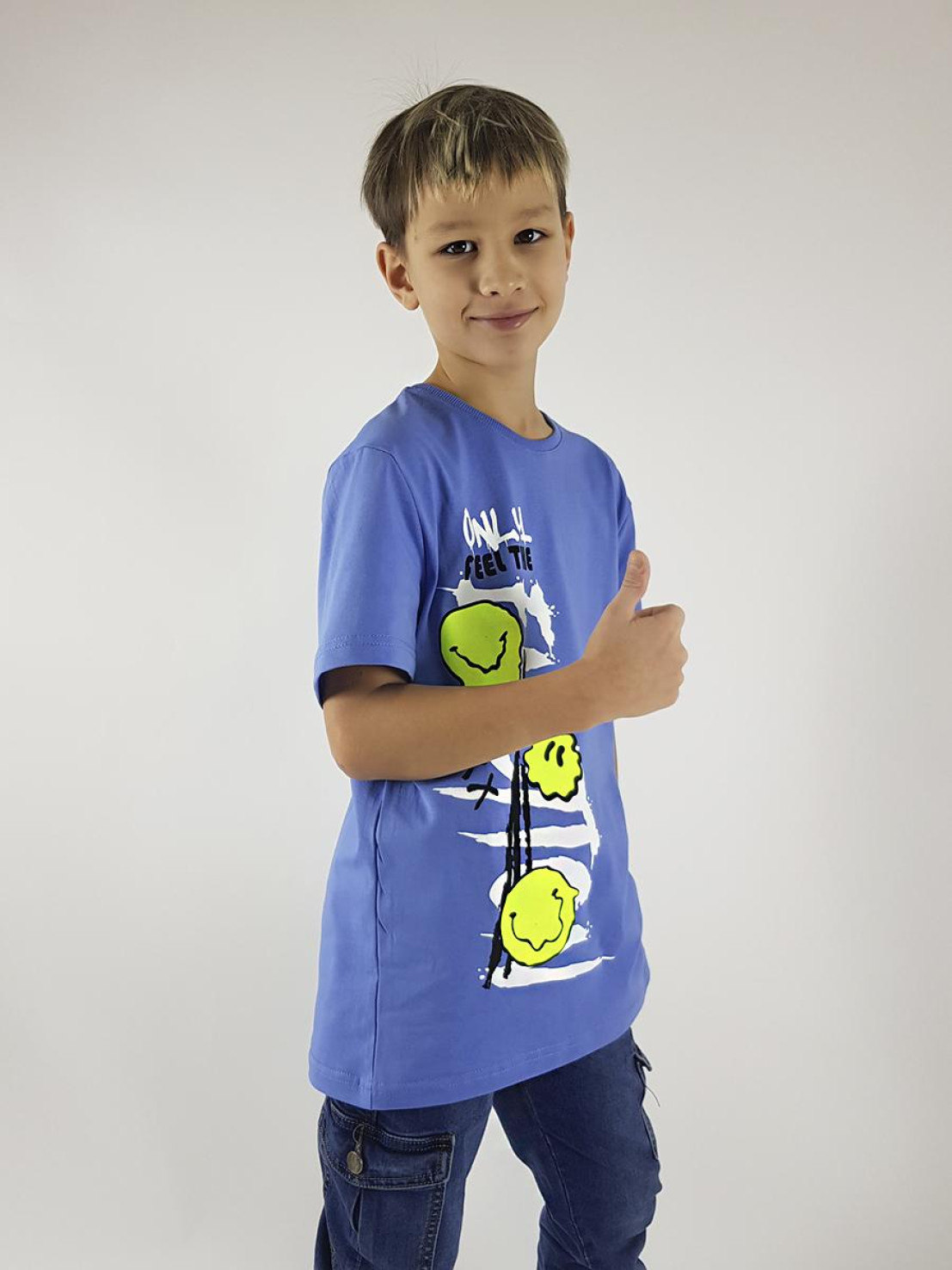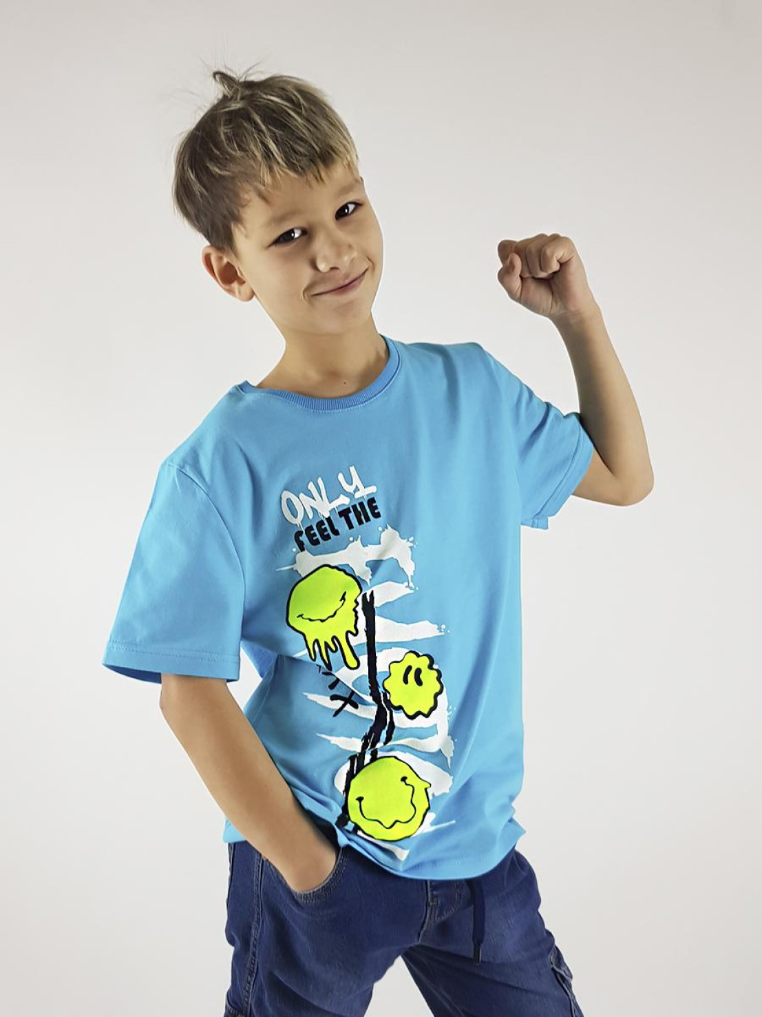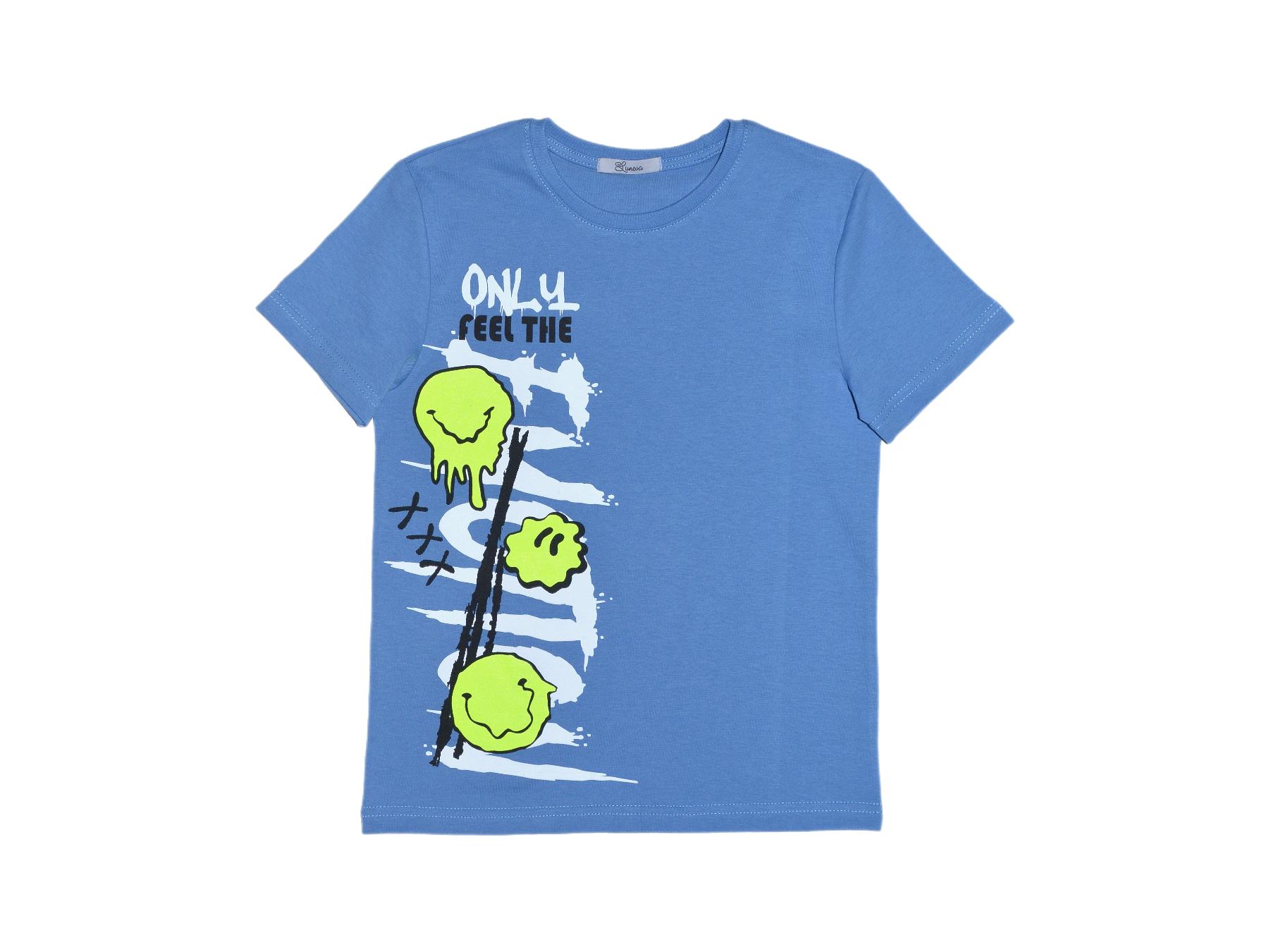 Кулирное полотно: 100% х/б. Футболка-прямой силуэт,перед и спинка с печатью,рукав втачной короткий.Горловина обработана ластиком.Низ изделия и рукава подшиты.
