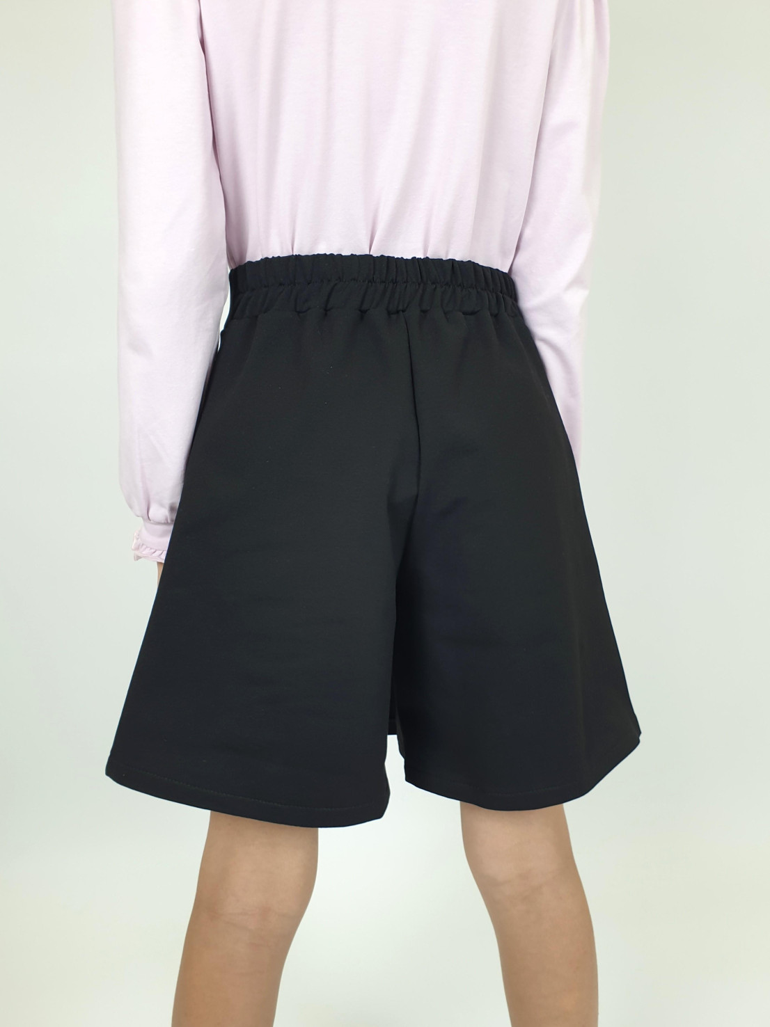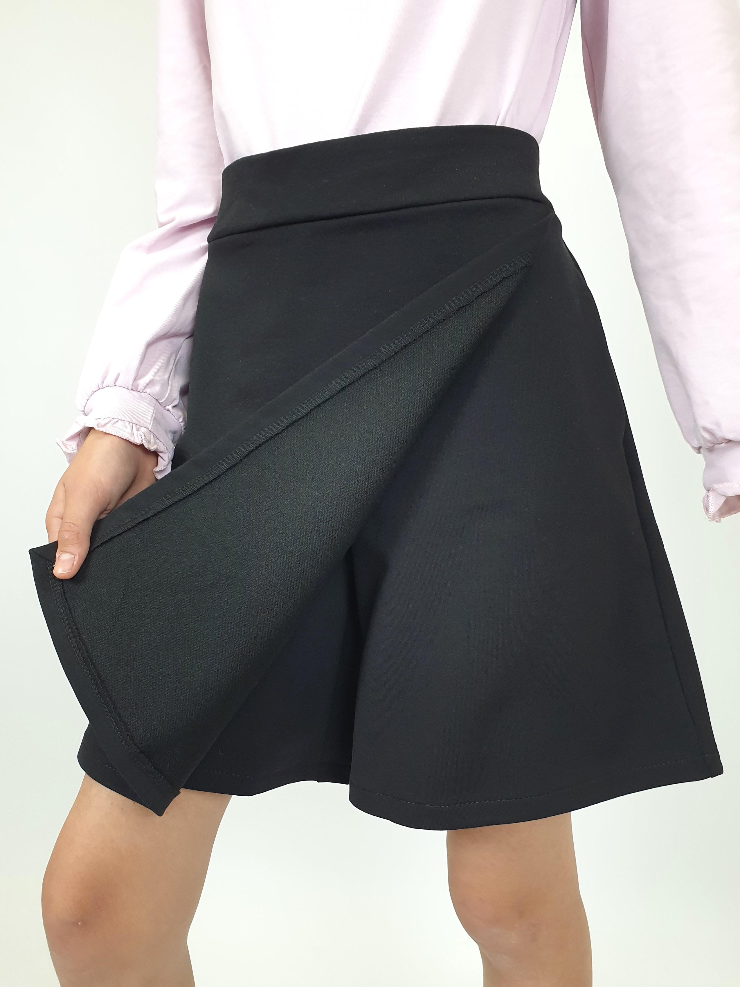 Футер двух-нитка:80% х/б,20% п/э.,цвет-черный. Юбка-шорты-длина до колена.Спереди выполнен справа на лево запах. Притачной пояс,сзади с резинкой.