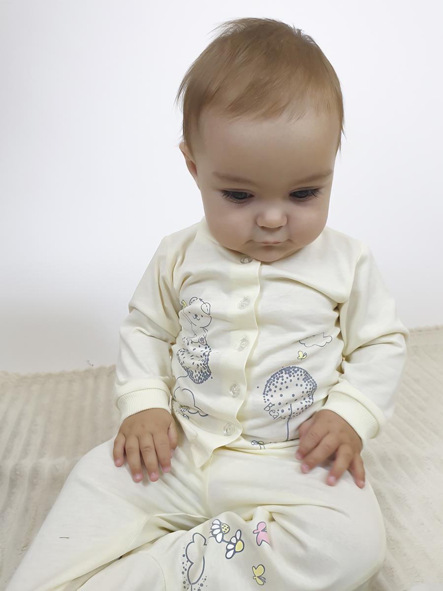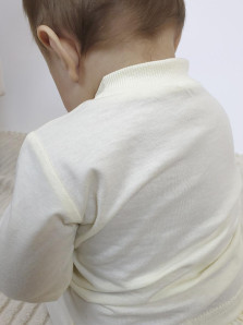 Кулирное полотно: 100% х/б. Кофточка-застежка центральная по переду на кнопки (пуговицы).Рукав длинный.Горловина,низ рукава обработаны ластиком.Низ изделия подшит.Перед с печатью.