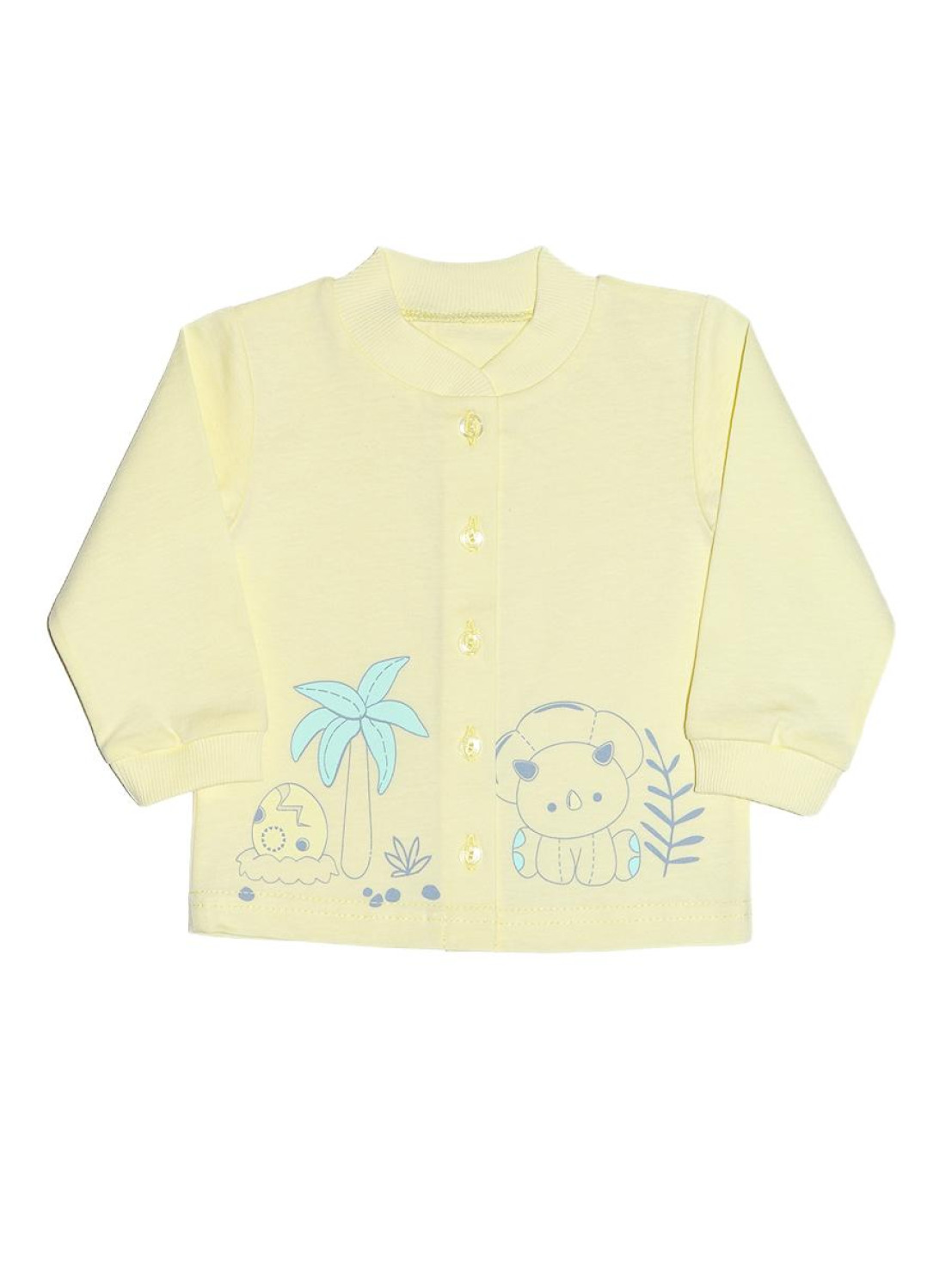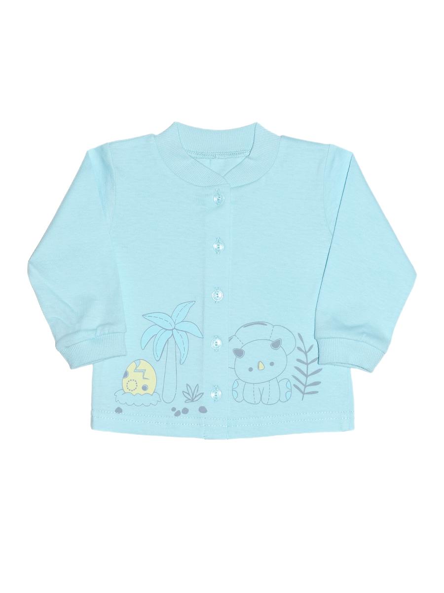 Кулирное полотно: 100% х/б. Кофточка-застежка центральная по переду на кнопки (пуговицы).Рукав длинный.Горловина,низ рукава обработаны ластиком.Низ изделия подшит.Перед с печатью.