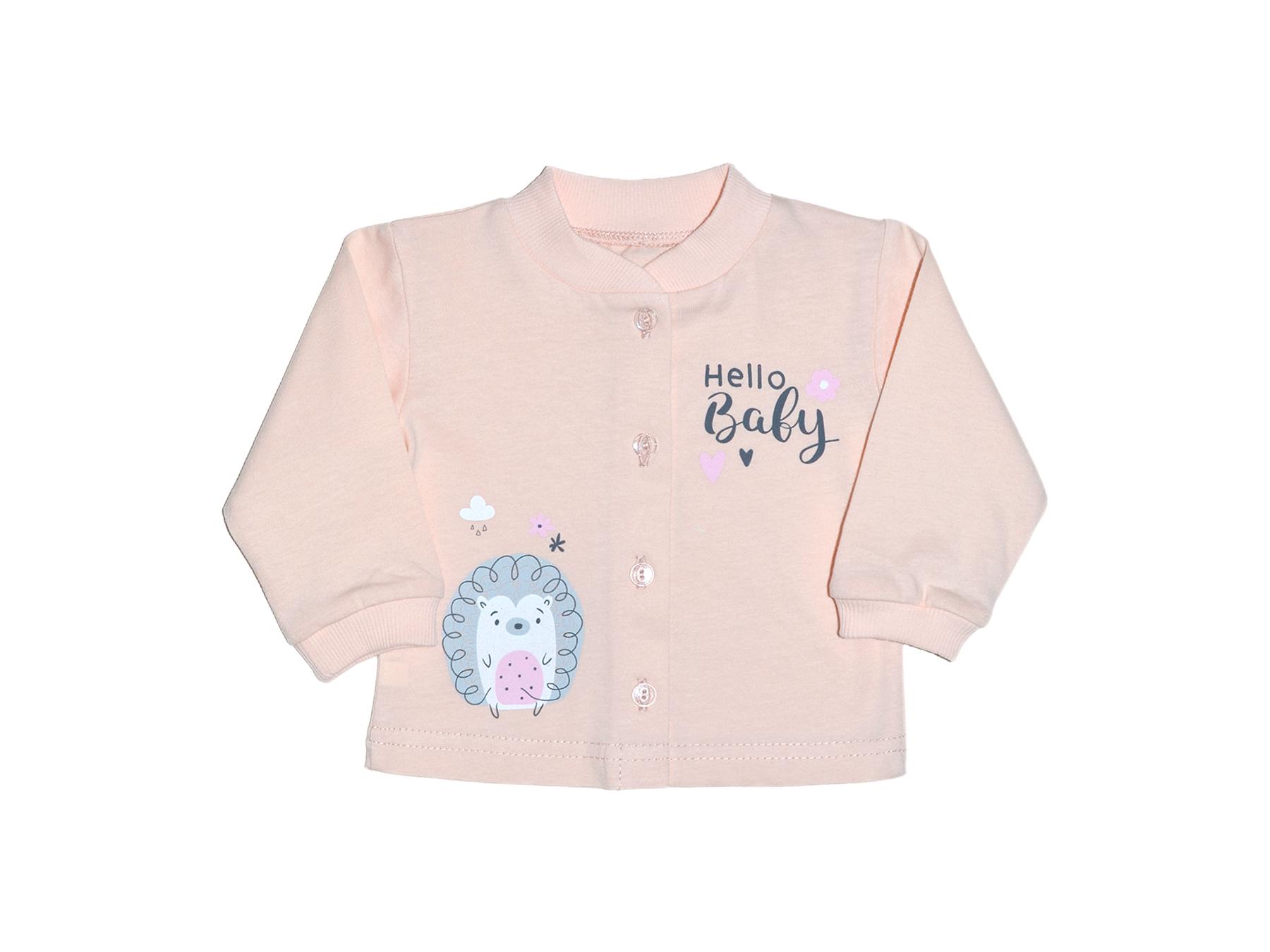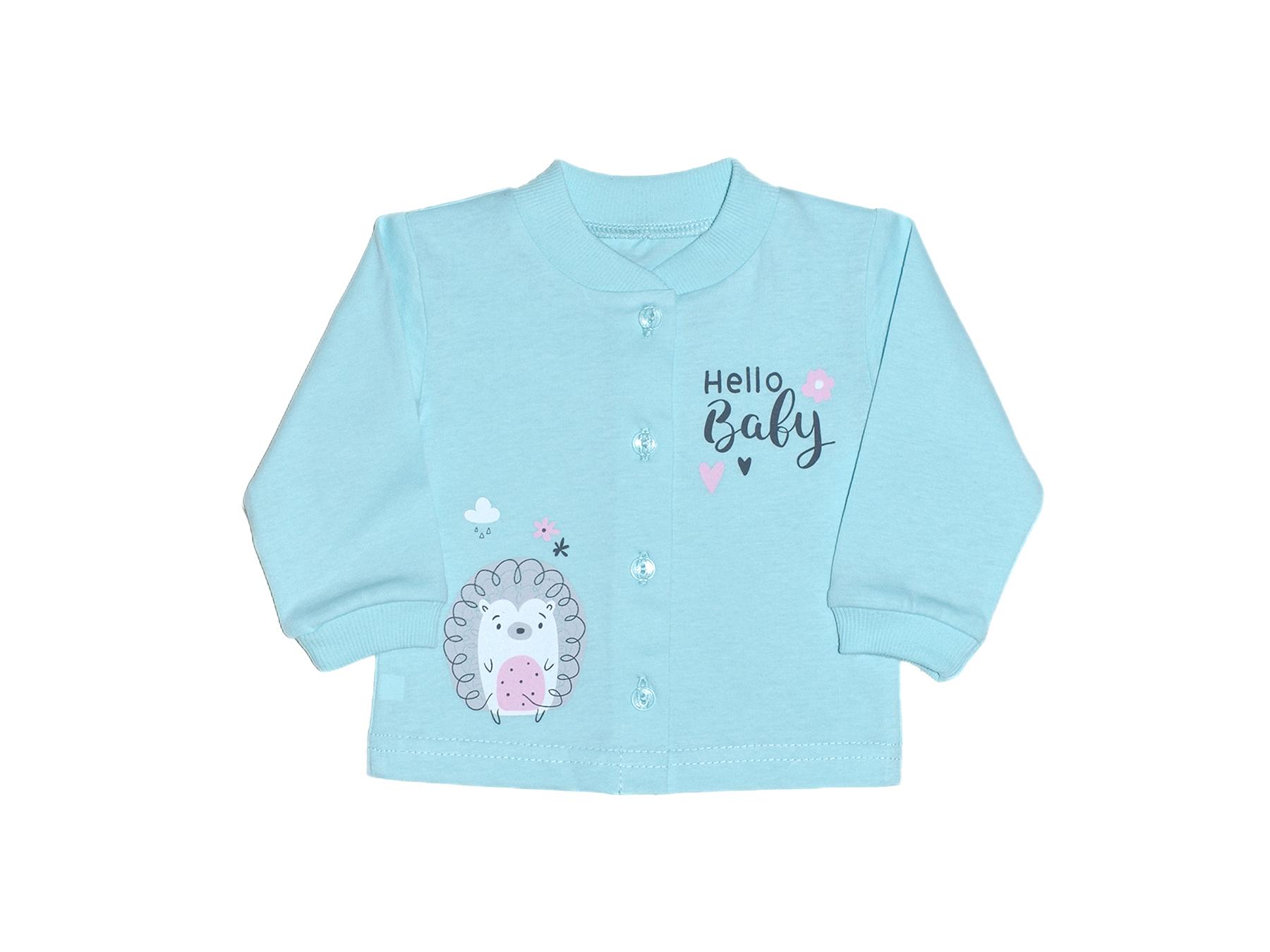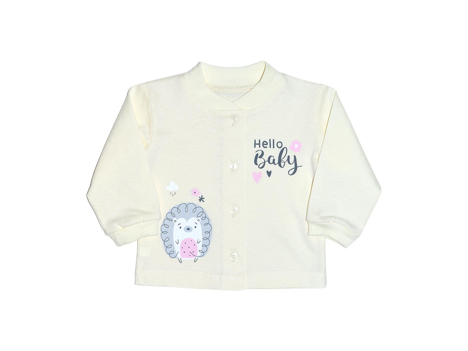 Кулирное полотно: 100% х/б. Кофточка-застежка центральная по переду на кнопки (пуговицы).Рукав длинный.Горловина,низ рукава обработаны ластиком.Низ изделия подшит.Перед с печатью.