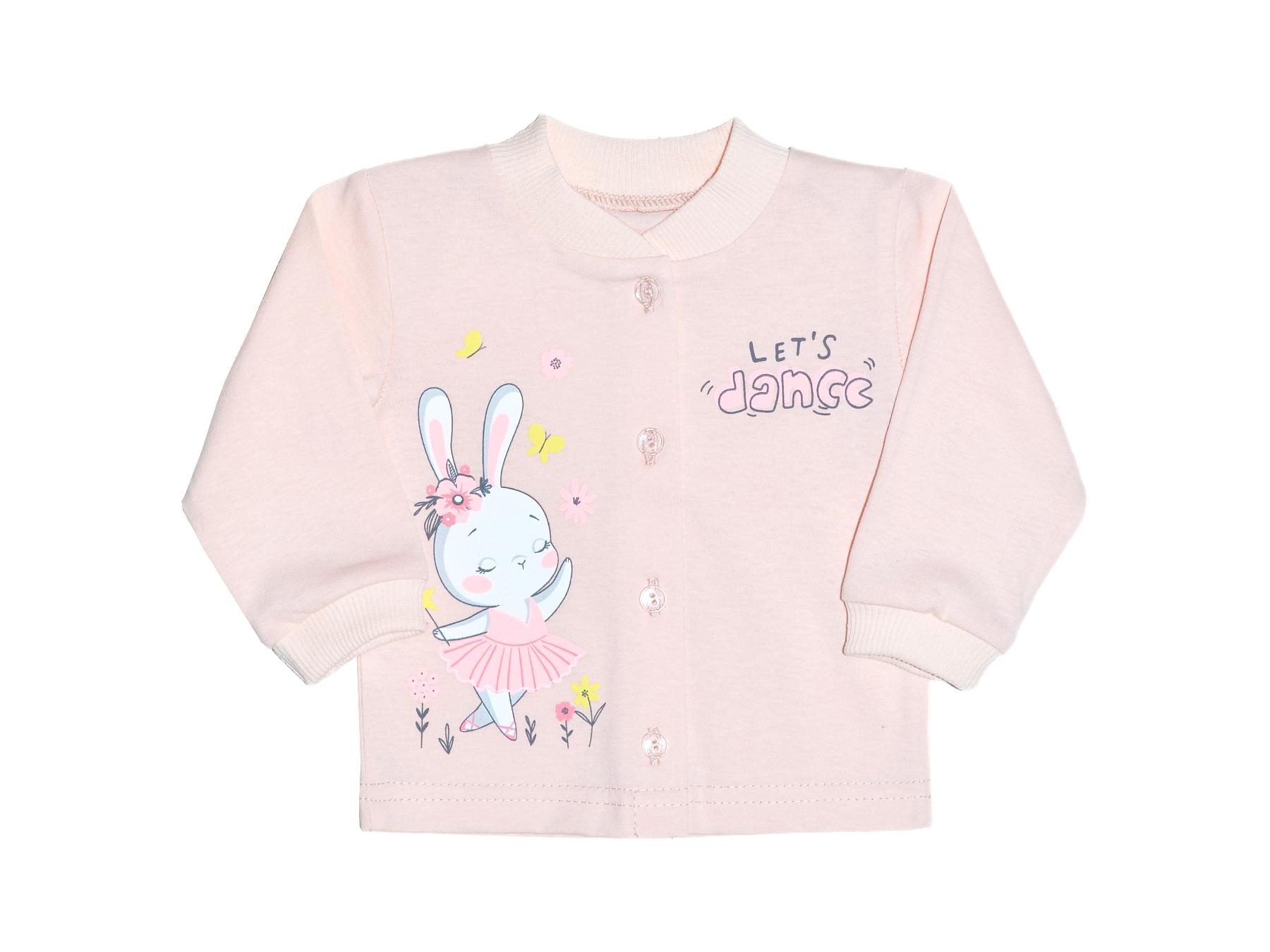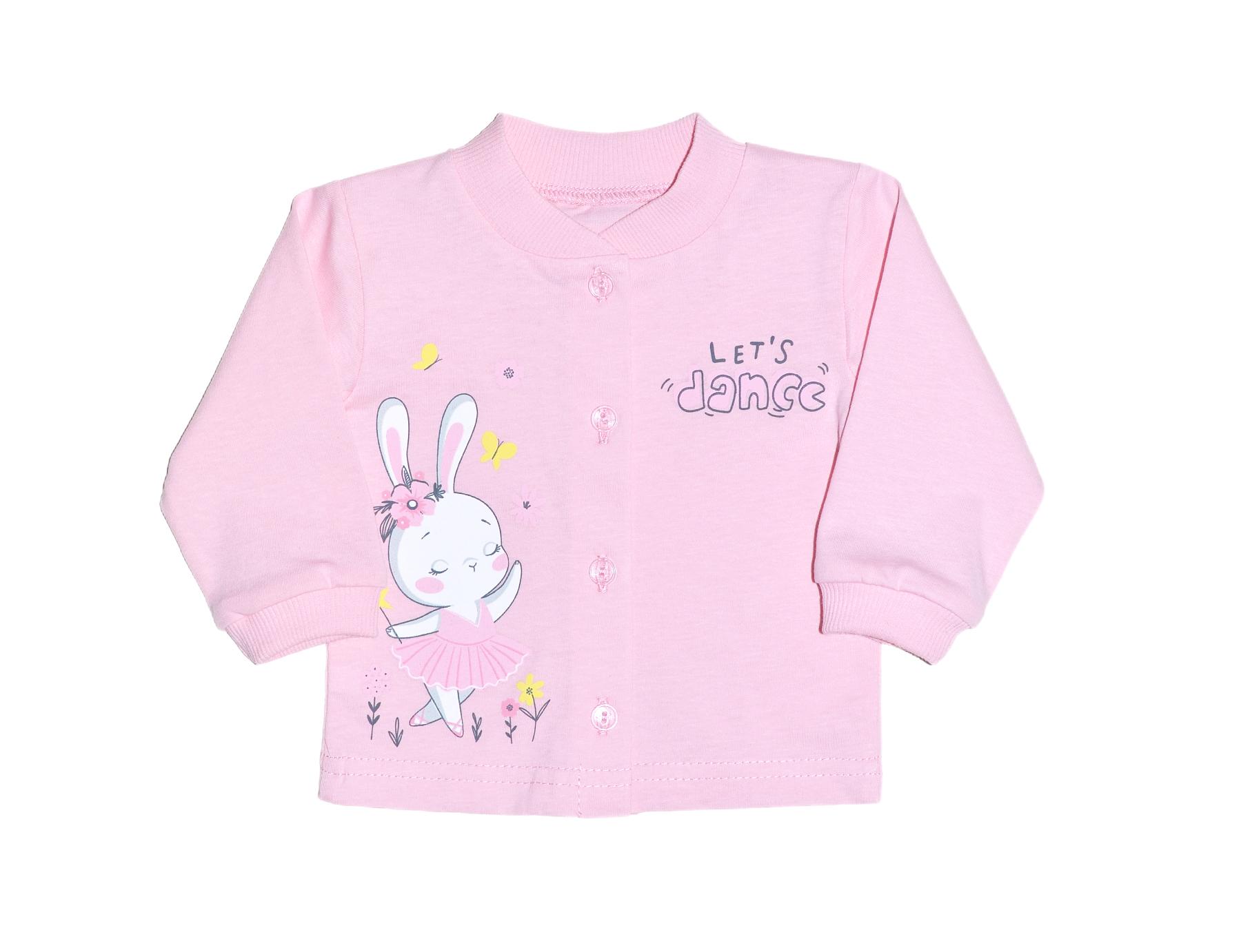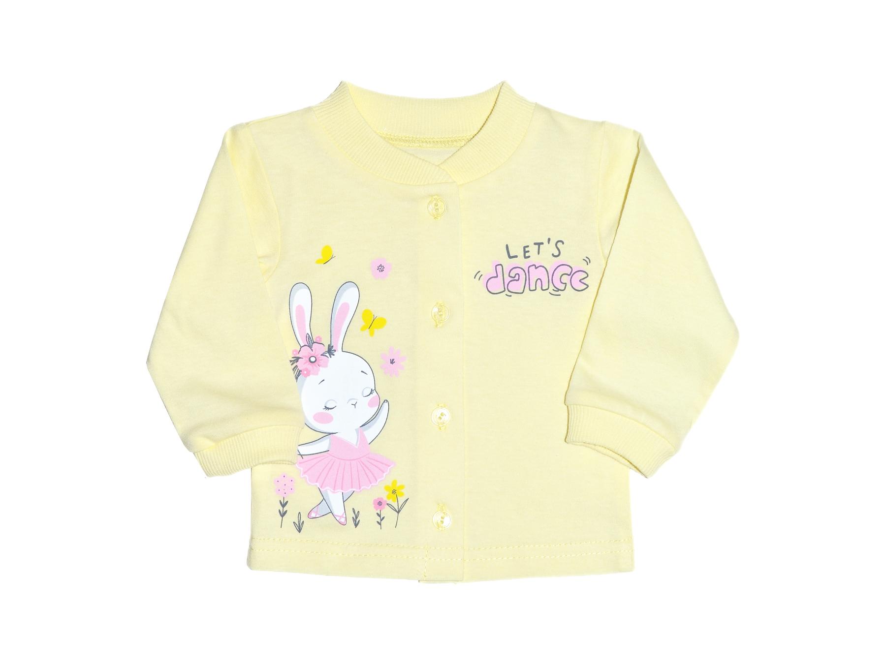 Кулирное полотно:100% х/б. Кофточка-застежка центральная по переду на кнопки(пуговицы).Рукав длинный.Горловина,низ рукава обработаны ластиком.Низ изделия подшит.Перед с печатью.