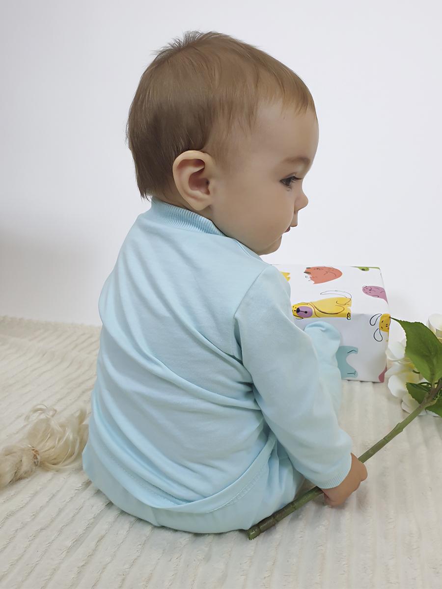 Кулирное полотно: 100% х/б. Кофточка-застежка центральная по переду на кнопки (пуговицы).Рукав длинный.Горловина,низ рукава обработаны ластиком.Низ изделия подшит.Перед с печатью.