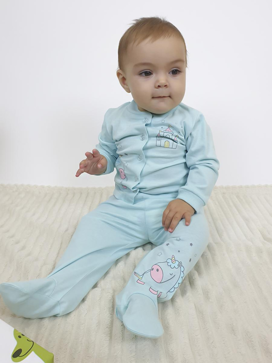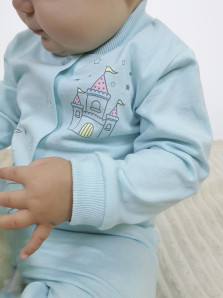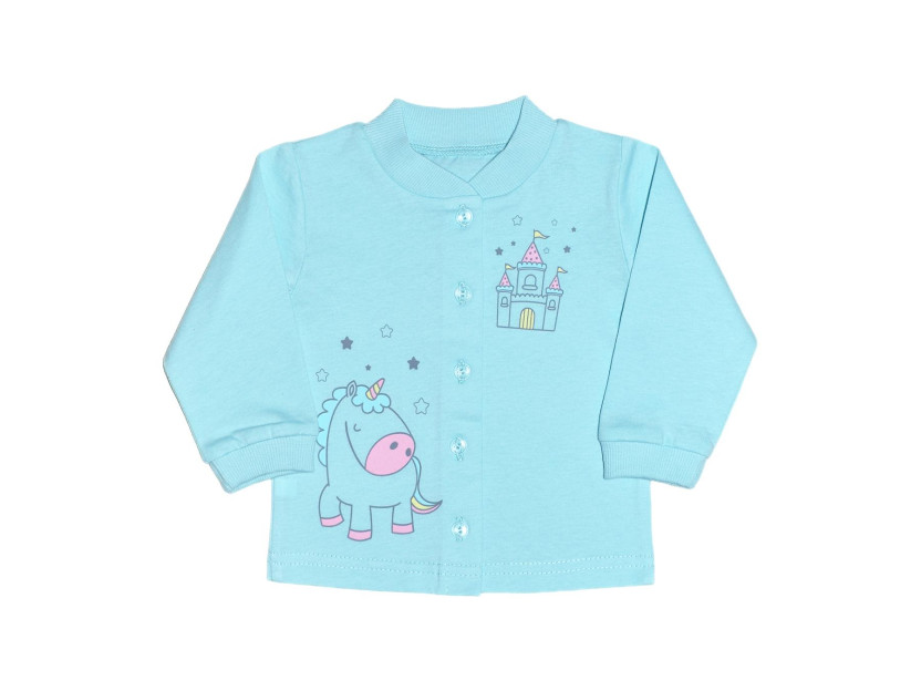 Кулирное полотно: 100% х/б. Кофточка-застежка центральная по переду на кнопки (пуговицы).Рукав длинный.Горловина,низ рукава обработаны ластиком.Низ изделия подшит.Перед с печатью.