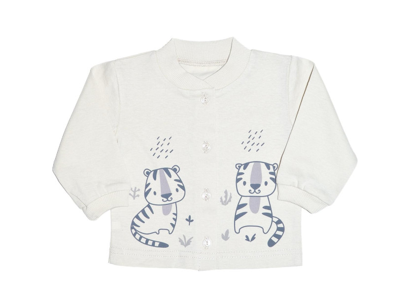 Кулирное полотно: 100% х/б. Кофточка-застежка центральная по переду на кнопки(пуговицы).Рукав длинный.Горловина,низ рукава обработаны ластиком.Низ изделия подшит.Перед с печатью.