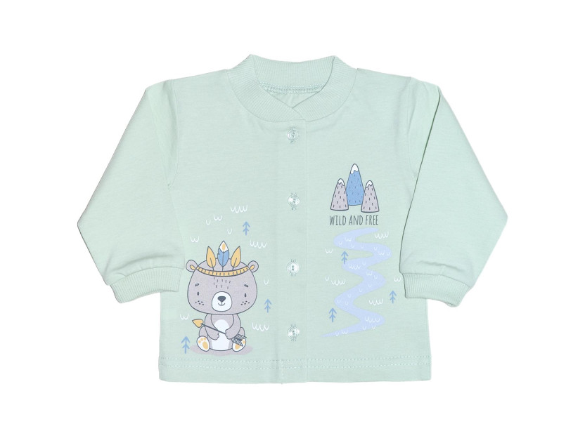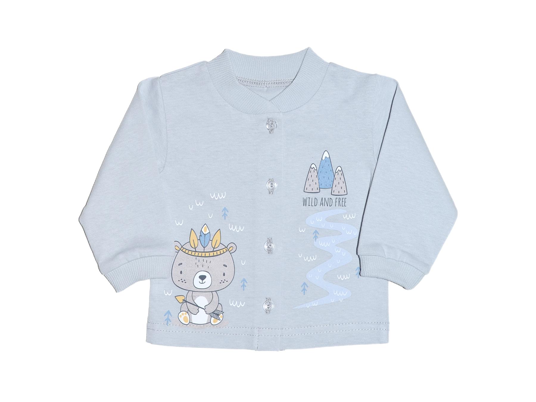 Кулирное полотно: 100% х/б. Кофточка-застежка центральная по переду на кнопки (пуговицы).Рукав длинный.Горловина,низ рукава обработаны ластиком.Низ изделия подшит.Перед с печатью.