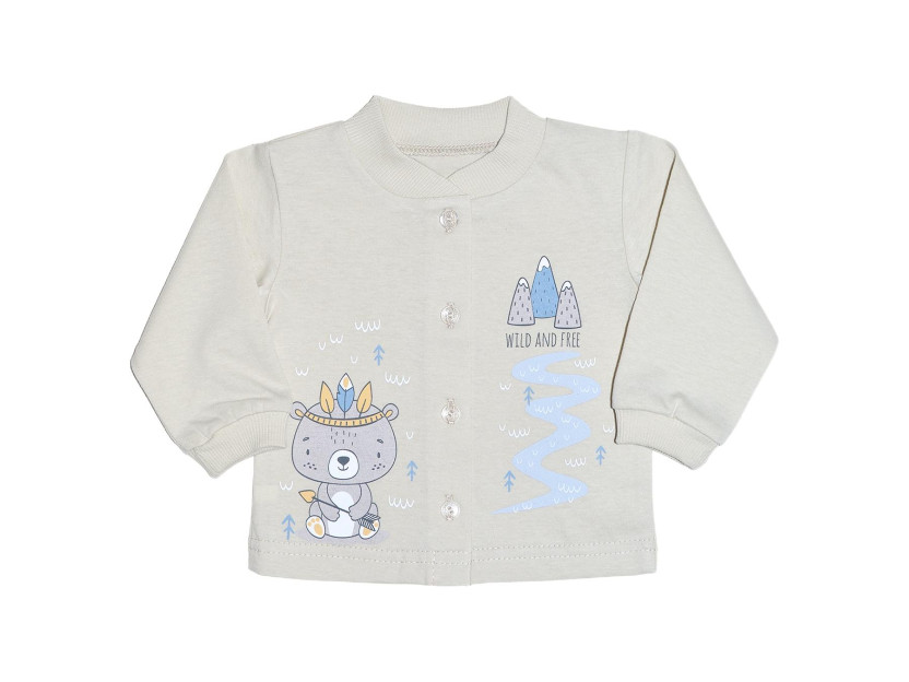Кулирное полотно: 100% х/б. Кофточка-застежка центральная по переду на кнопки (пуговицы).Рукав длинный.Горловина,низ рукава обработаны ластиком.Низ изделия подшит.Перед с печатью.