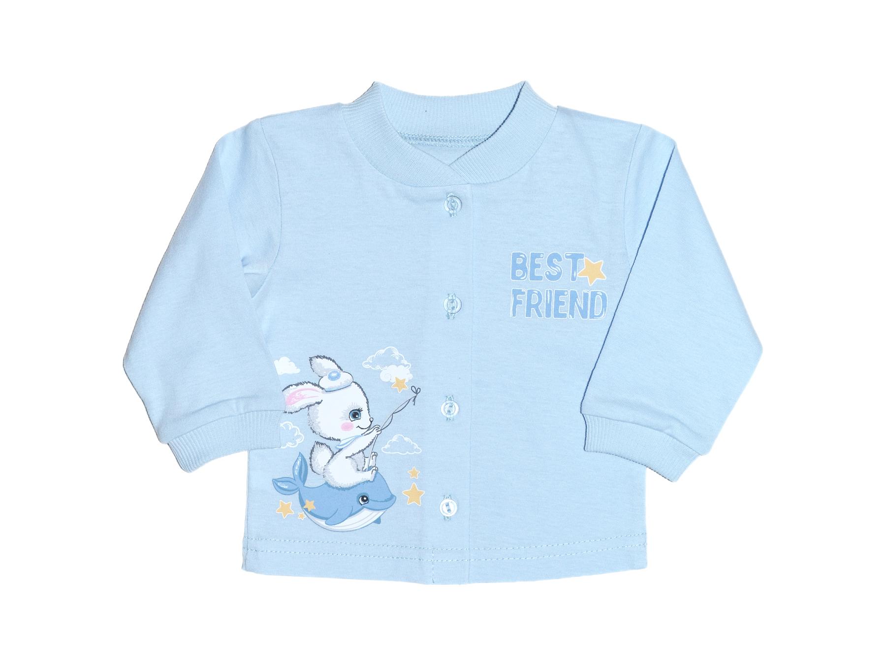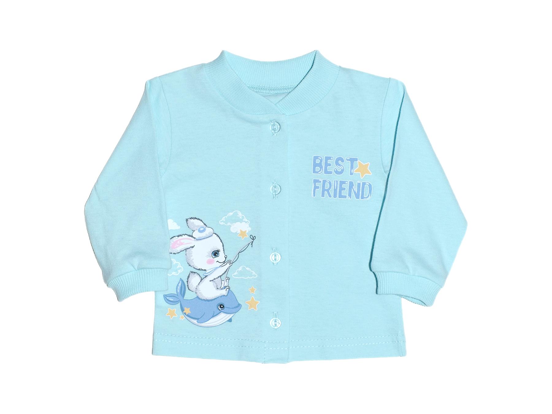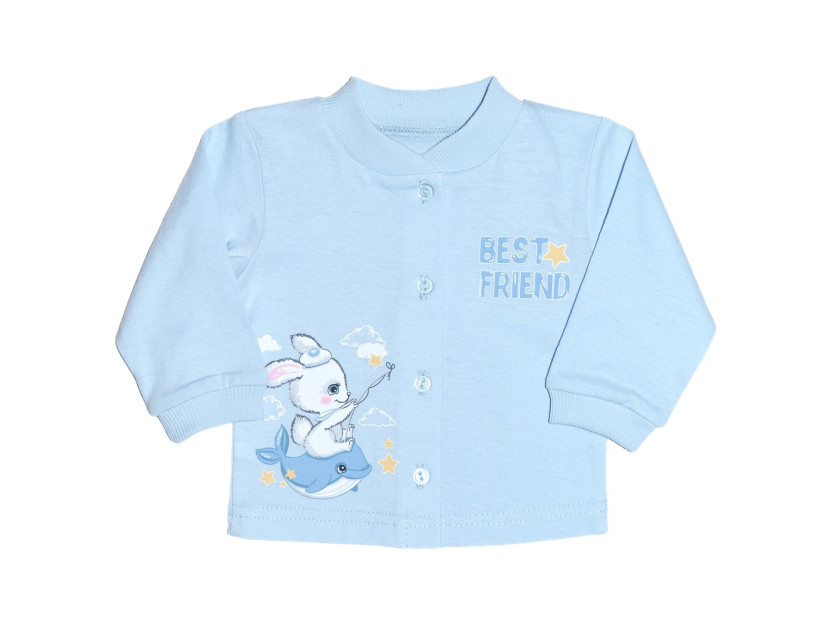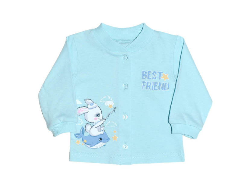 Кулирное полотно:100% х/б. Кофточка-застежка центральная по переду на кнопки(пуговицы).Рукав длинный.Горловина,низ рукава обработаны ластиком.Низ изделия подшит.Перед с печатью.
