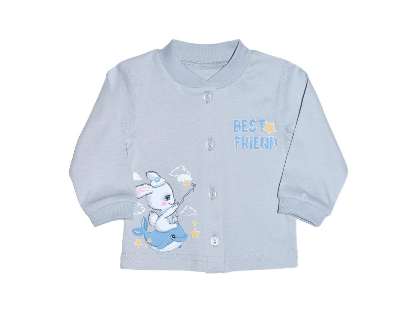 Кулирное полотно:100% х/б. Кофточка-застежка центральная по переду на кнопки(пуговицы).Рукав длинный.Горловина,низ рукава обработаны ластиком.Низ изделия подшит.Перед с печатью.