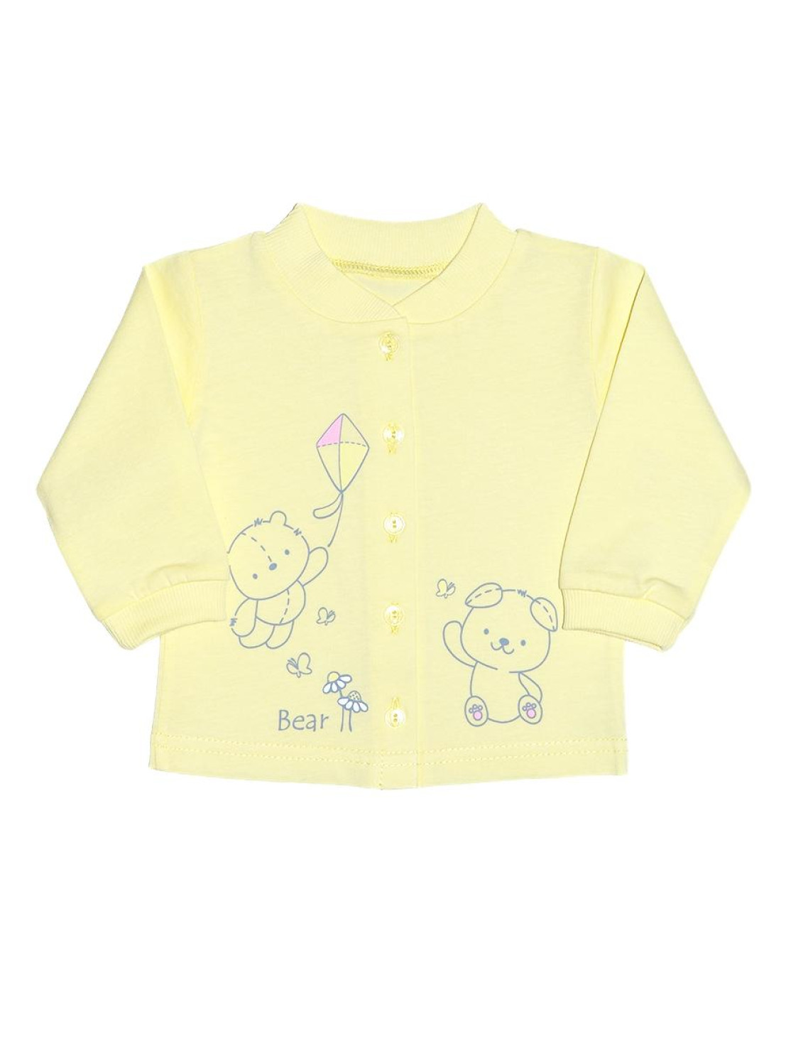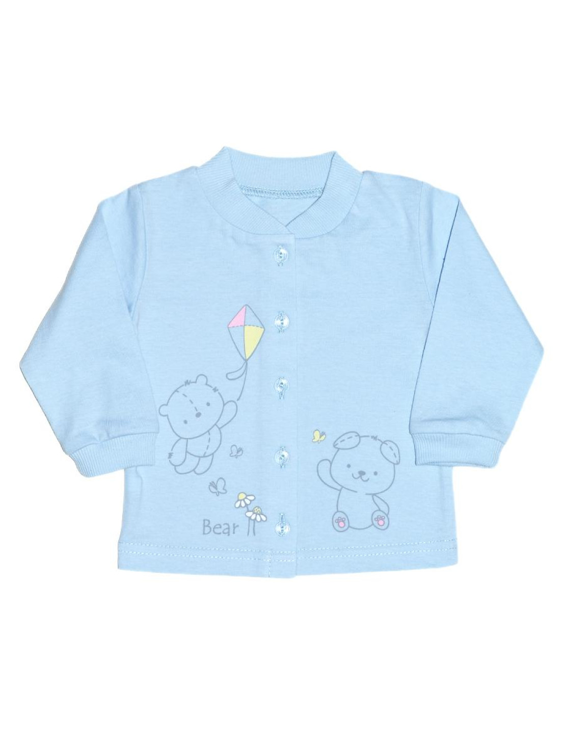 Кулирное полотно: 100% х/б. Кофточка-застежка центральная по переду на кнопки (пуговицы).Рукав длинный.Горловина,низ рукава обработаны ластиком.Низ изделия подшит.Перед с печатью.