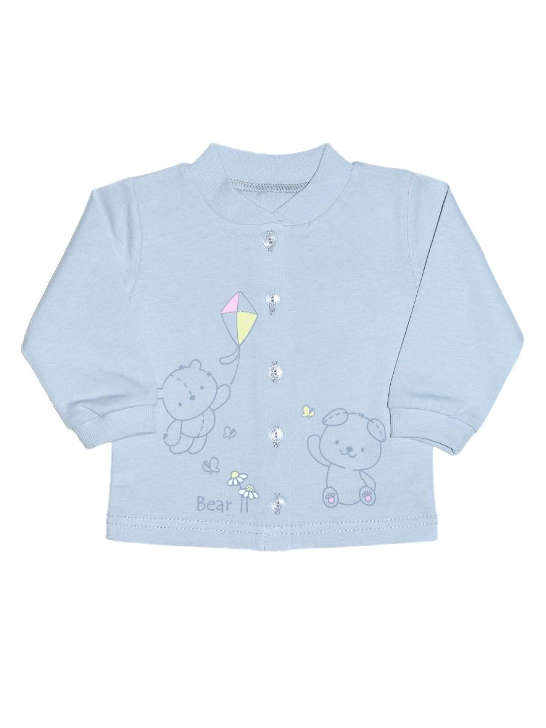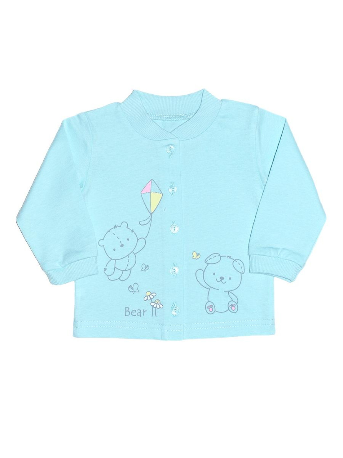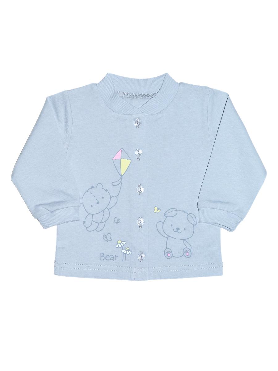 Кулирное полотно: 100% х/б. Кофточка-застежка центральная по переду на кнопки (пуговицы).Рукав длинный.Горловина,низ рукава обработаны ластиком.Низ изделия подшит.Перед с печатью.
