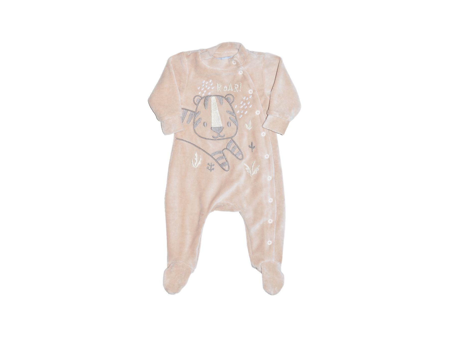 Велюр:80% х/б,20% п/э. Комбинезон-правая сторона переда с вышивкой.Рукав втачной длинный на манжете,в горловине воротник-стойка.Застежка ассиметричная на кнопки.