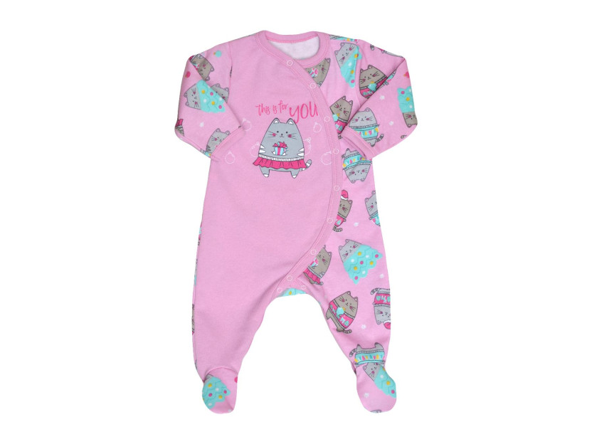 Футер: 100% х/б.Комбинезон-перед с ассиметричной застежкой и по шаговому шву на кнопки. Печать по переду. Рукав втачной, длинный. Борта, горловина и низ рукава окантованы.
